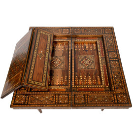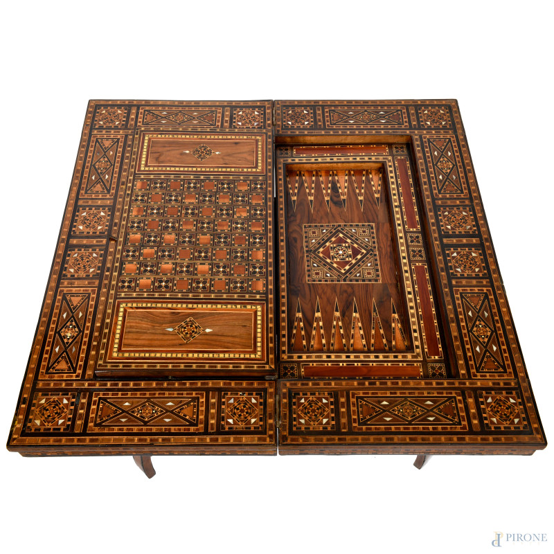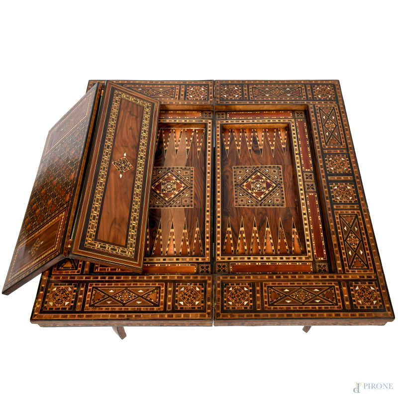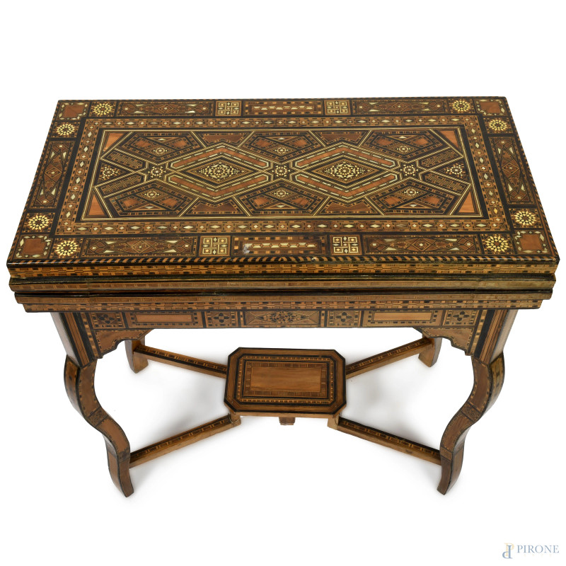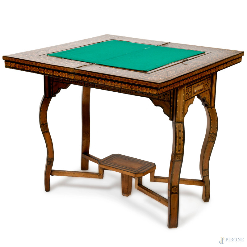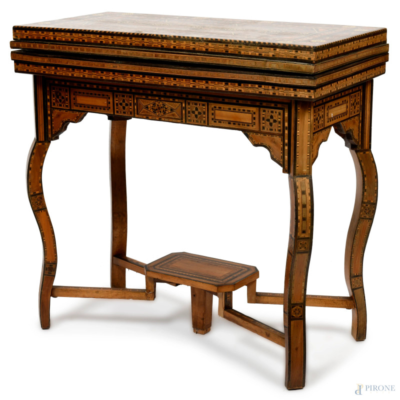 Tavolino da gioco riccamente intarsiato in varie essenze a motivi geometrici, XX secolo, cm 75x84x85 (aperto), cm 82x84x43 (chiuso), (segni di usura, scalfiture, piccole mancanze)