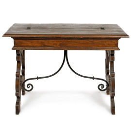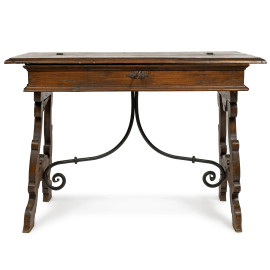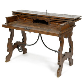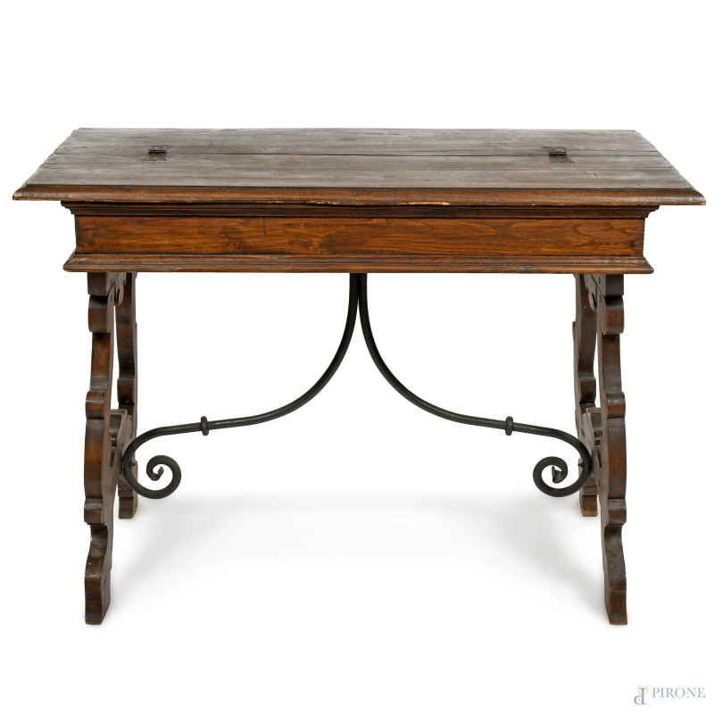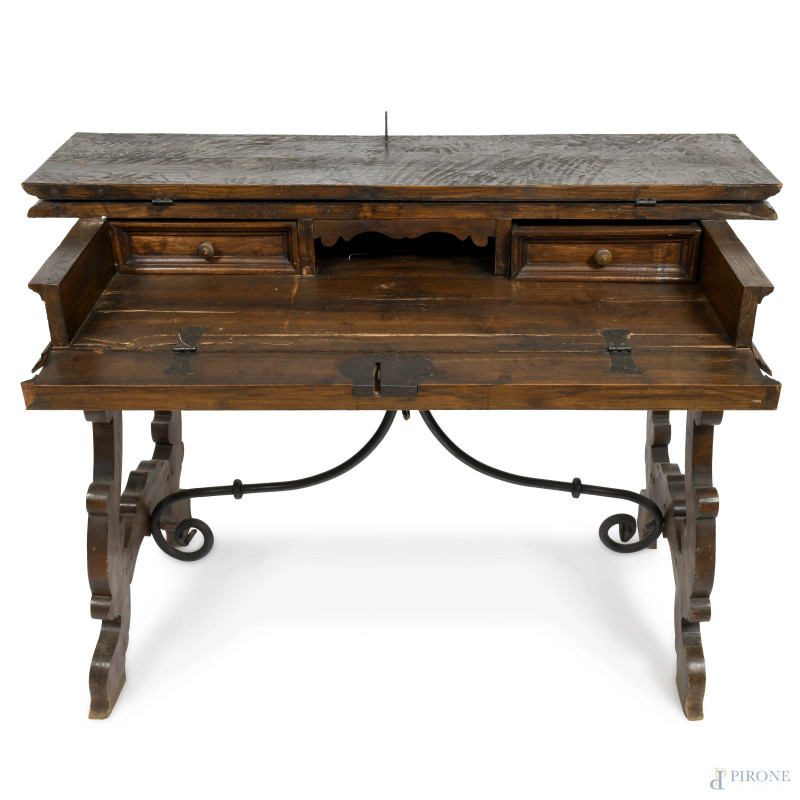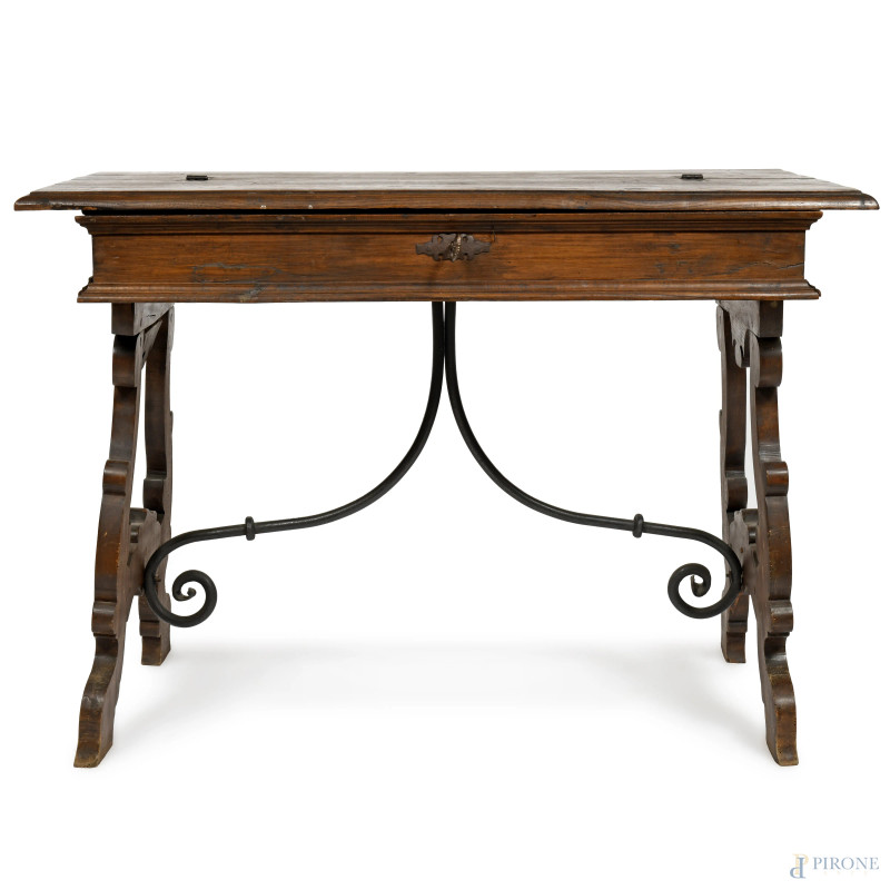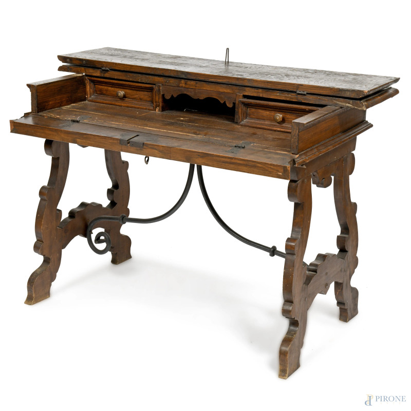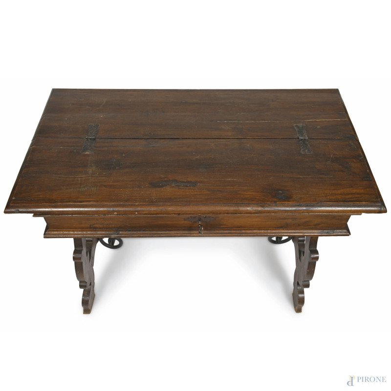 Tavolo scrittoio in noce in stile XVII secolo con piano apribile celante piano scrittoio e due cassetti centrale fiancheggiato da cassetti, gambe a lira raccodate da goppia voluta in ferro, cm 84x119x64, (difetti, mancanze, scalfiture, segni di usura)