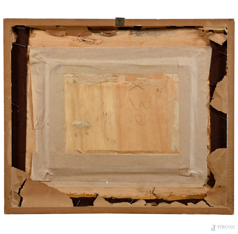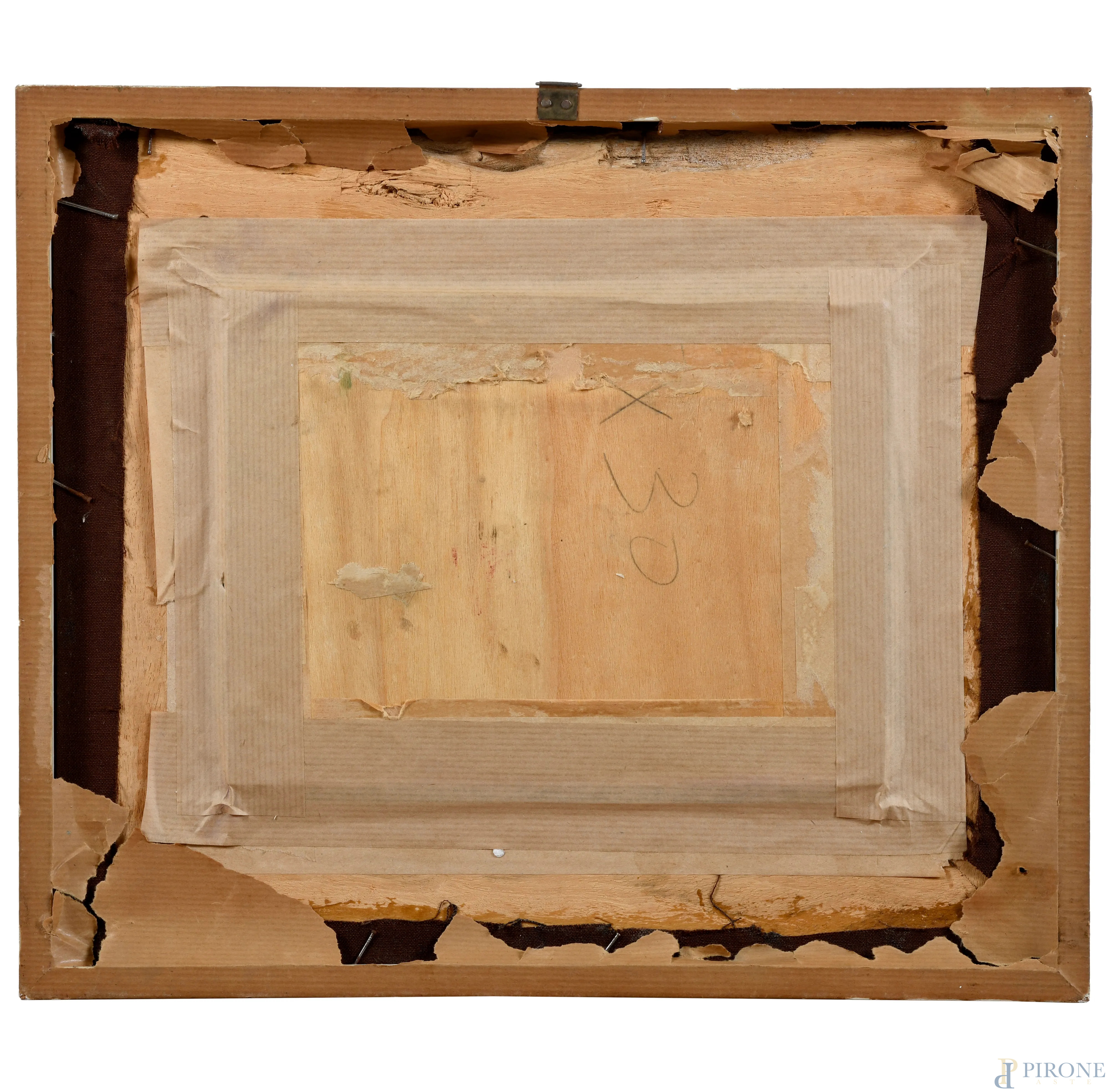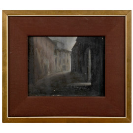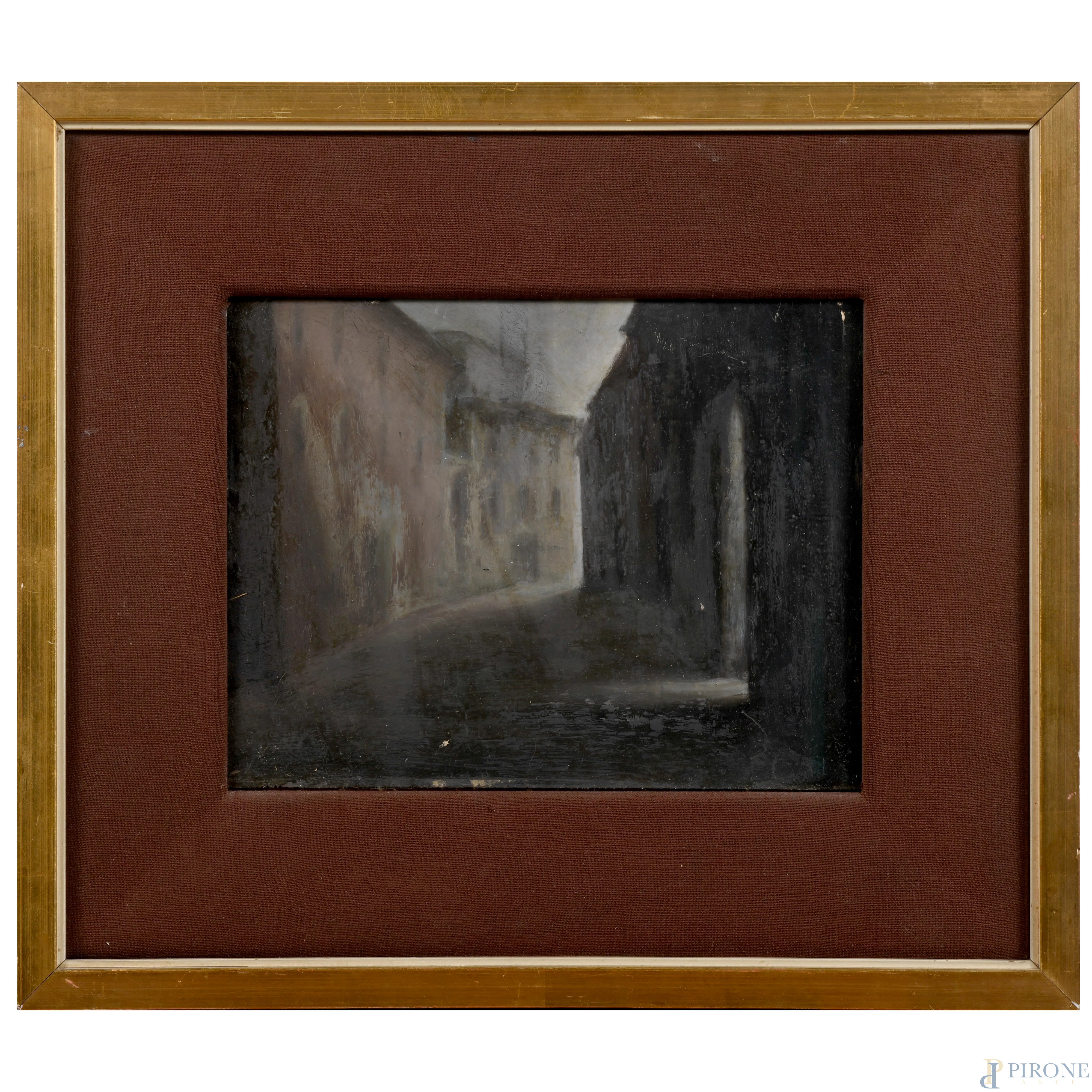 Tra i vicoli, XX secolo, olio su compensato, cm 18x24, entro cornice, (consunzione della superficie pittorica, piccole cadute di colore)