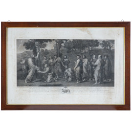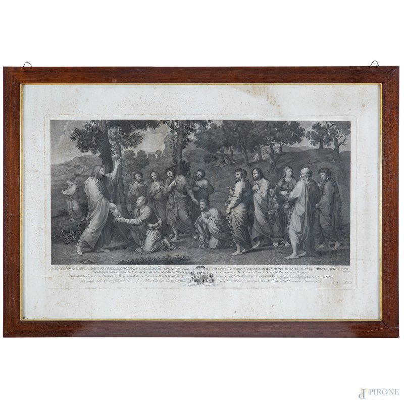 Tu es Petrus, XIX-XX secolo, incisione da Nicolas Poussin, cm 71x107 entro cornice, (umidità, ondulazioni, gore)