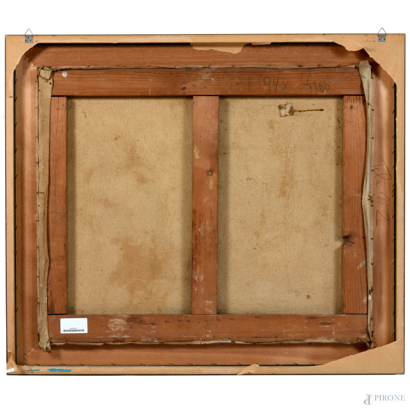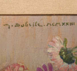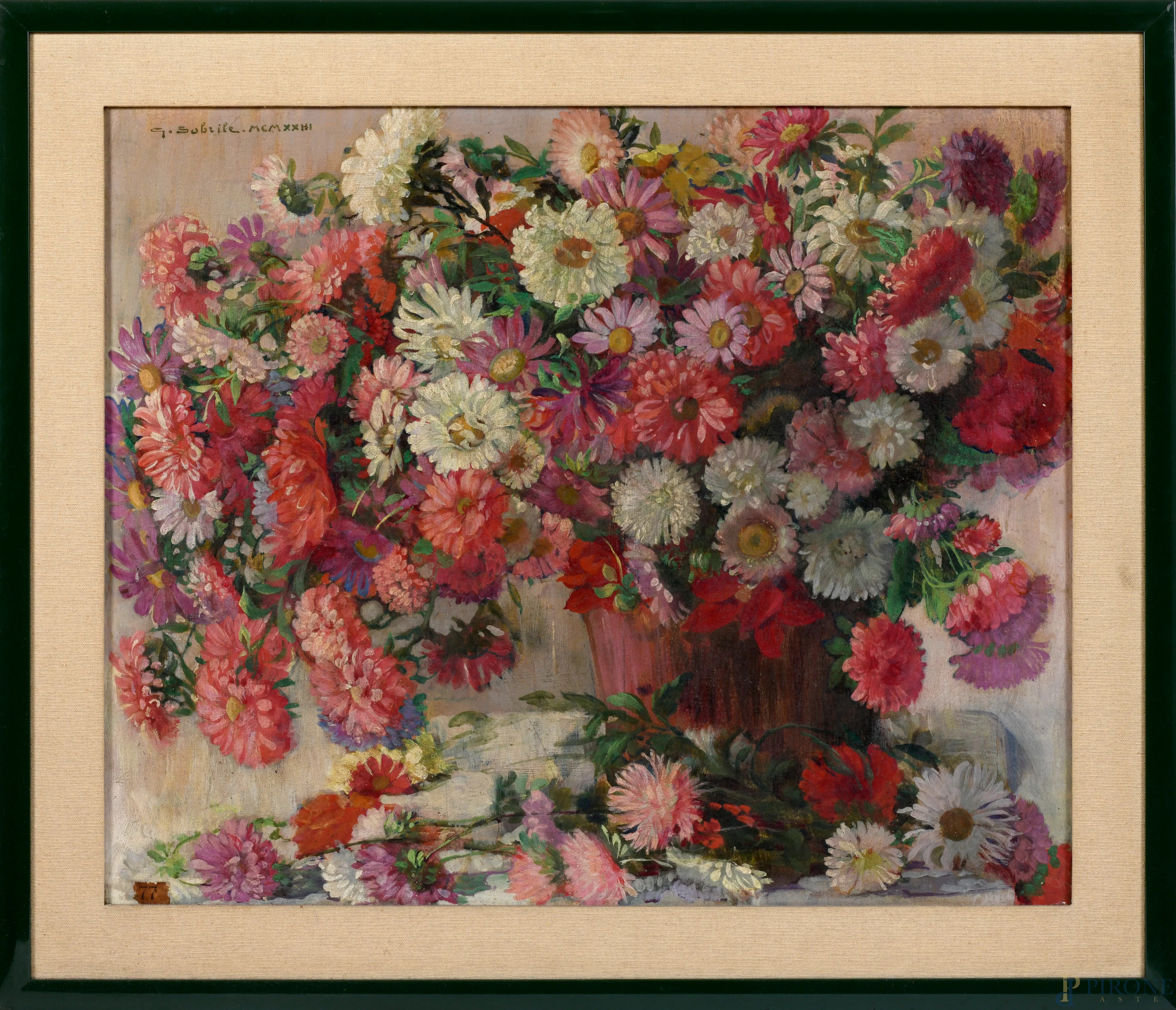 Vaso di fiori, XX secolo, olio su tela, cm 58x70, firmato e datato in numeri romani 1923 in alto a sinistra, entro cornice (etichetta applicata al margine in basso a sinistra della tela)