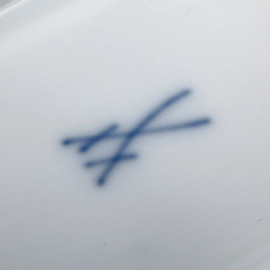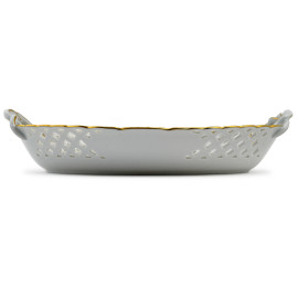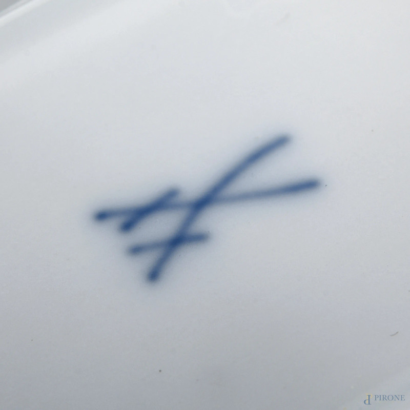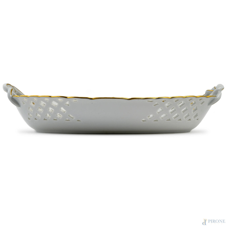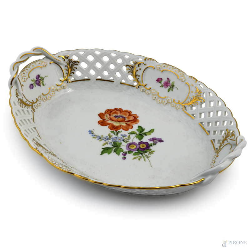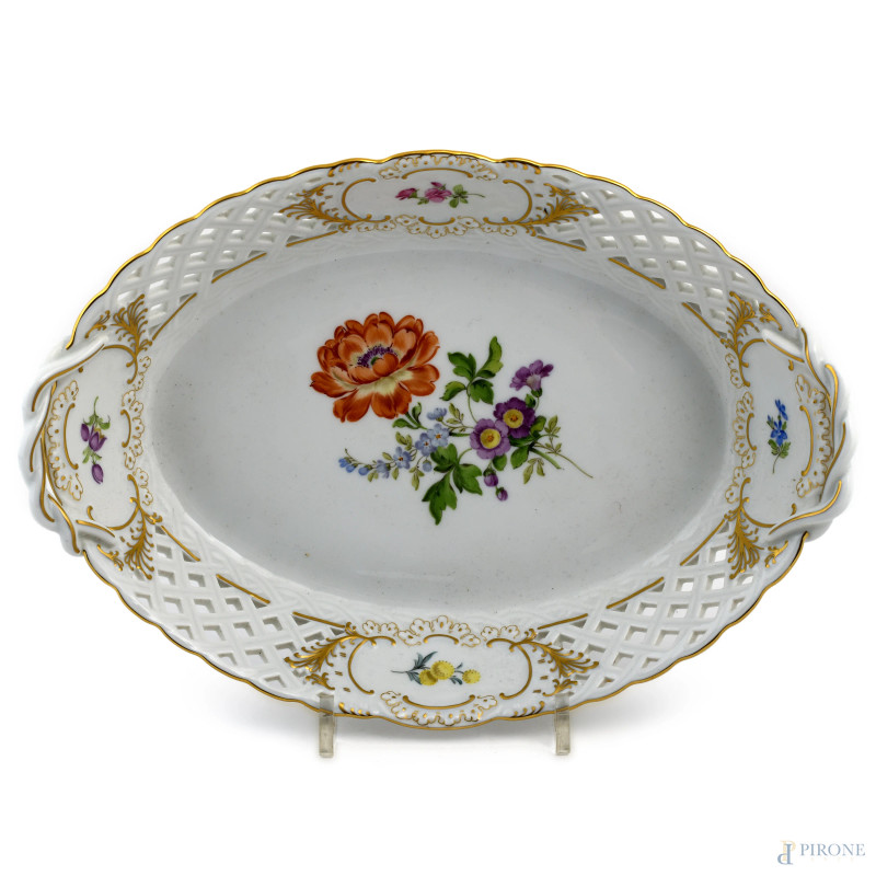 Vassoio traforato in porcellana Meissen a doppia presa con decoro floreale nel cavetto, XX secolo, cm 26x18,5