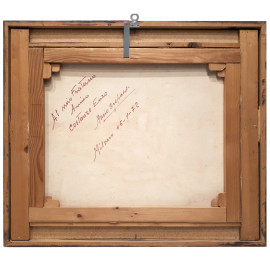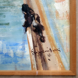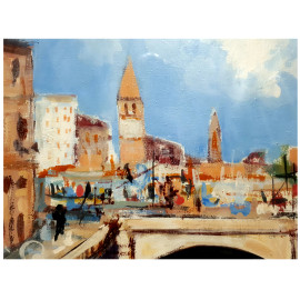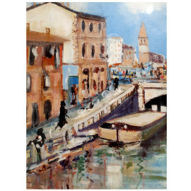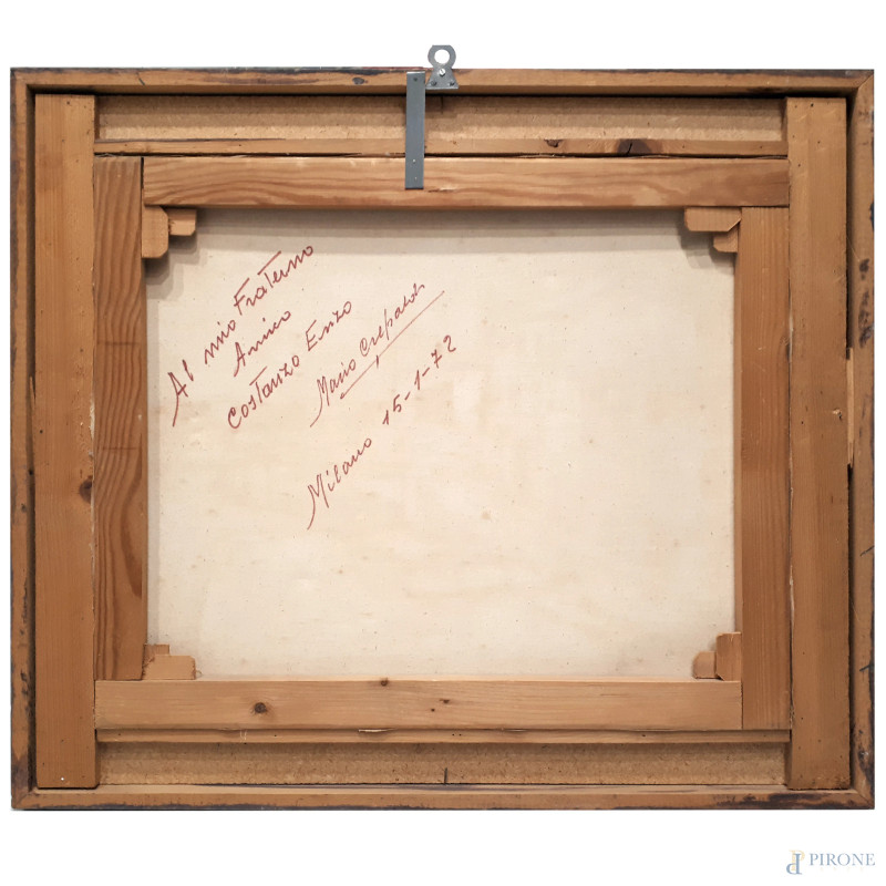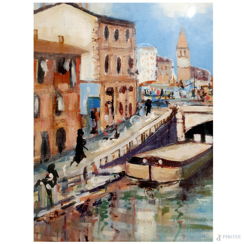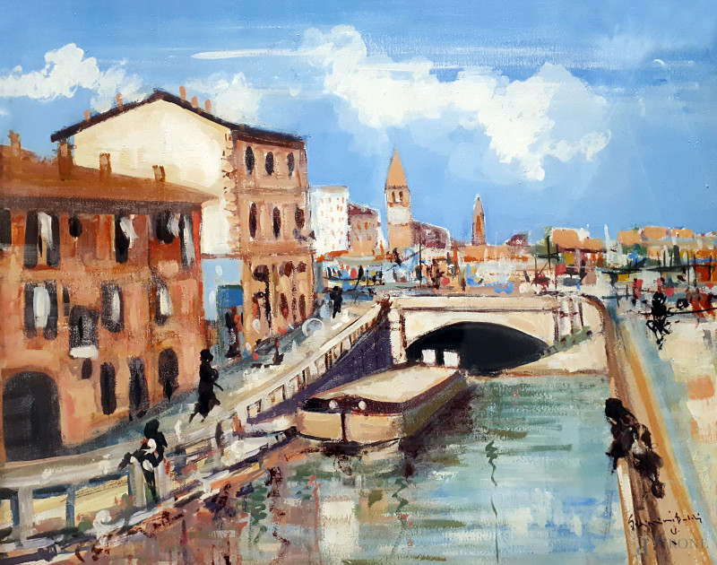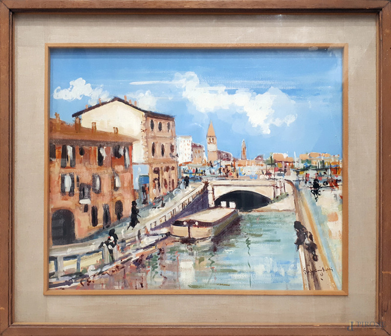 Veduta del Ponte dello Scodellino ai Navigli di Milano, seconda metà del Novecento, olio su tela, cm 50x60, firmato in basso a destra, firma titolo e dedica al retro, con cornice
