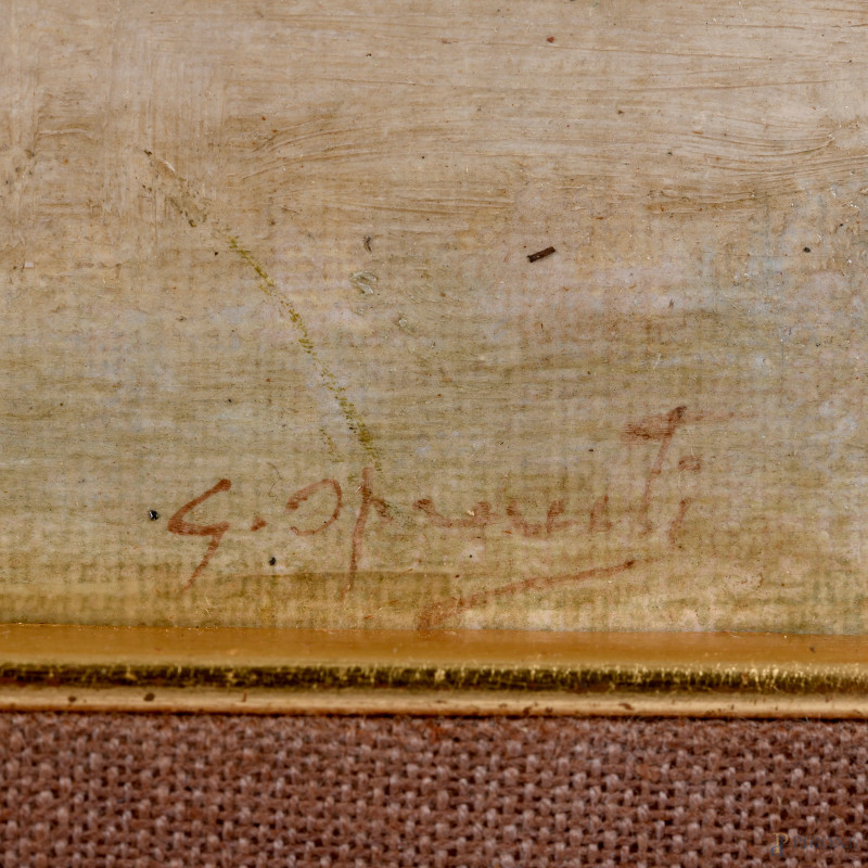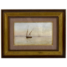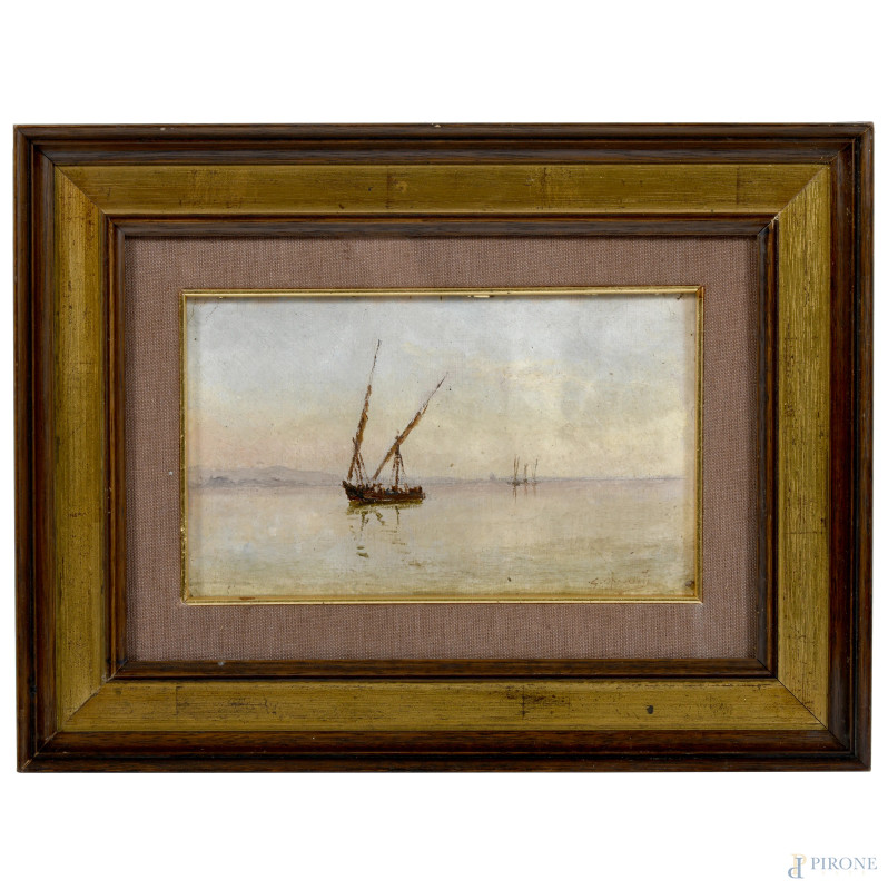 Veliero con figure, XX secolo, olio su tela applicata su cartone, cm 15x24, firmate in basso a destra, entro cornice, (lievi cadute di colore)