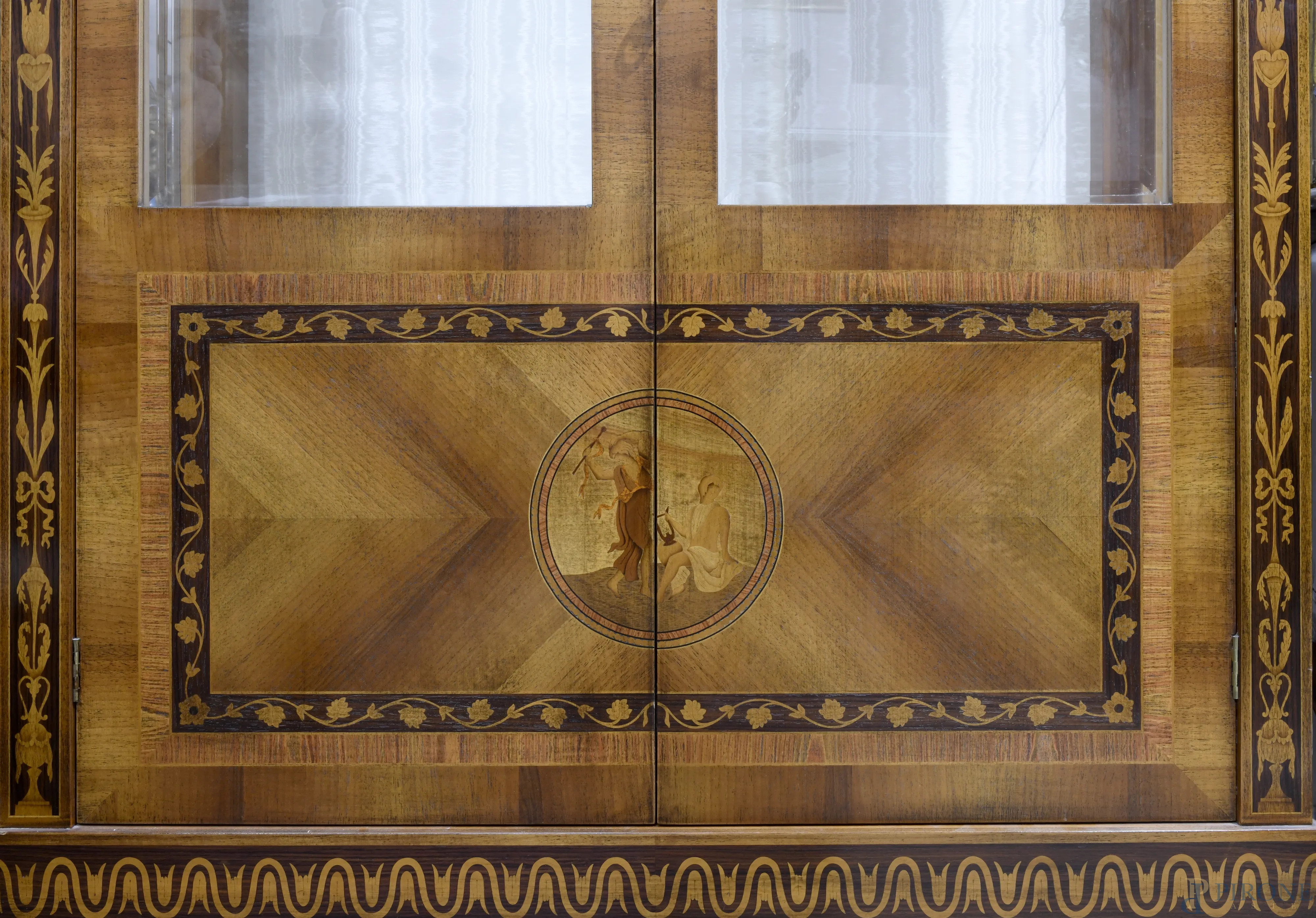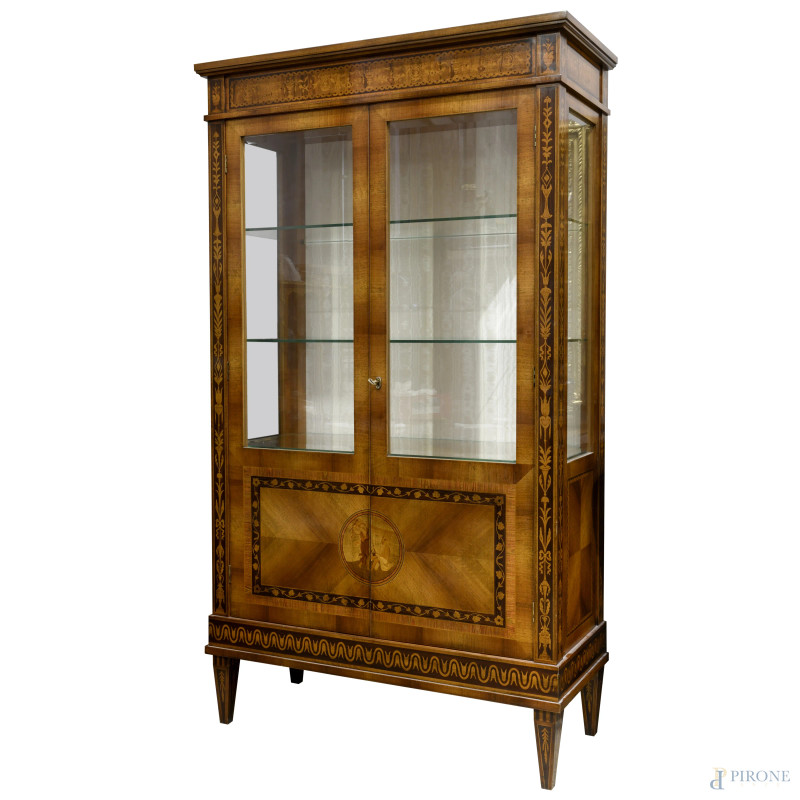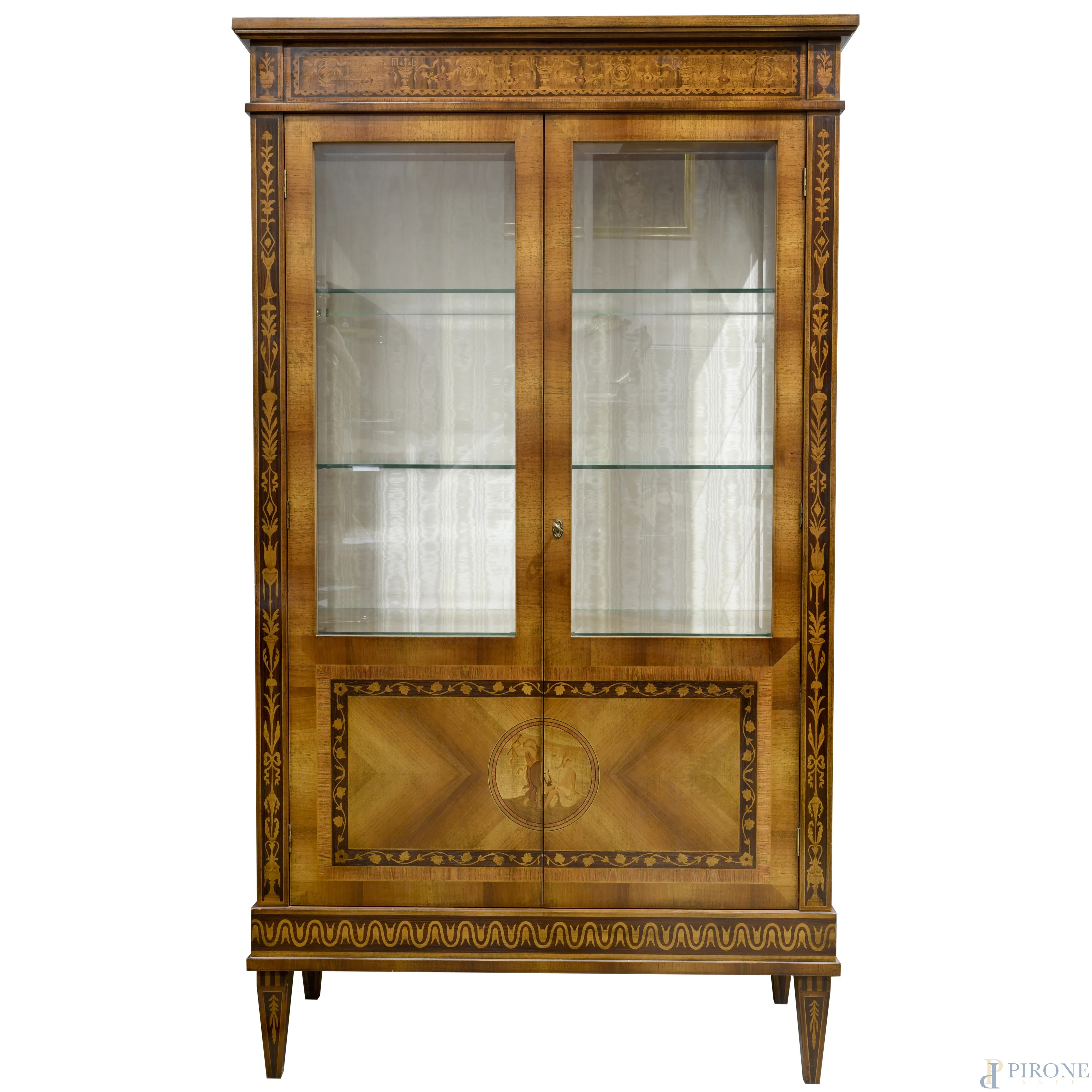 Vetrina in stile Luigi XVI intarsiato in varie essenze a doppia anta vetrata, XX secolo, cm 194x111x47, (Segni di usura, scalfiture, difetti)