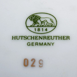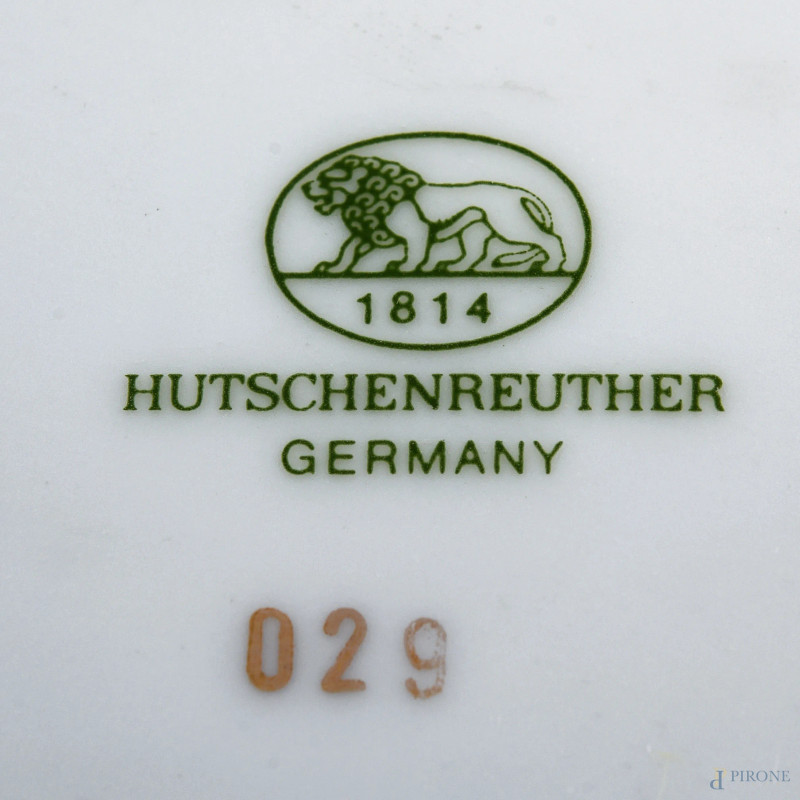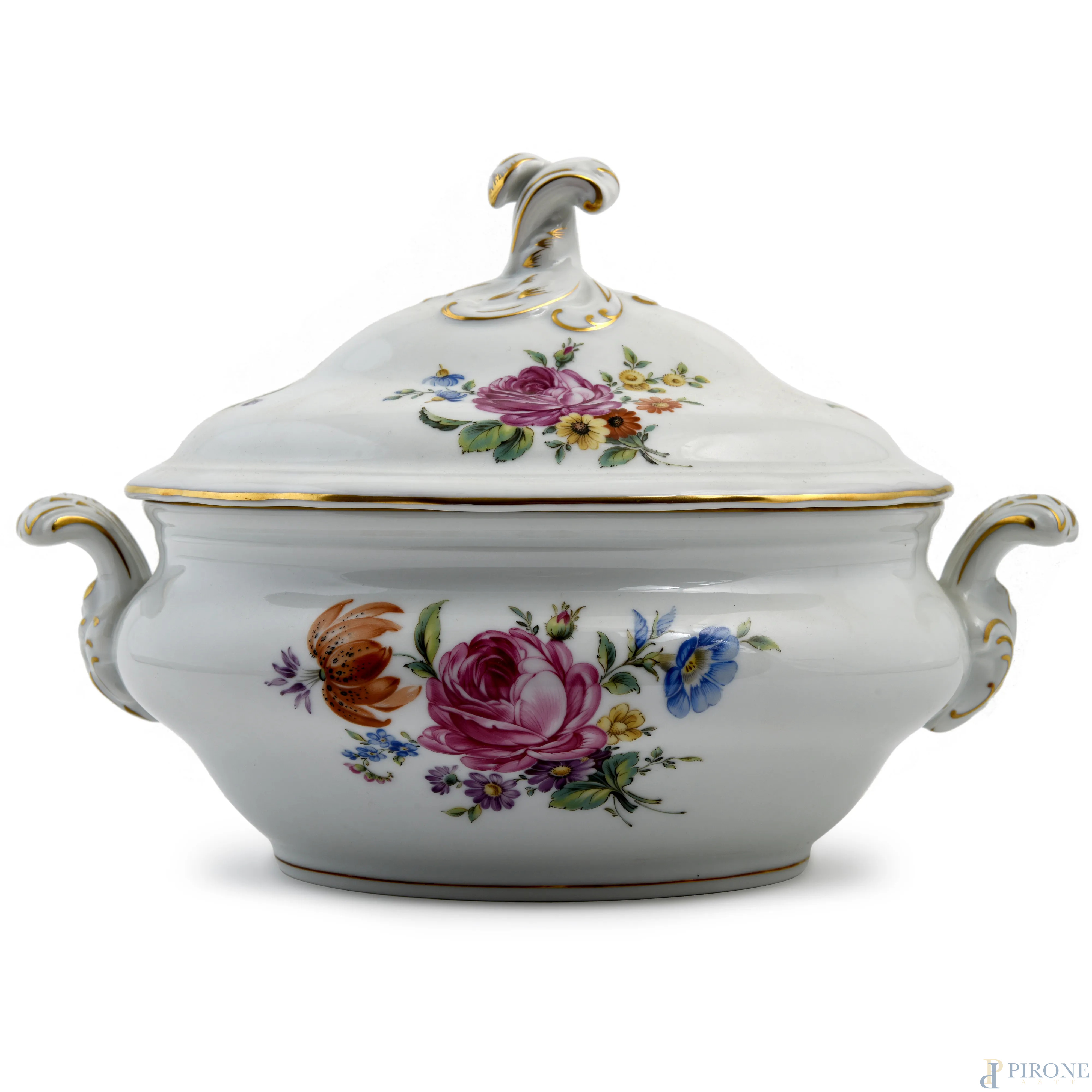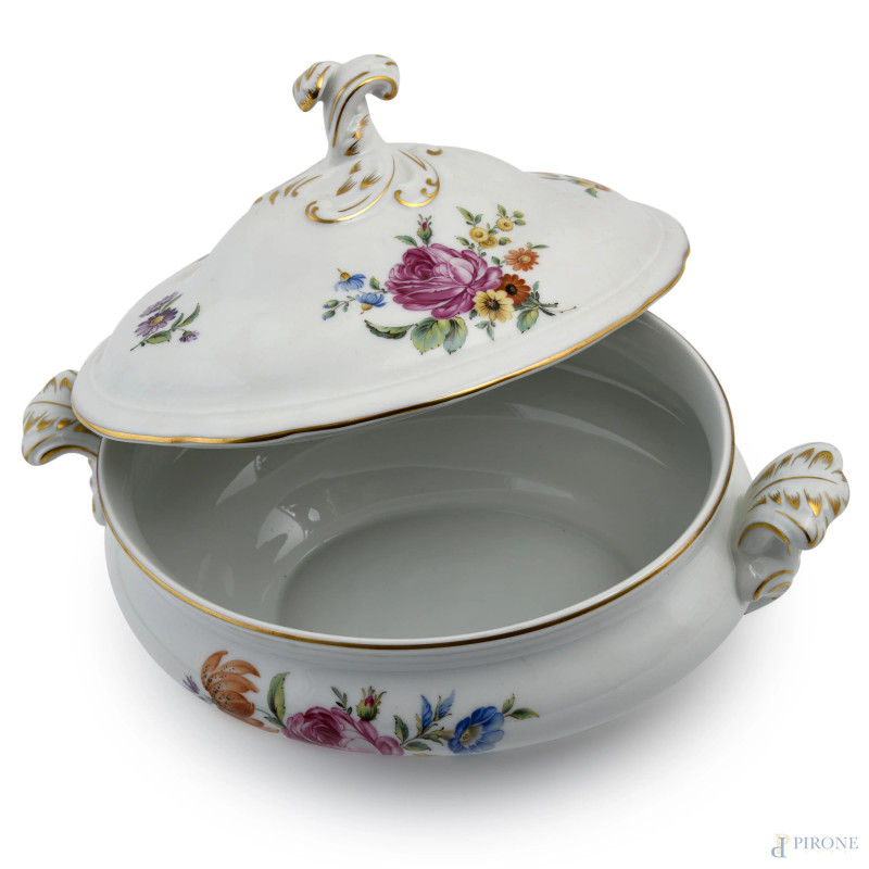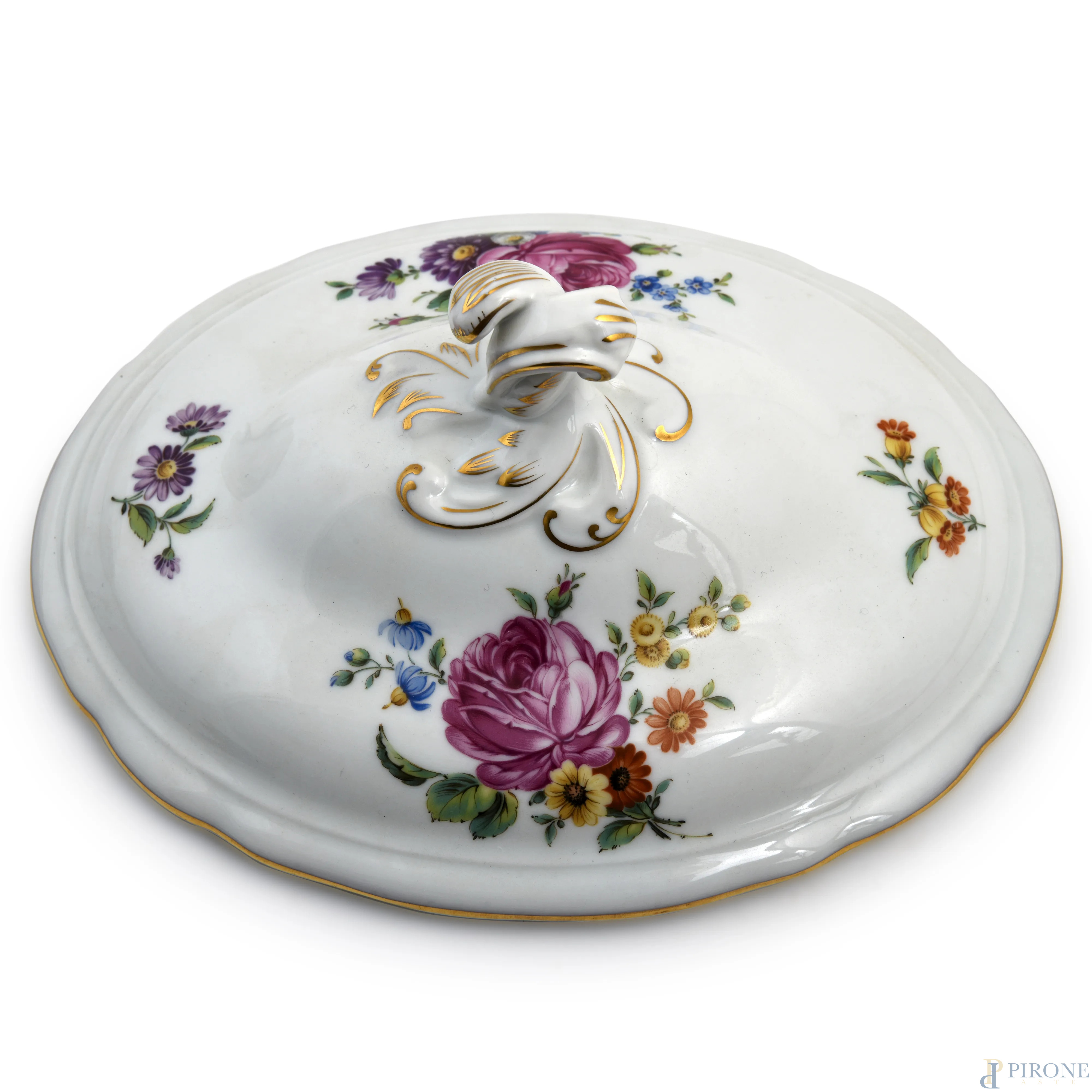 Zuppiera in porcellana tedesca dorata e dipinta a decori floreali, cm 20x8x18