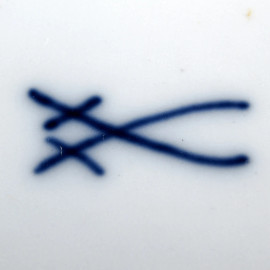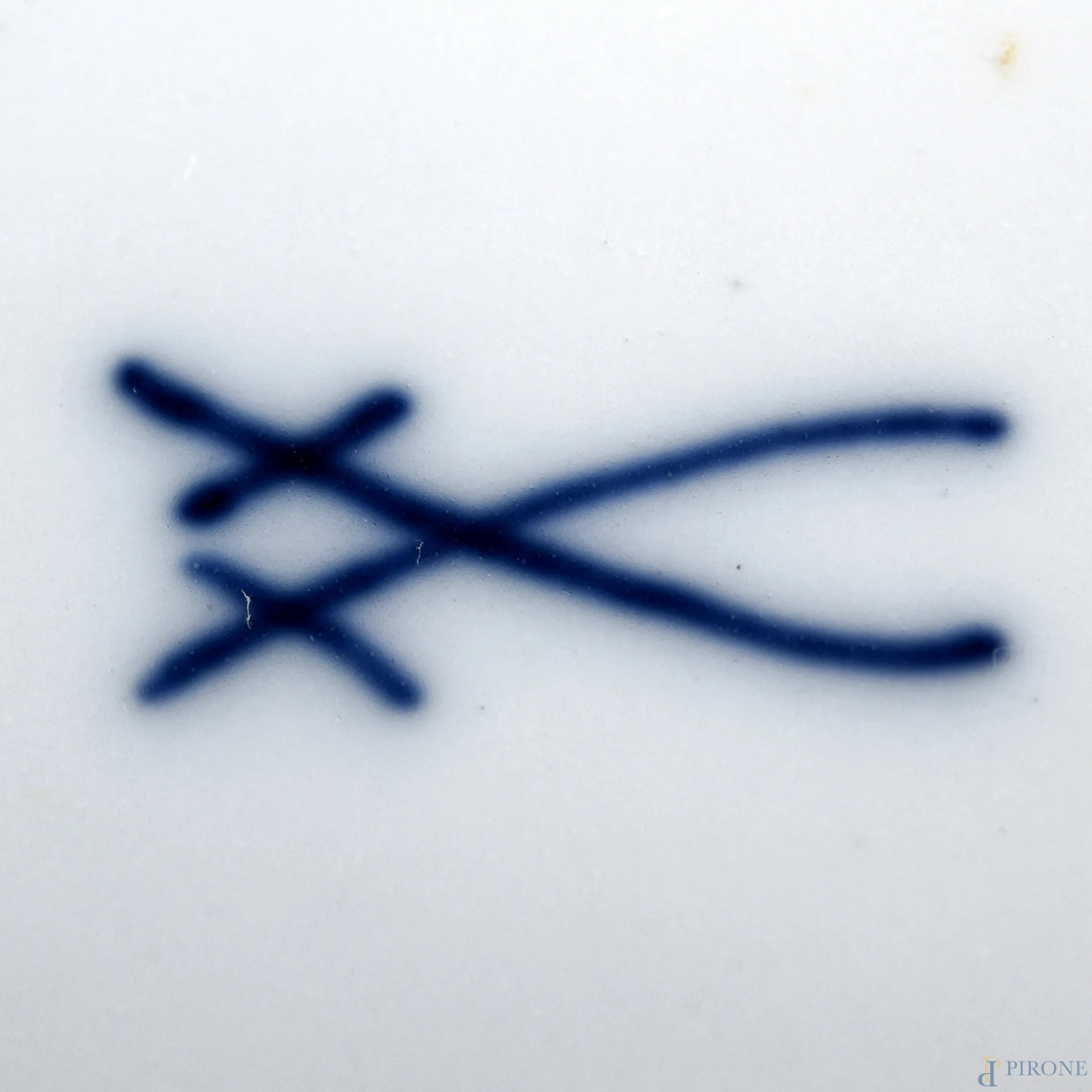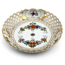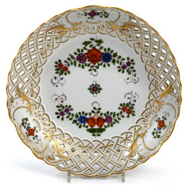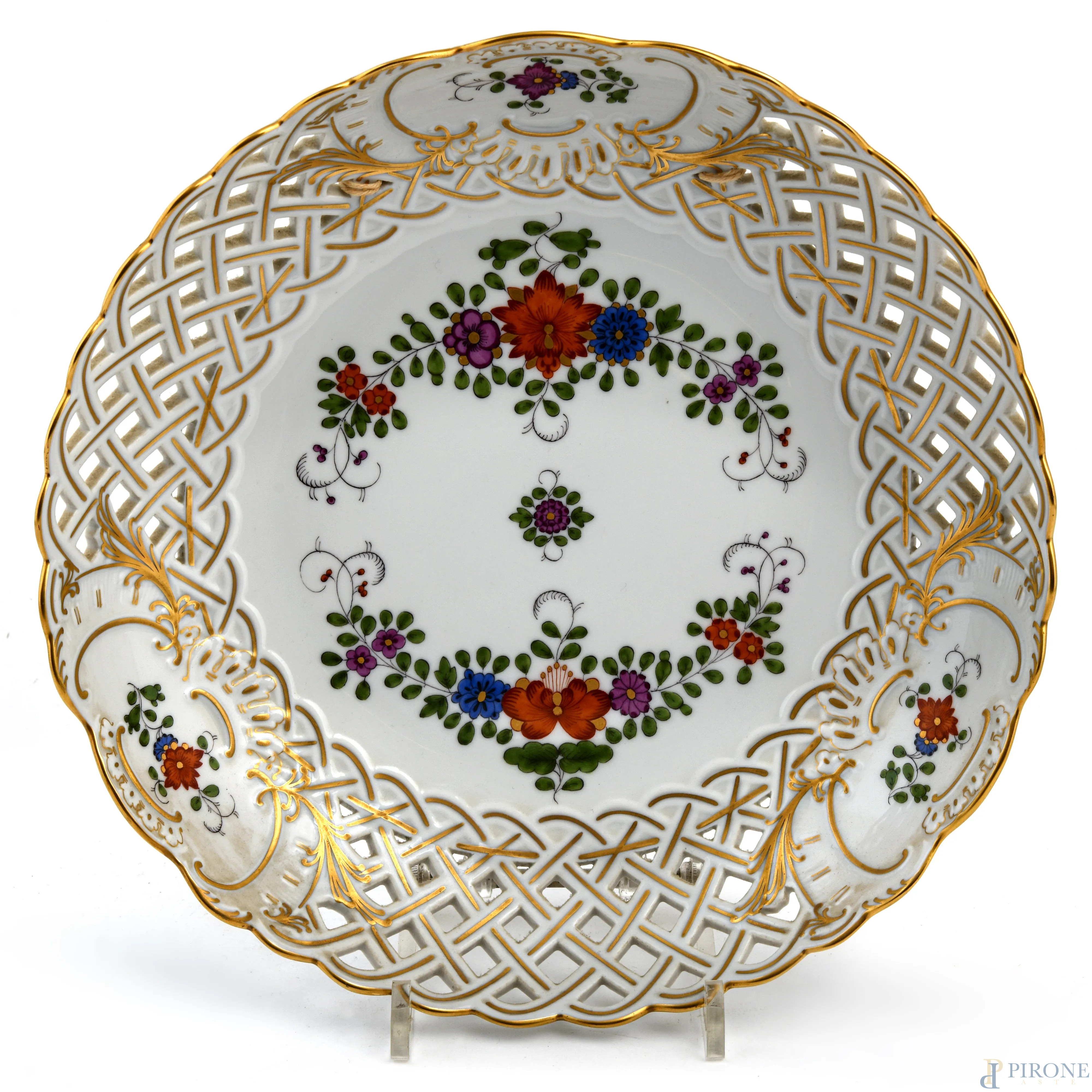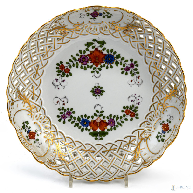 Centrotavola in porcellana Meissen decorato in oro e motivi floreali, XX secolo, diametro cm 24