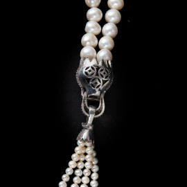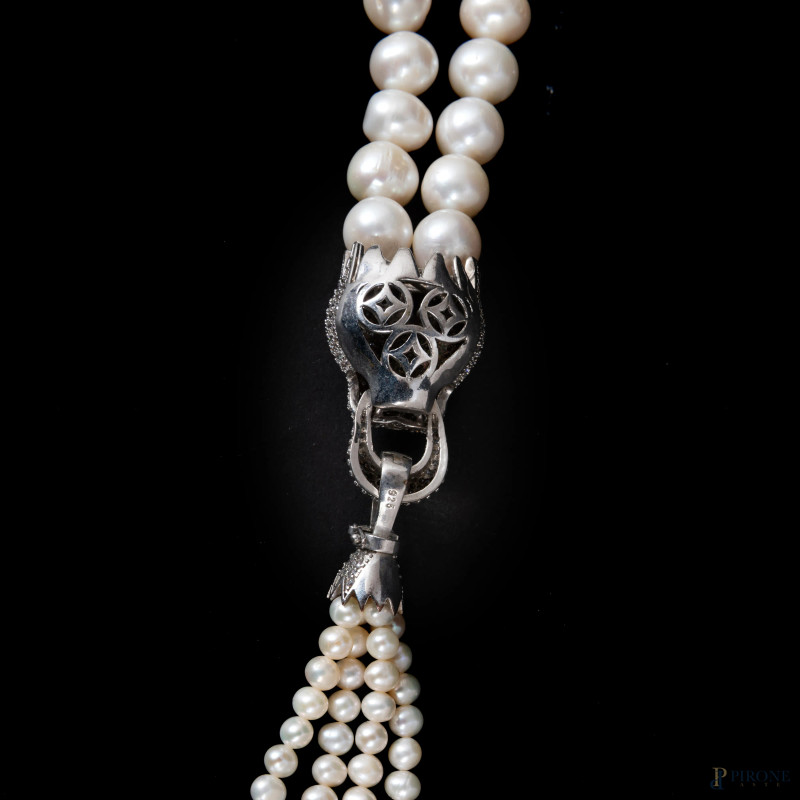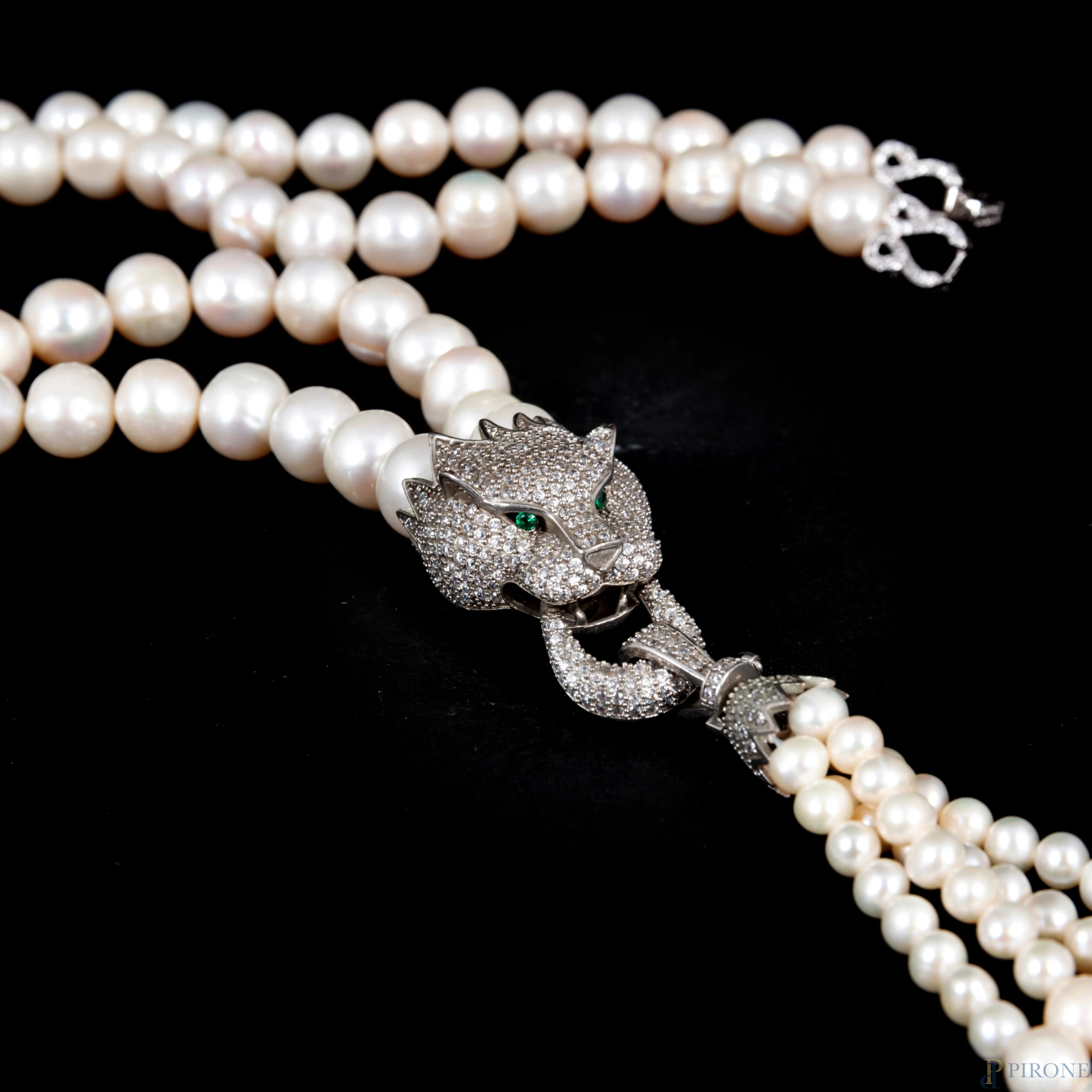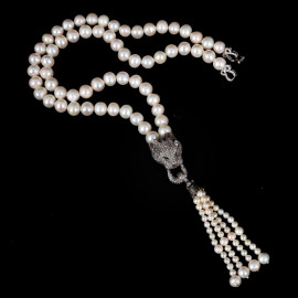Collana di perle con ciondolo in argento a guisa di pantera in zirconi e pietre verdi, lunghezza cm 70