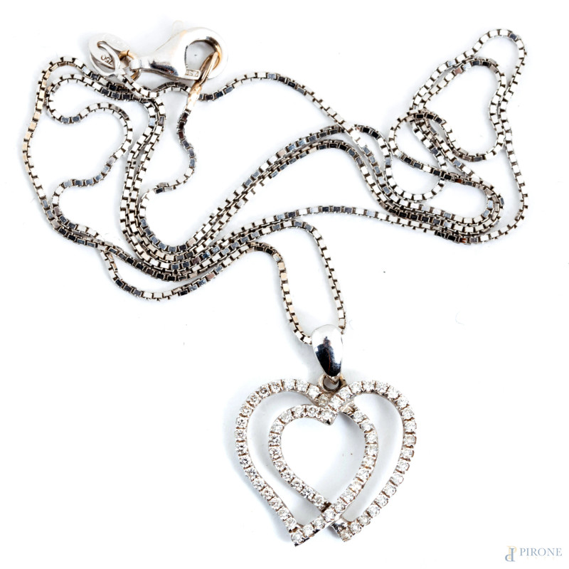 Collana in oro bianco con ciondolo composto da due cuori intersecati, lunghezza cm 47, peso gr 4,4
