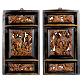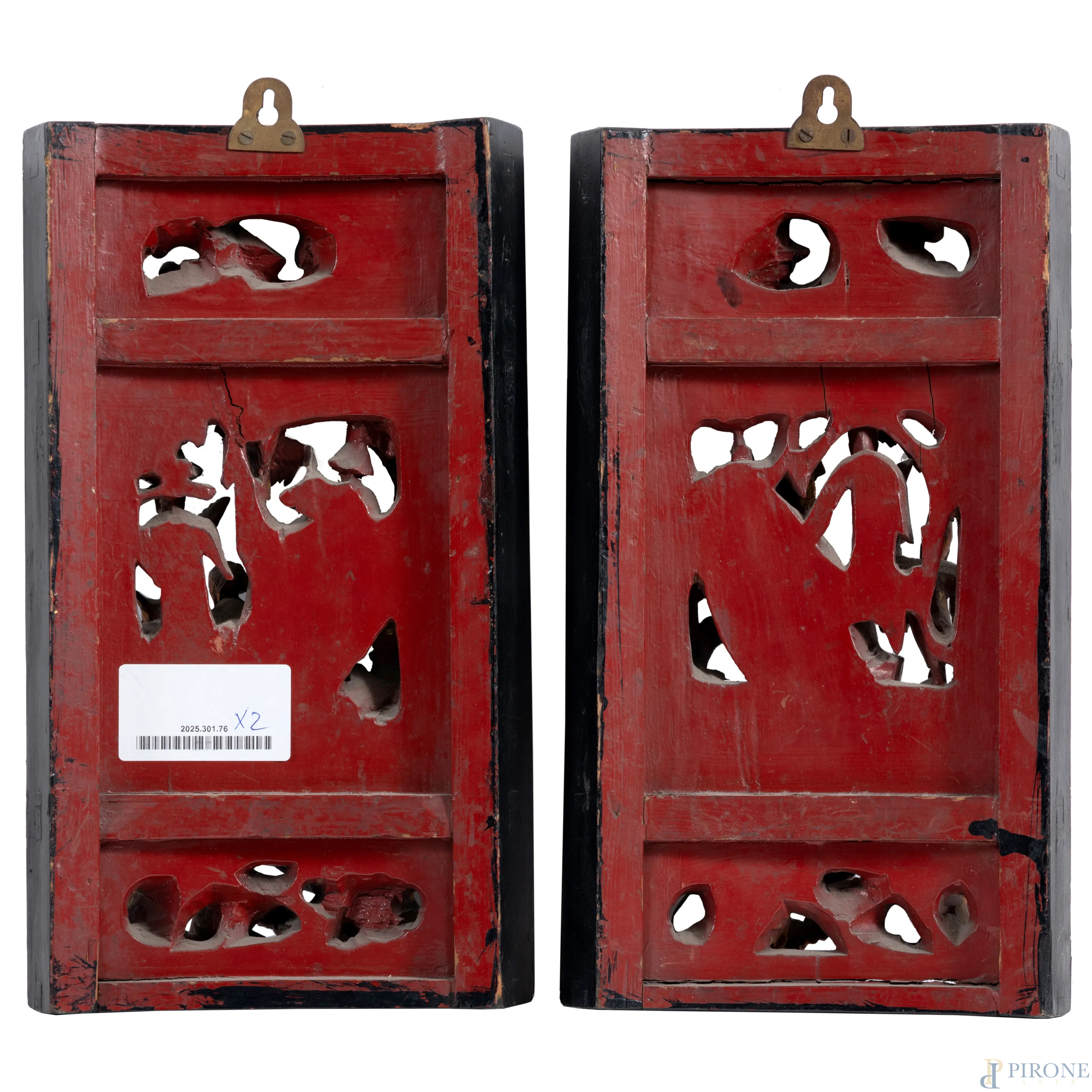 Coppia di pannelli in legno laccato e dipinto intagliati con figure su barche e pesci. Cina,XX secolo, cm 29x17, (scalfiture, segni di usura)
