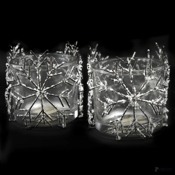 Coppia di portabottiglie in vetro con applicazioni a foggia di ramo innevato, altezza cm 12, (segni di usura)