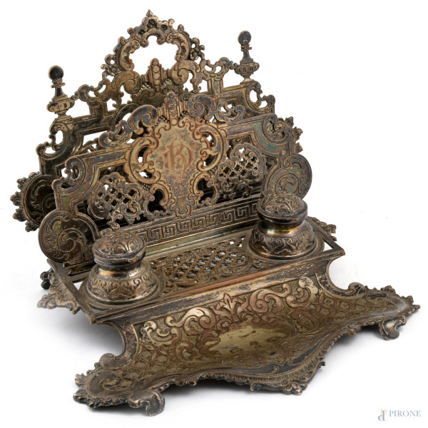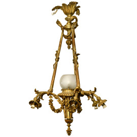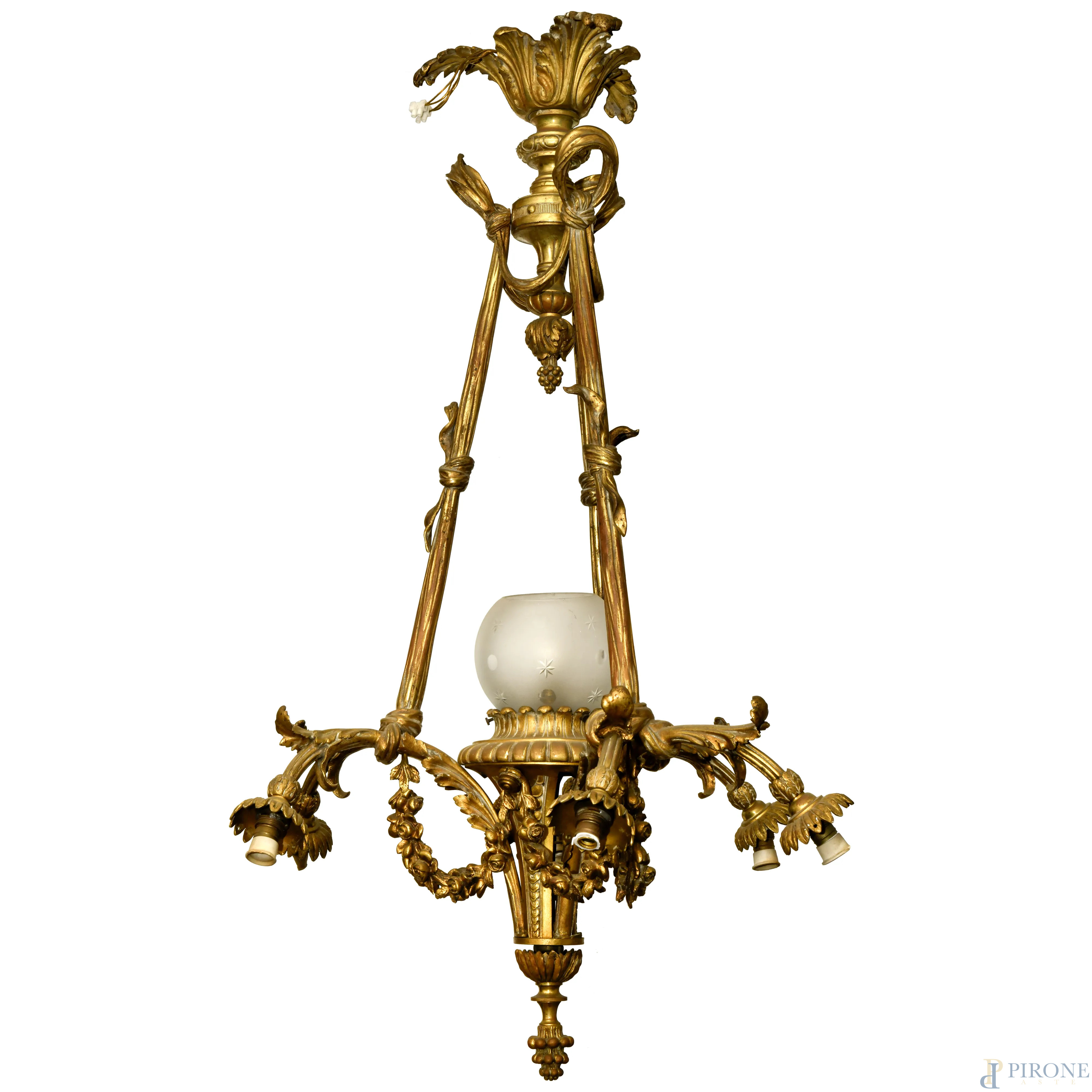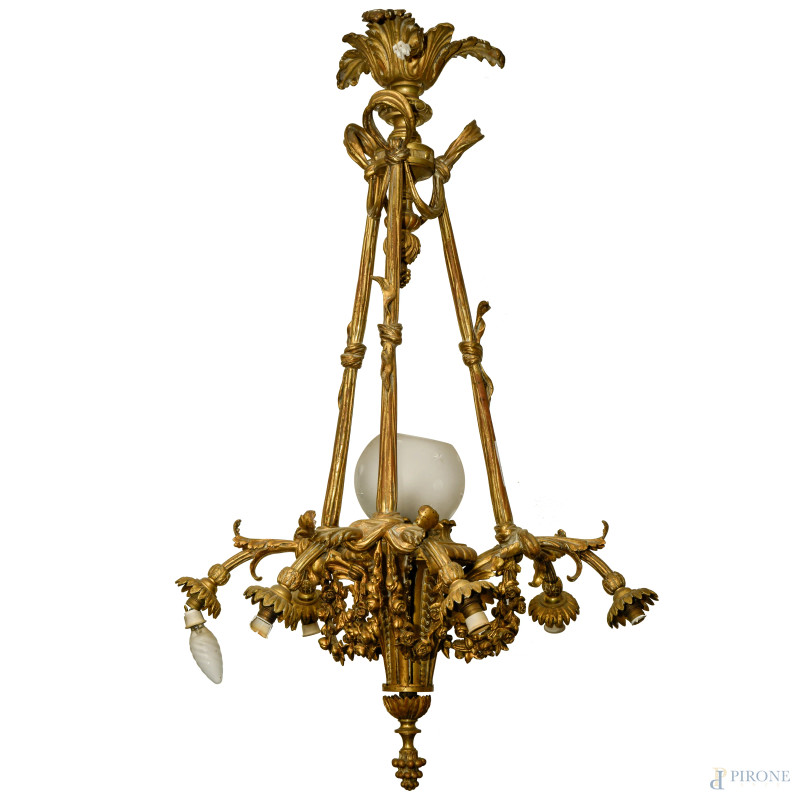 Lampadario a sei luci in bronzo dorato cesellato a ghirlande e volute, XX secolo, cm 92x60x60, (difetti, da revisionare)