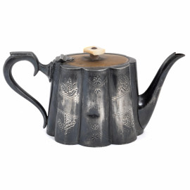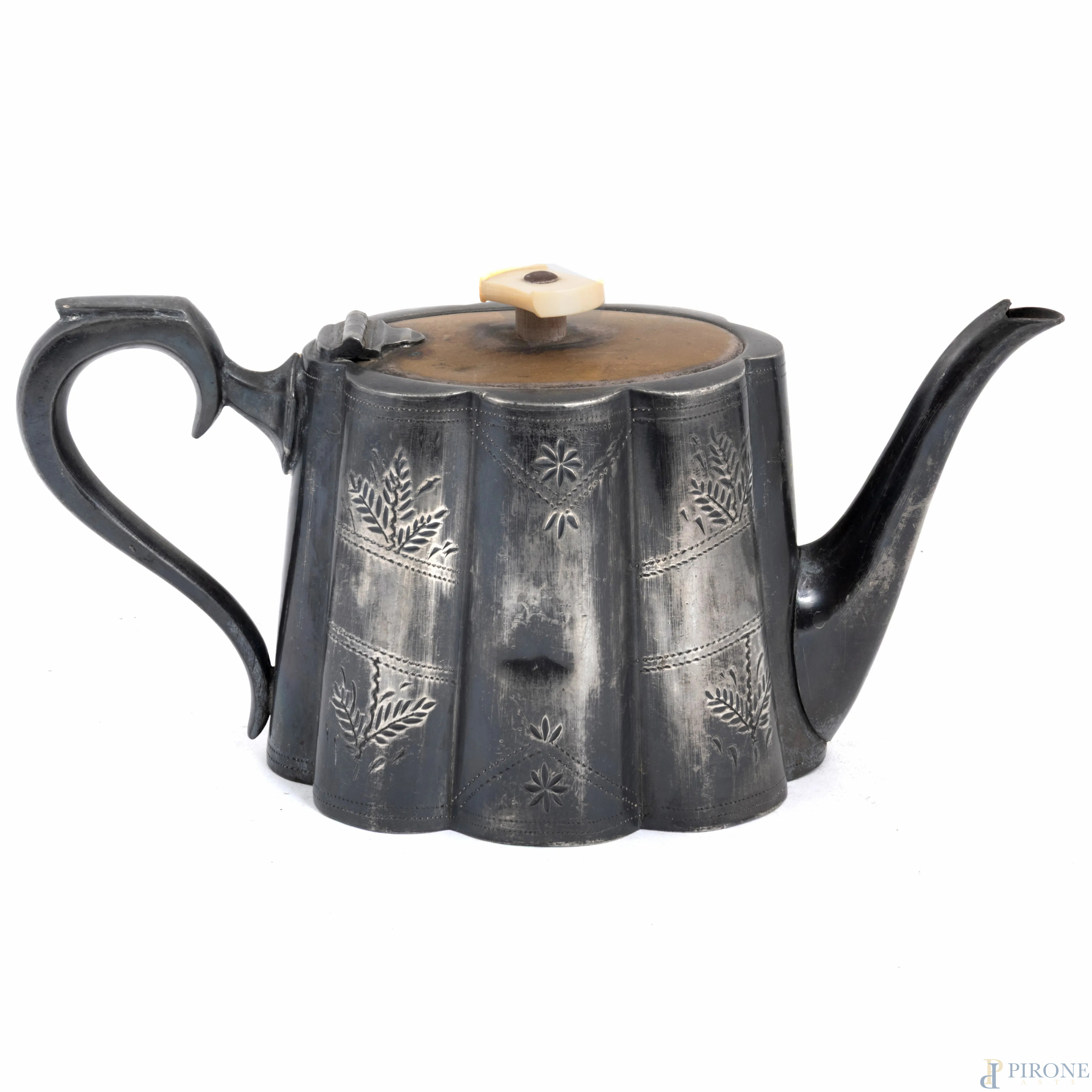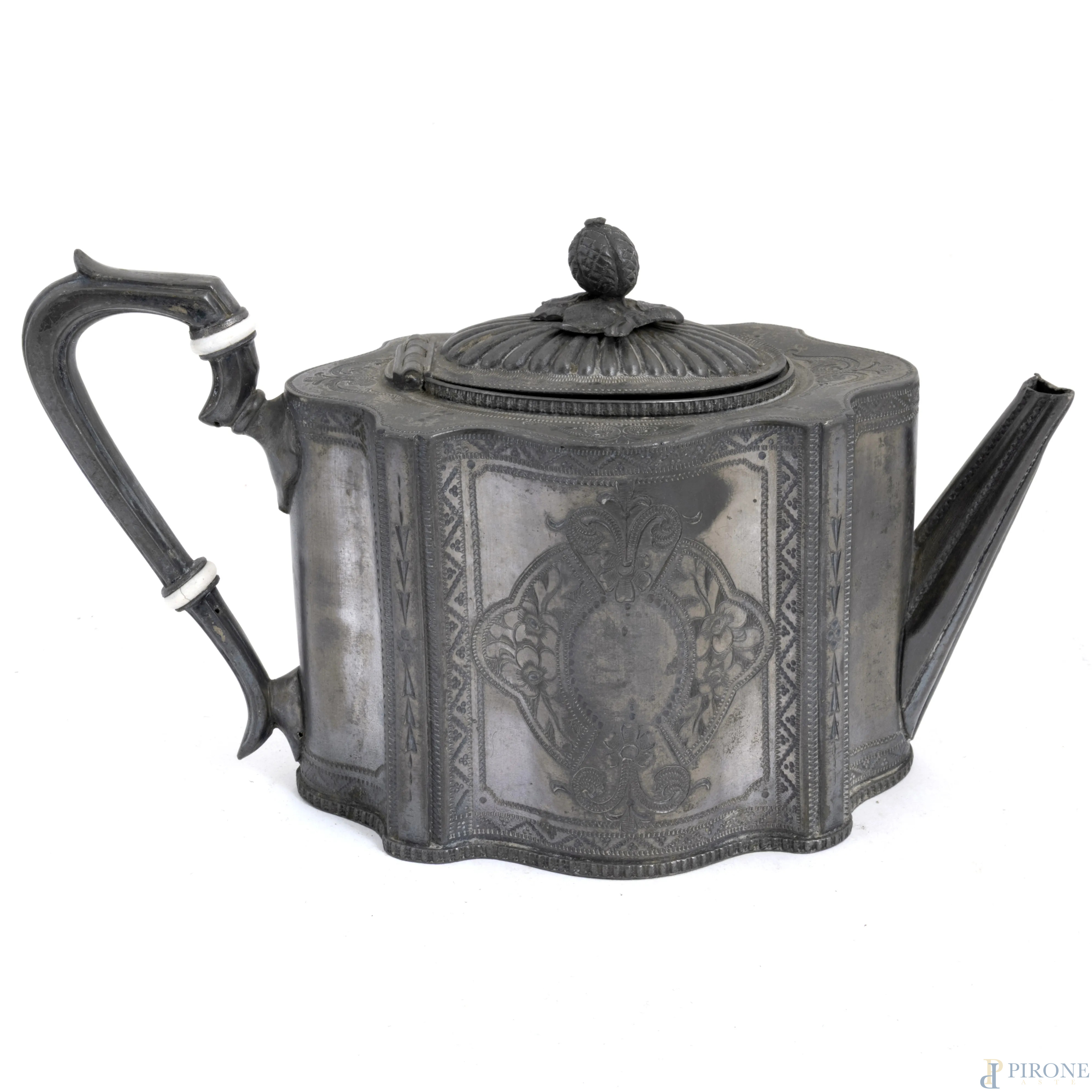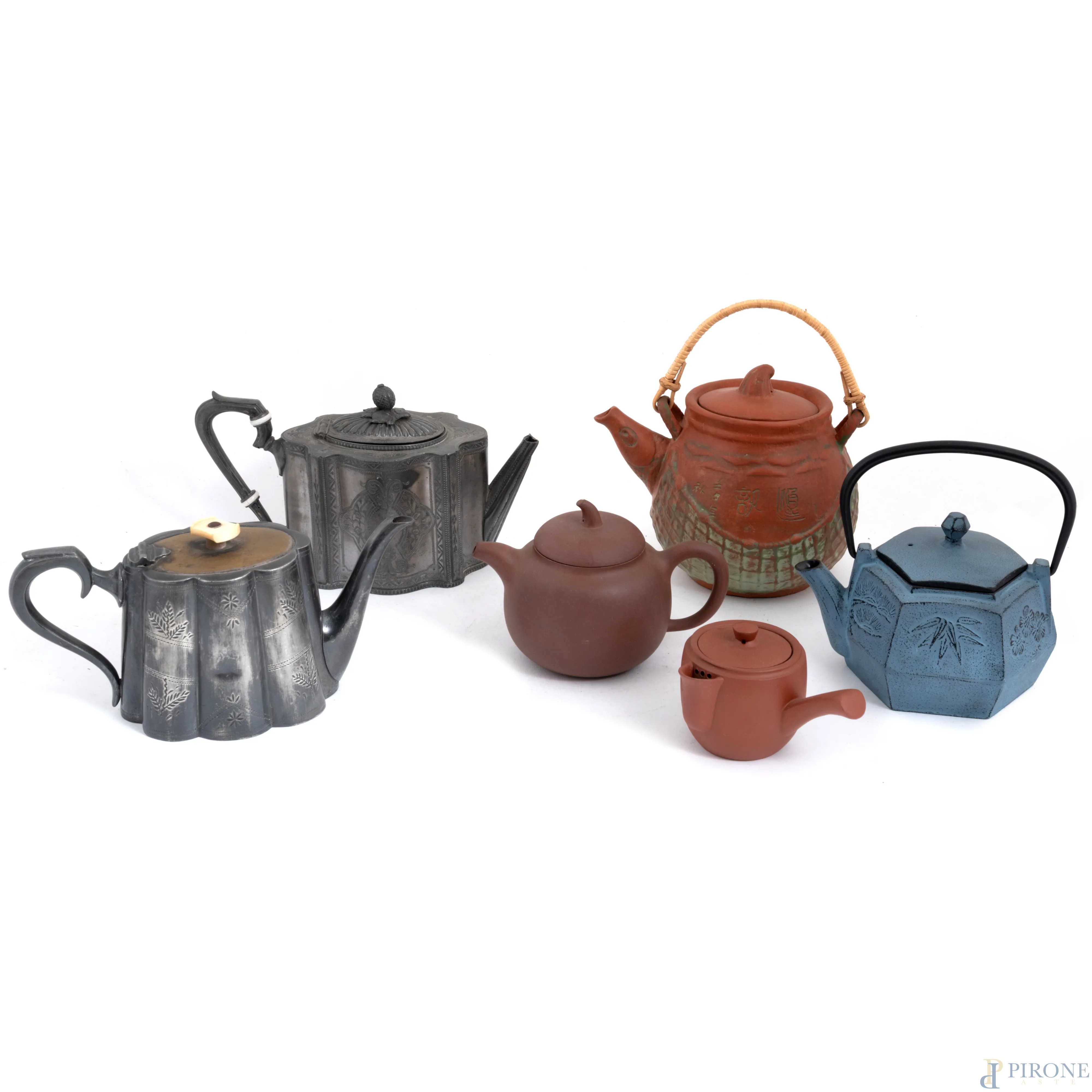 Lotto di sei teiere in materiali diversi, XX secolo, altezza massima cm 16, (segni di usura, difetti)