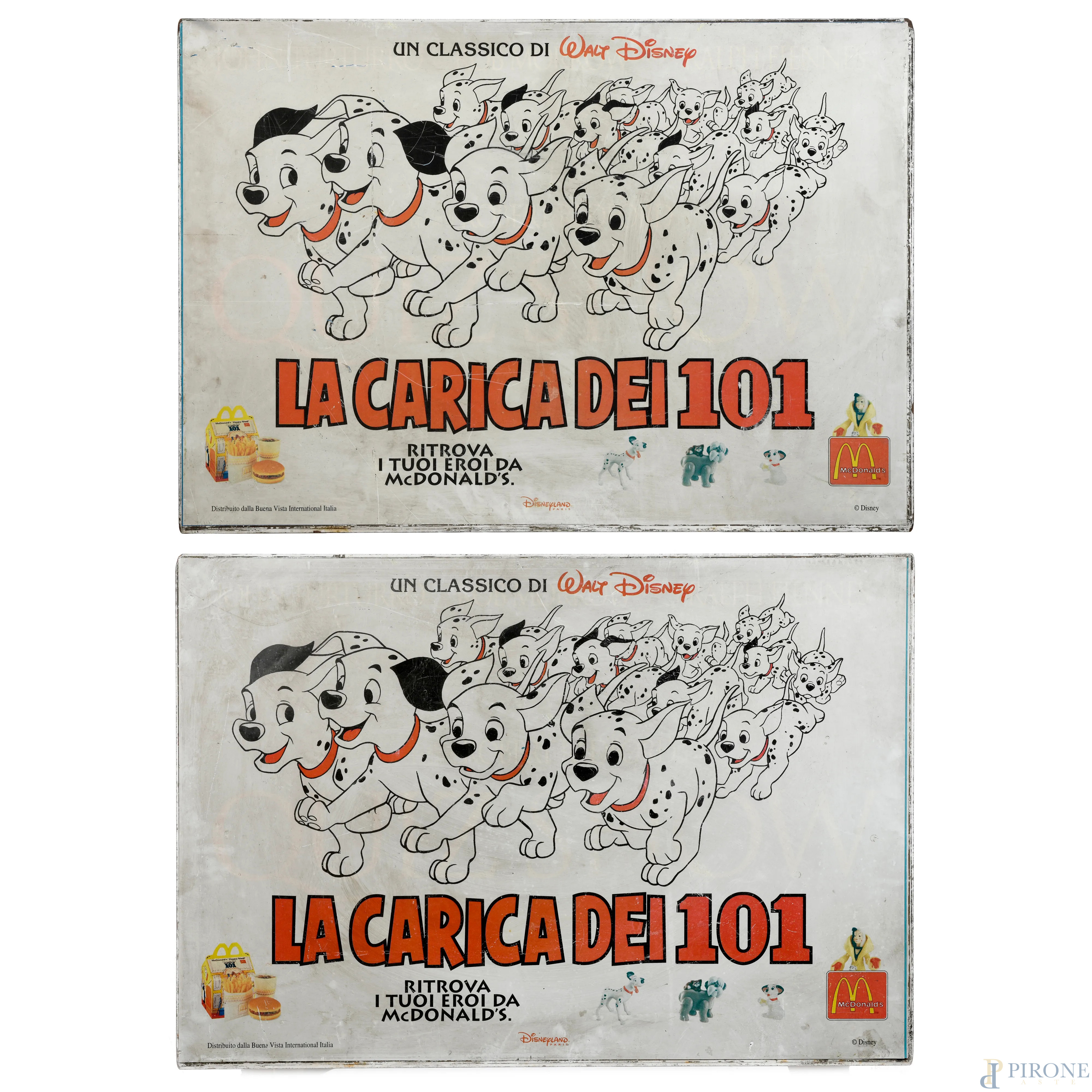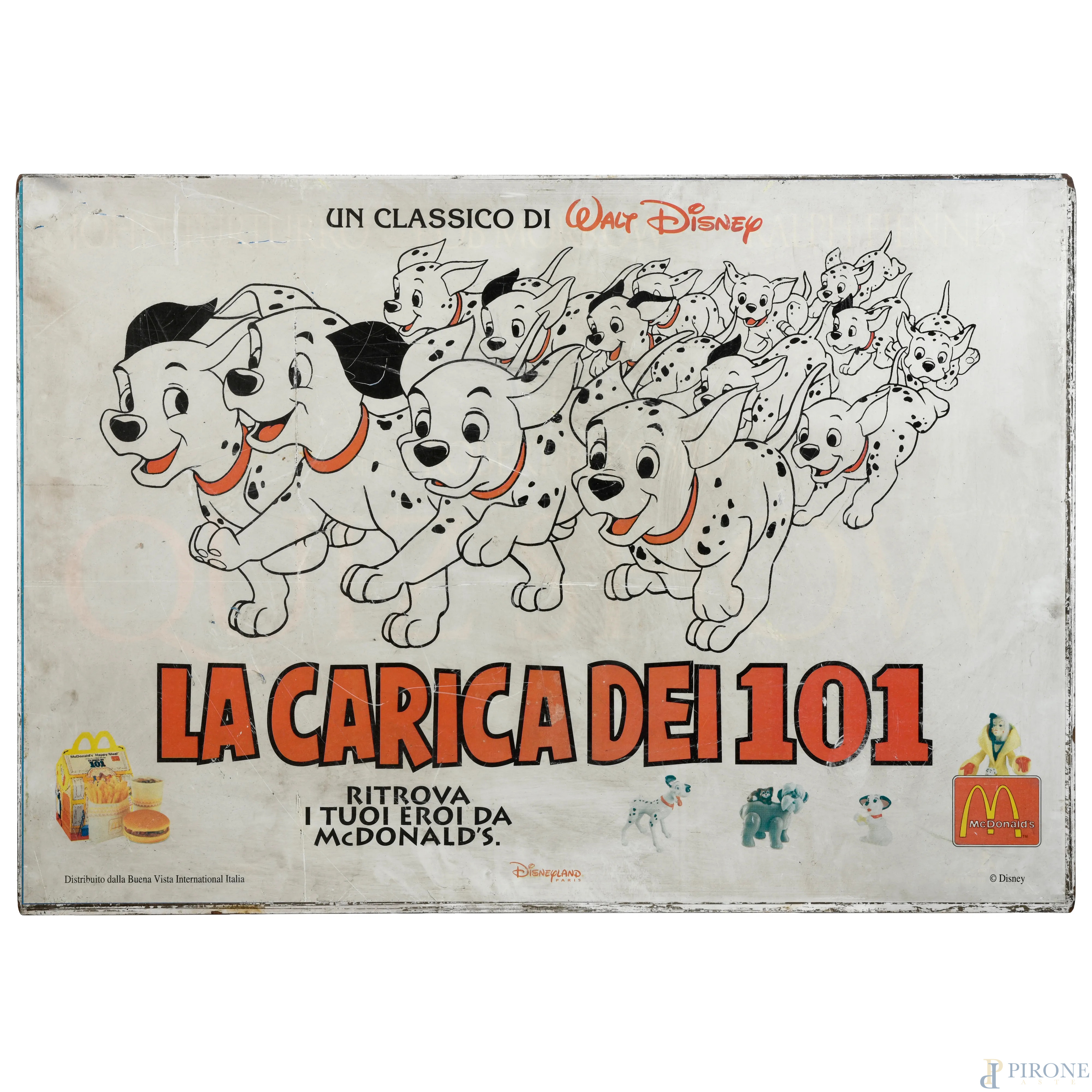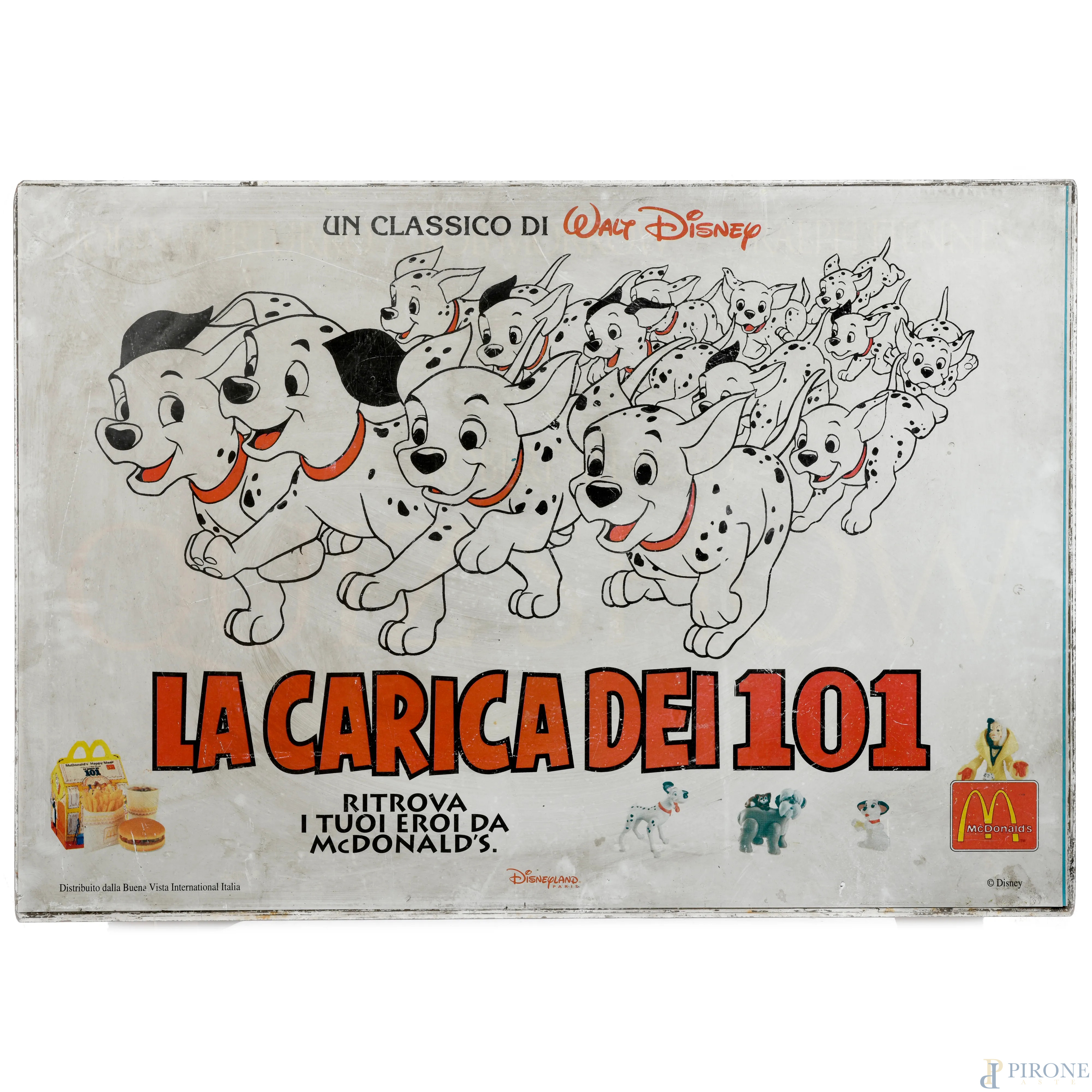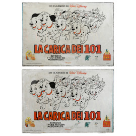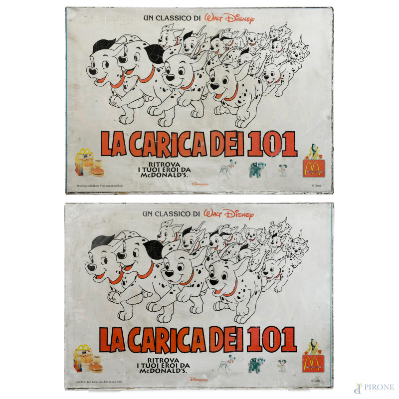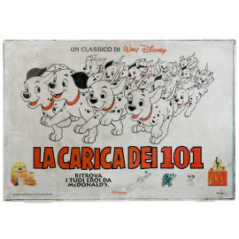 Pannello pubblicitario con struttura in metallo de "La Carica dei 101", cm 70x100 (segni di usura, difetti, mancanze)