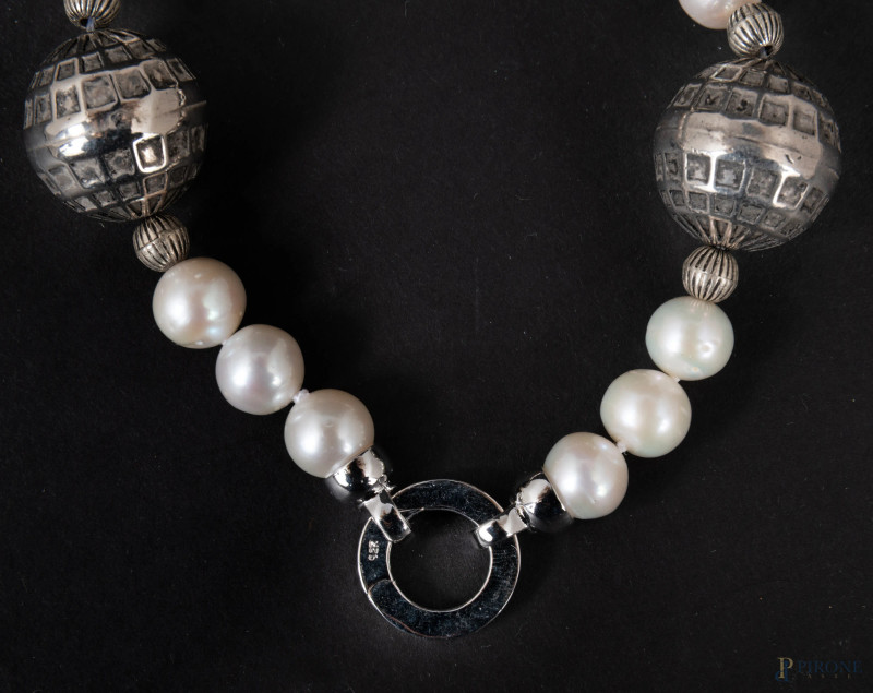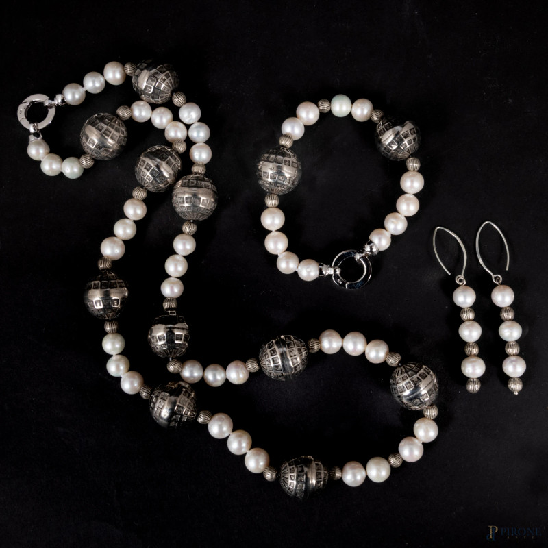 Parure con perle e argento, lunghezza collana cm 66; lunghezza bracciale cm 20