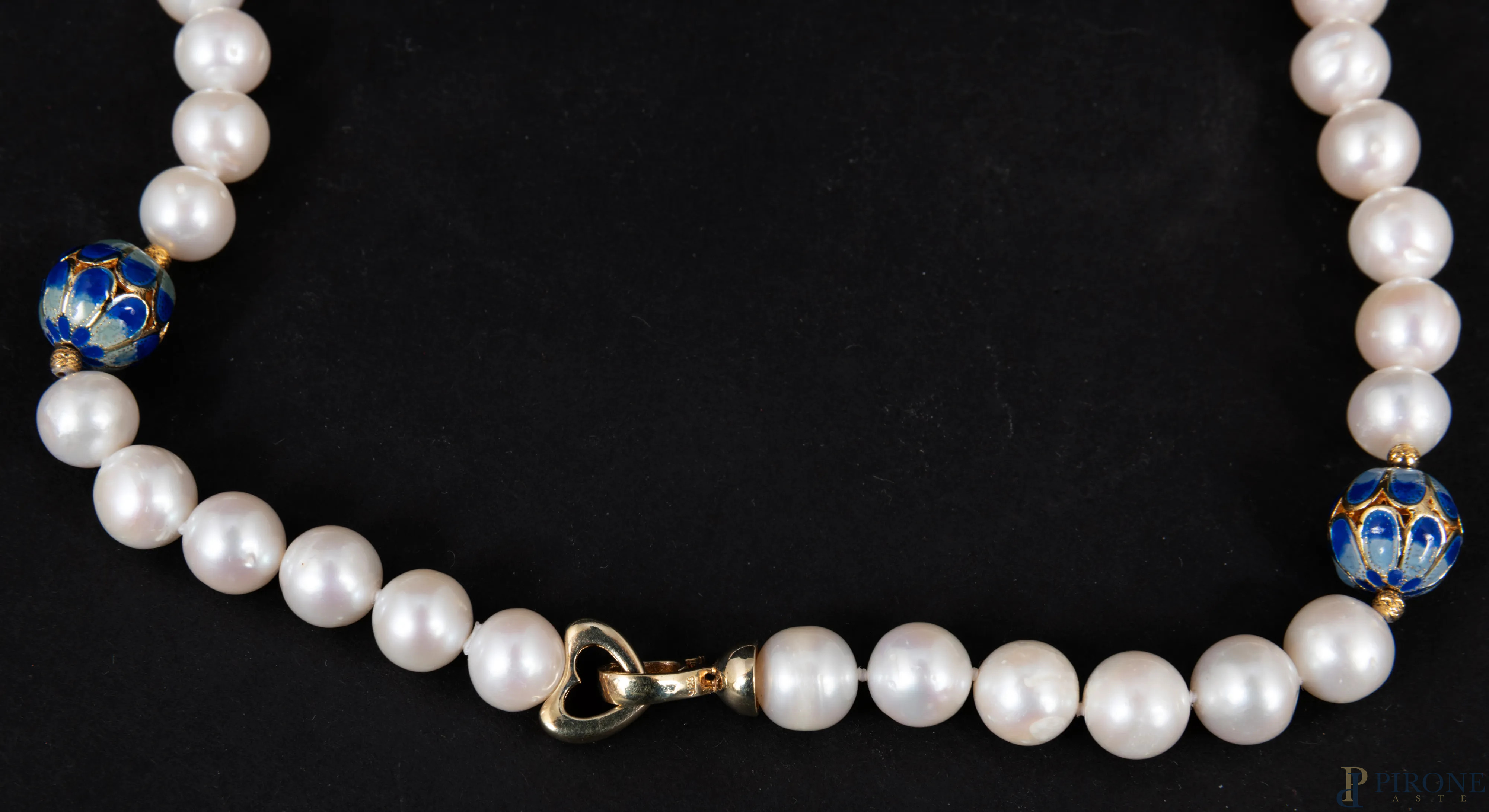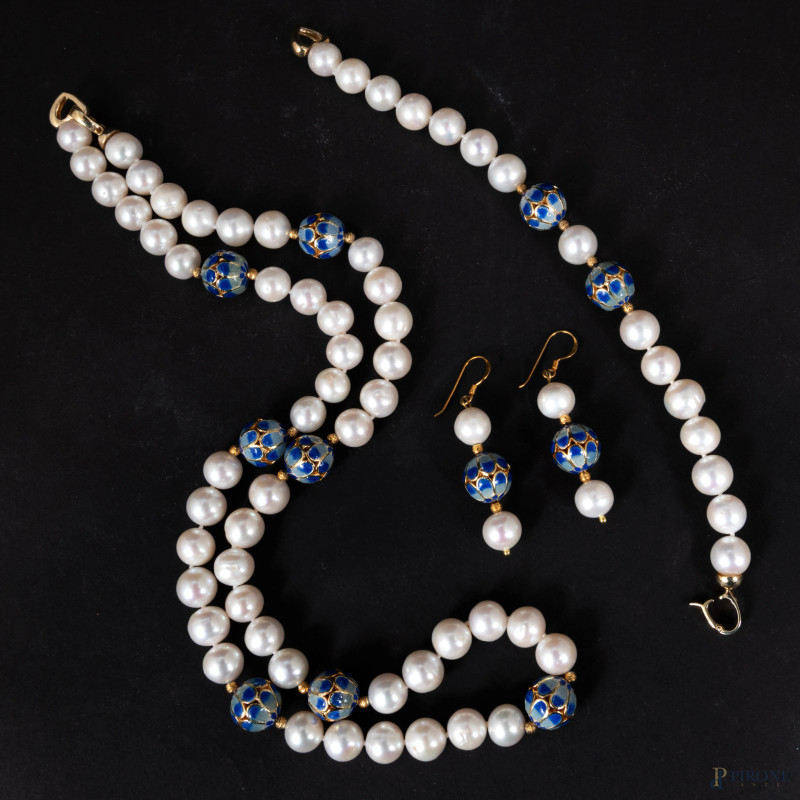 Parure con perle, sfere blu e argento, lunghezza collana cm 56; lunghezza bracciale cm 20