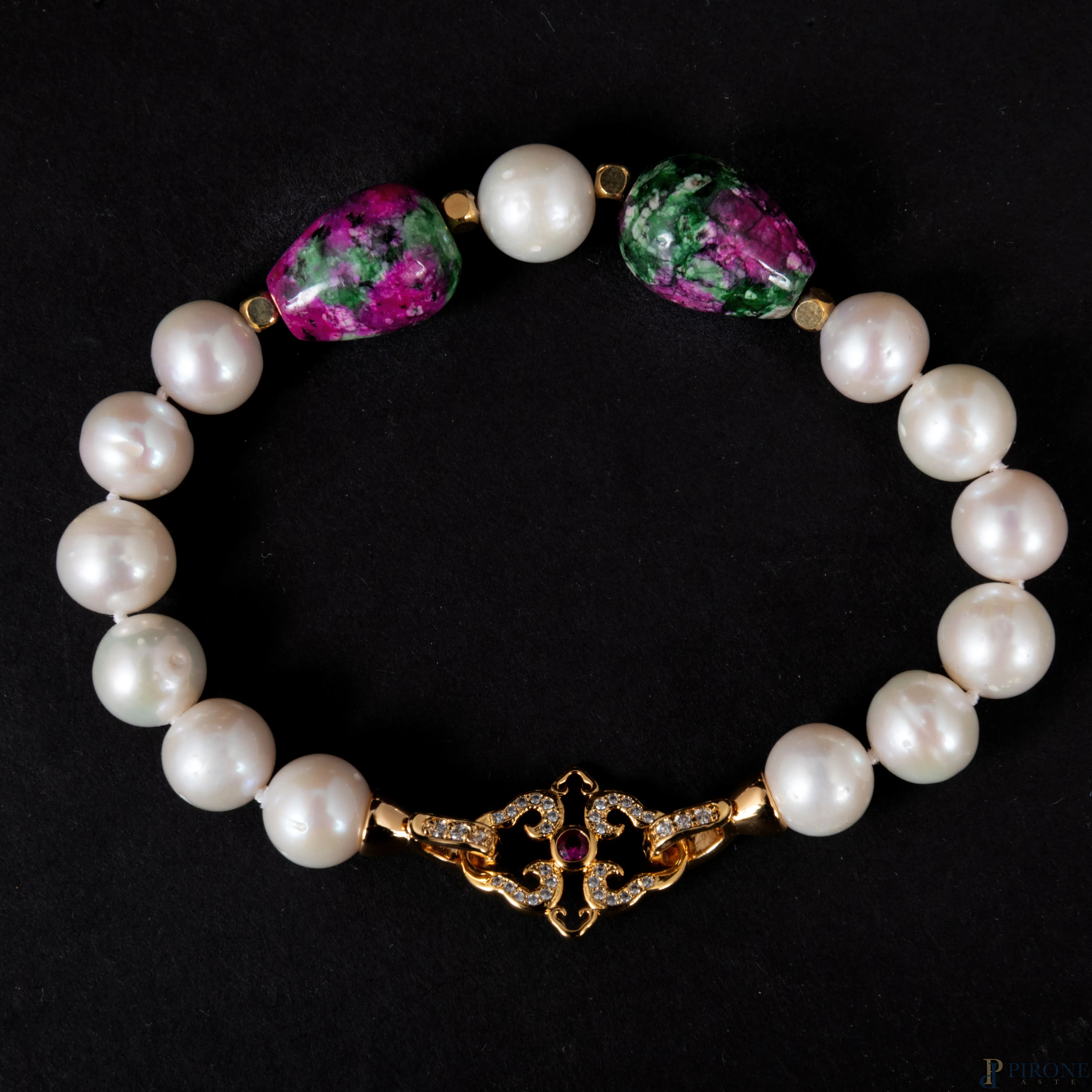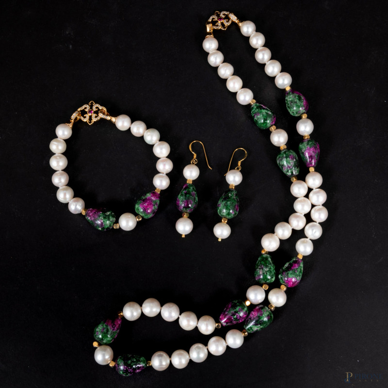 Parure con perle, zoisite e argento , lunghezza collana cm 60; lunghezza bracciale cm 20