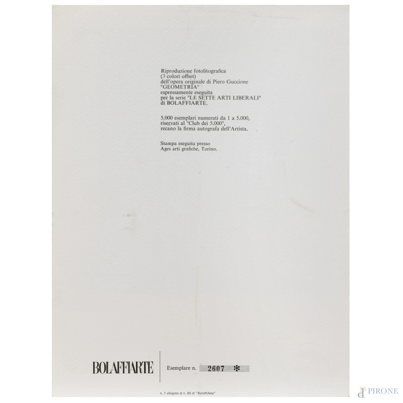 Riproduzione fotolitografica dell'opera di Piero Guccione "Geometria", eseguita per la serie Le sette Arti Liberali di Bolaffi Arte, cm 28x20