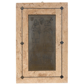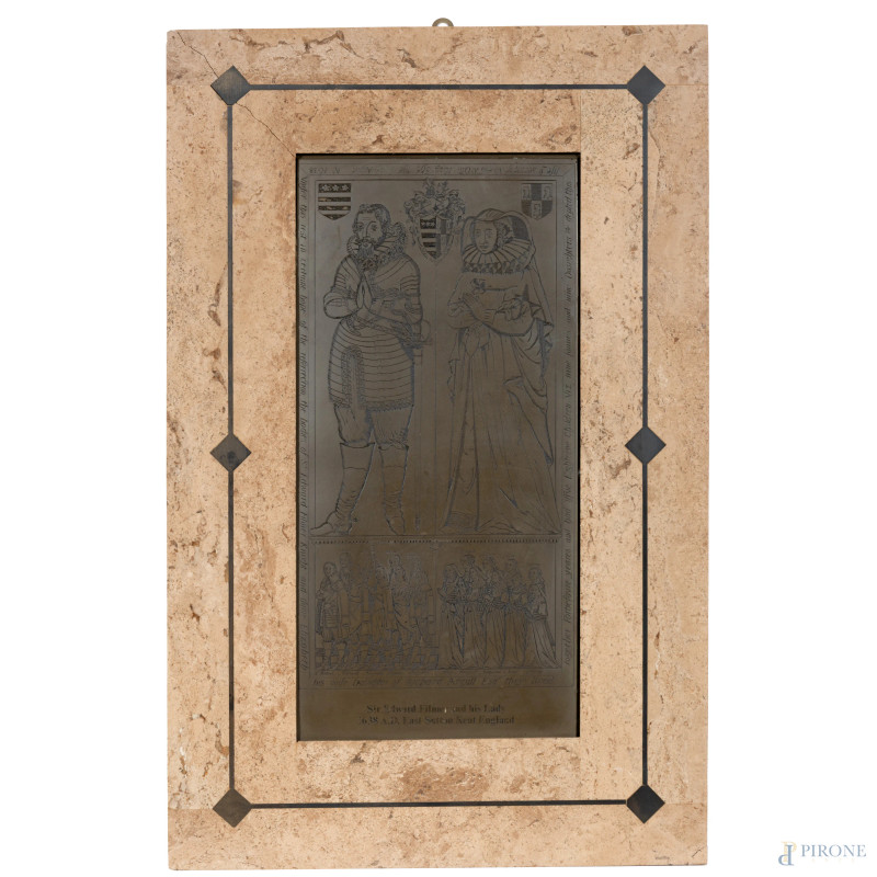 Sir Edward Filmer and his lady, XX secolo, lastra in bronzo con cornice rivestita in marmo, misure totali cm 72x47, (scalfiture, rotture, mancanze)