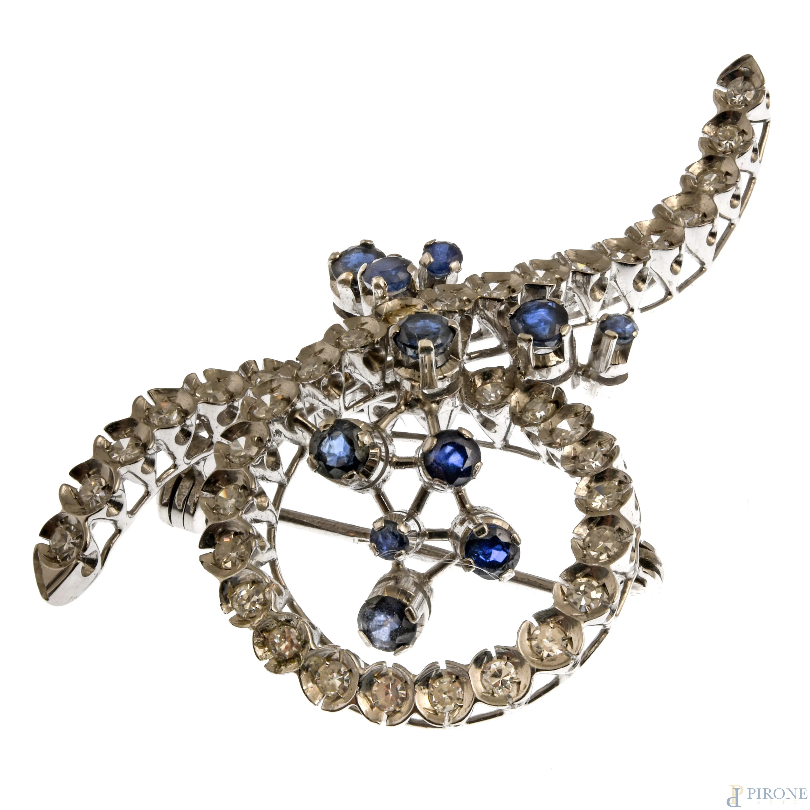 Spilla in oro bianco 18 kt, con zaffiri 0,45 ct totali e brillanti 1,20 ct totali, cm 5, peso complessivo gr 9