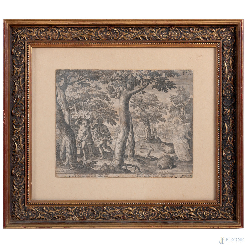 Egidius Sadeler, Adamo ed Eva si nascondono da Dio, acquaforte, su carta applicata su cartoncino, cm 20x25,5, entro cornice, (lievi segni di usura e tracce di umidità)
