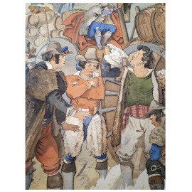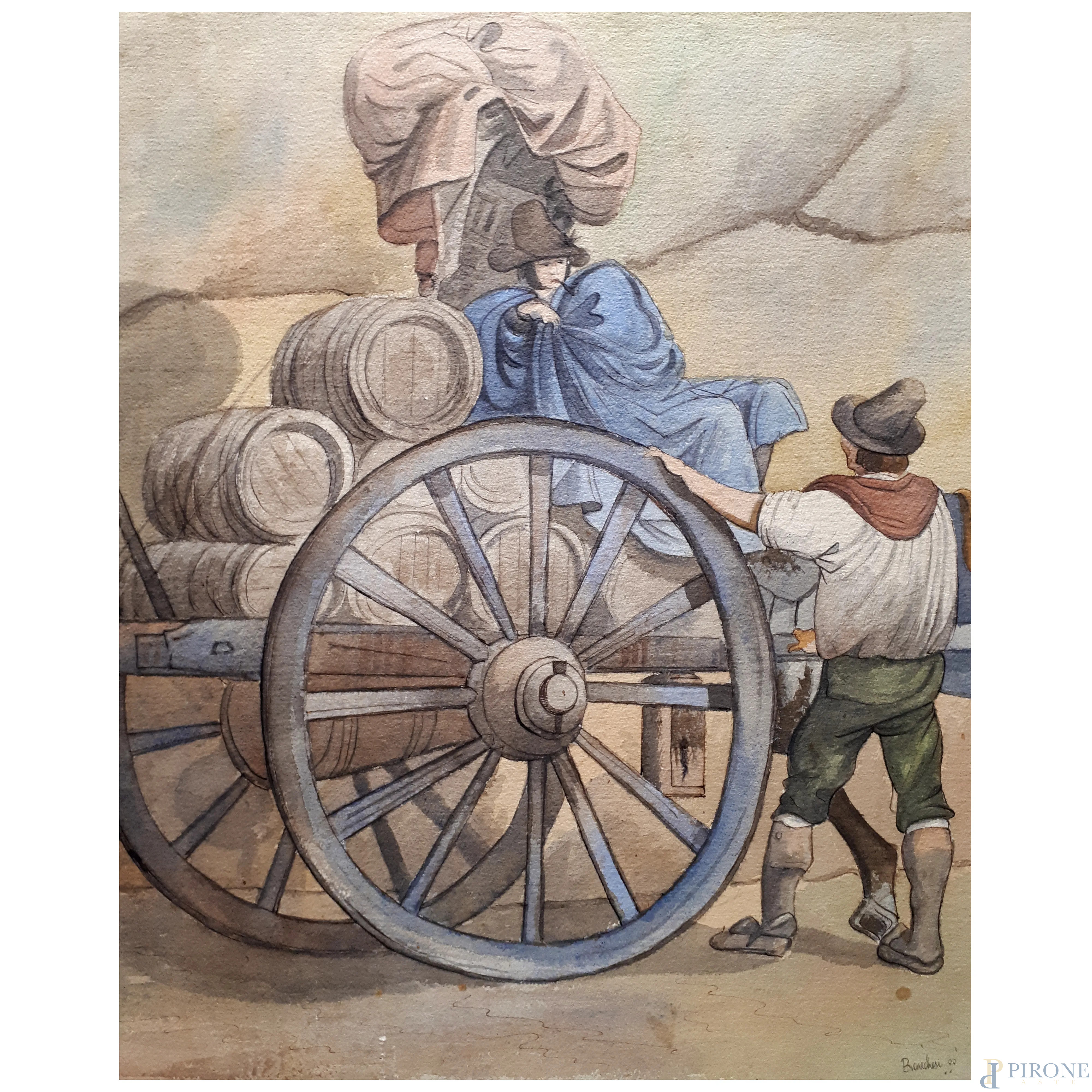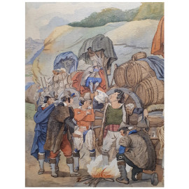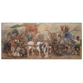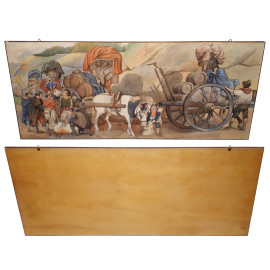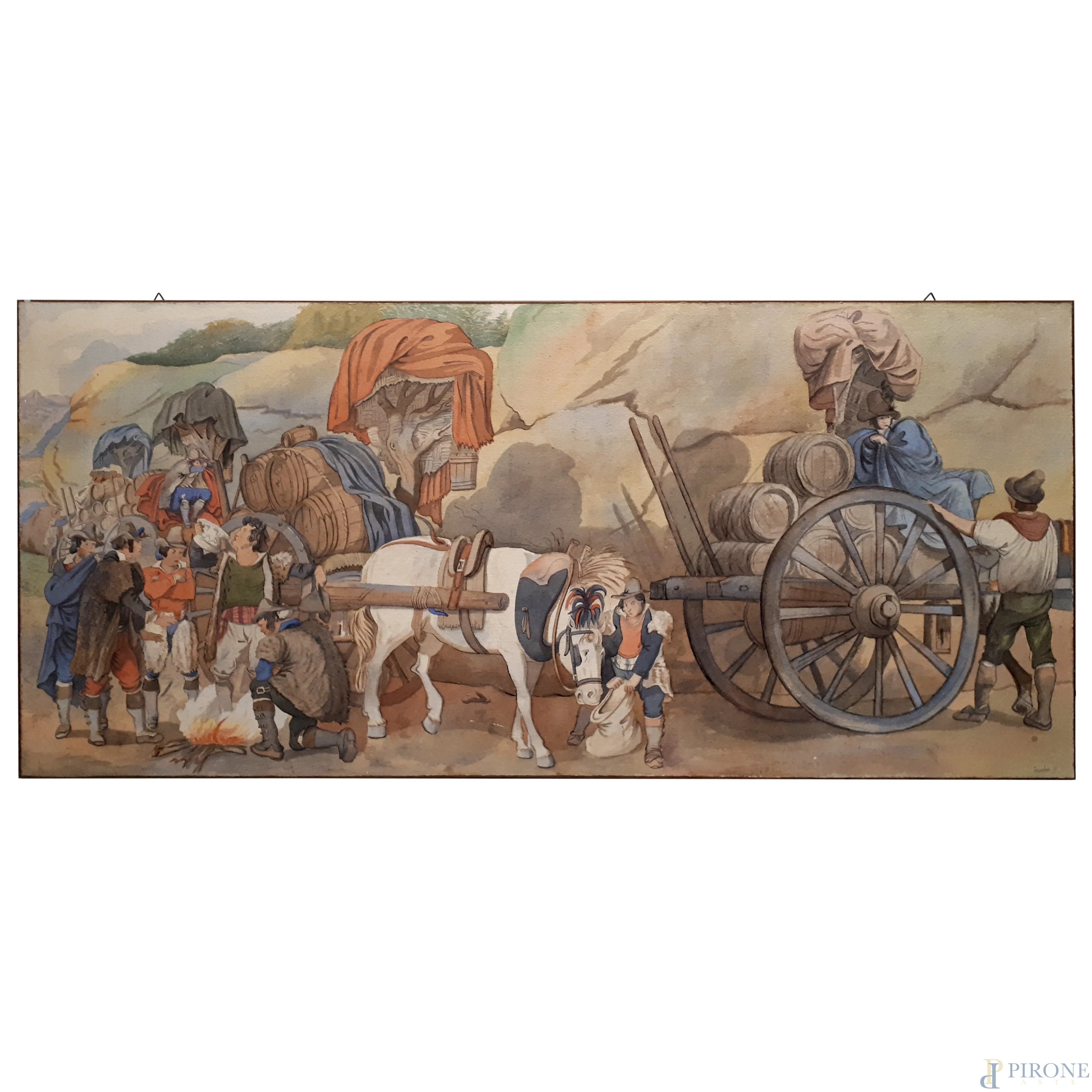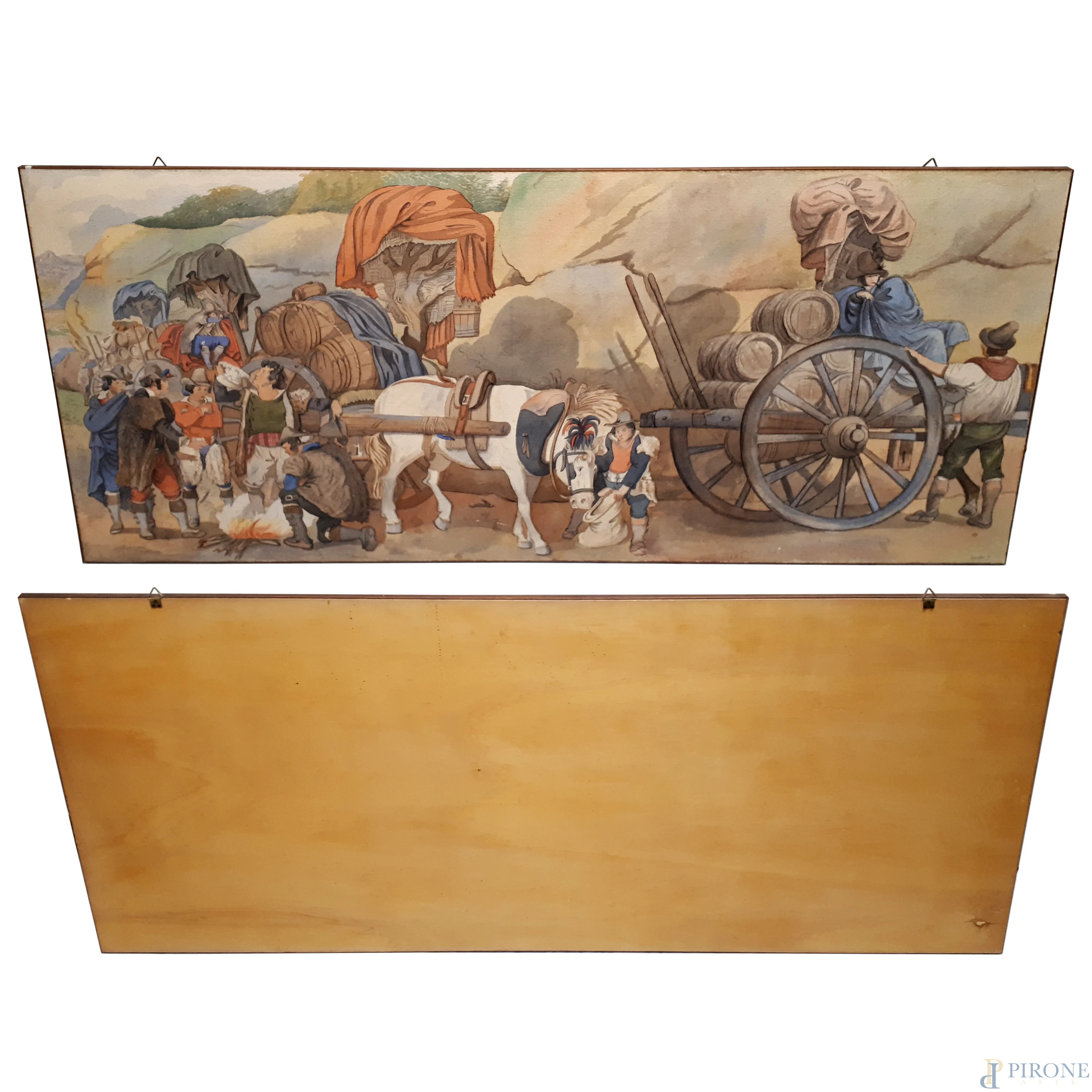 Alla maniera di Bartolomeo Pinelli, Acquarello su carta applicata su tavola raffigurante scena di vita rurale, XX sec., cm 66x152, firmato