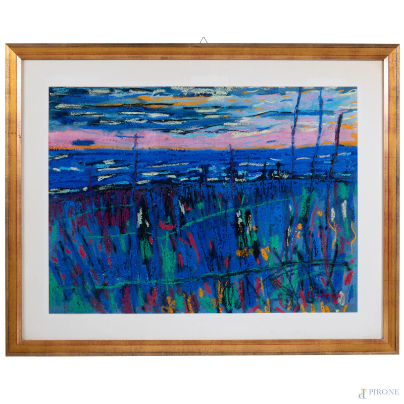 Antonio Corpora (1909-2004), Campo di grano, tecnica mista su carta, cm 68x88 compreso passepartout , firmato, titolato e datato "1988" in basso a destra, entro cornice