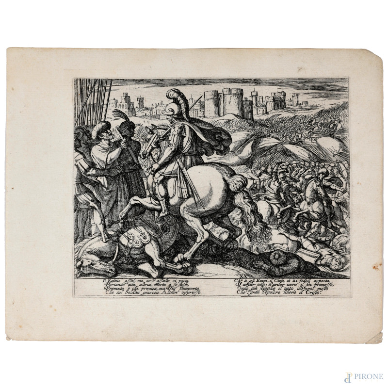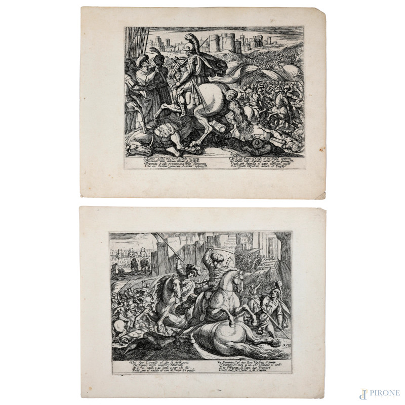 Antonio tempesta (1555 – 1630) Lotto di due aqueforti dalla serie "Le imprese di Alessandro Magno", foglio cm 19x24,5, (segni di usura, foxing)