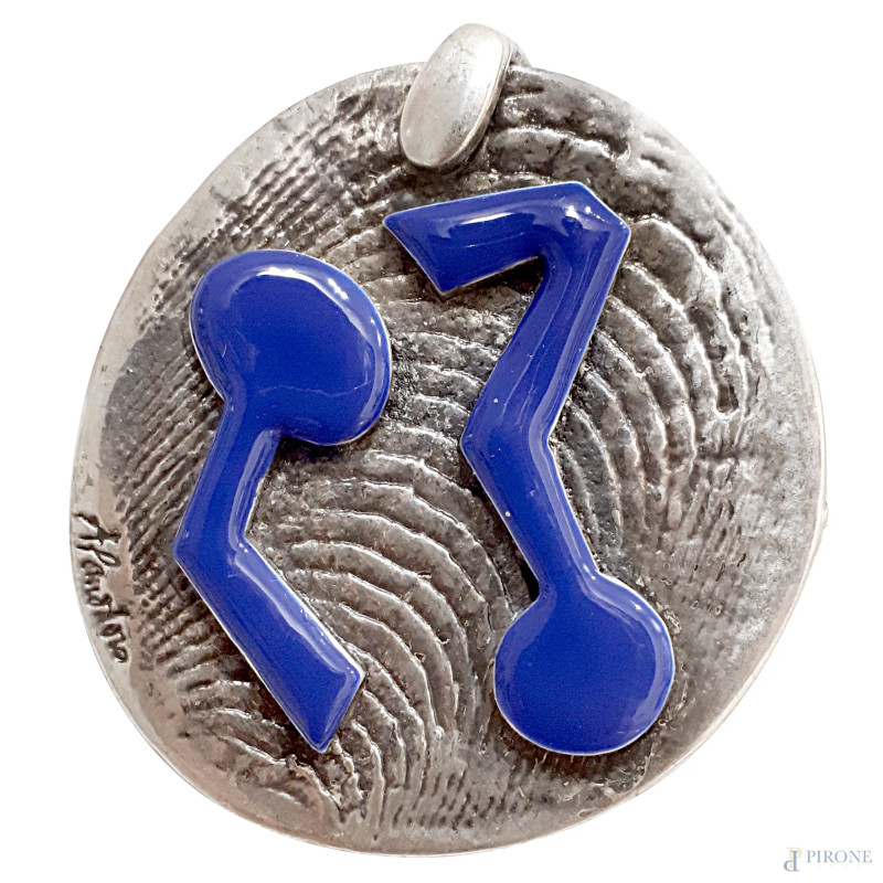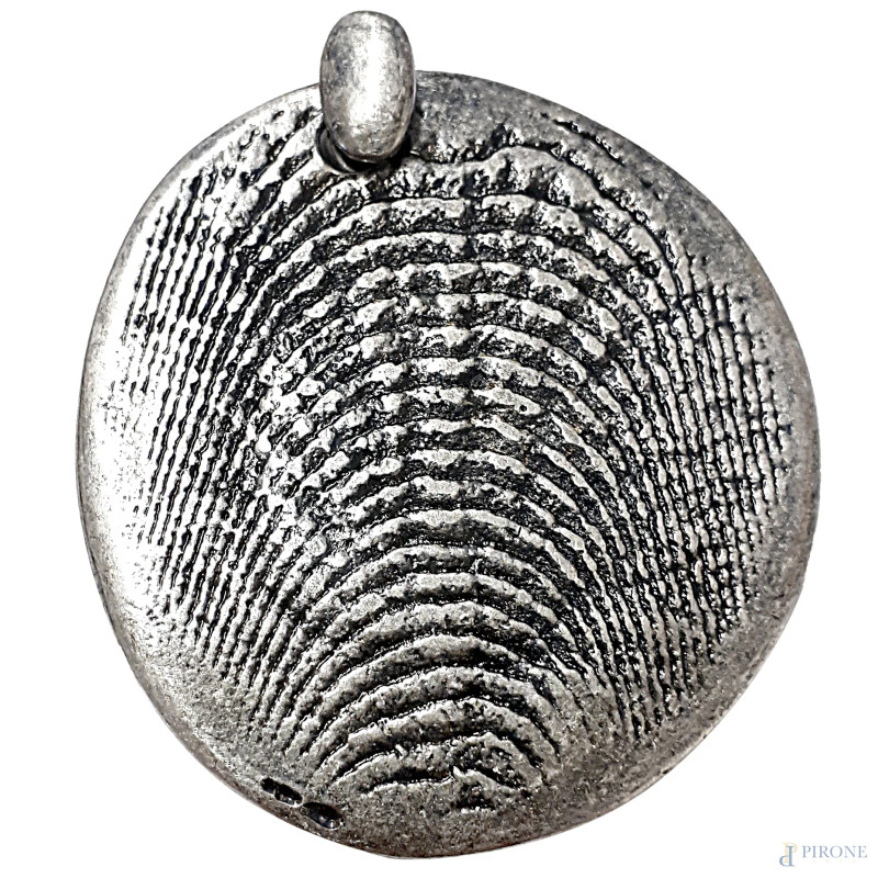 Arnaldo Pomodoro (1926-2025) Rilievo astratto, “pendant” in metallo argentato, diametro cm 4,5 circa, firmato