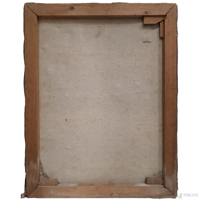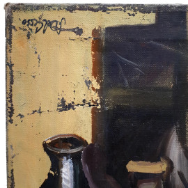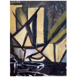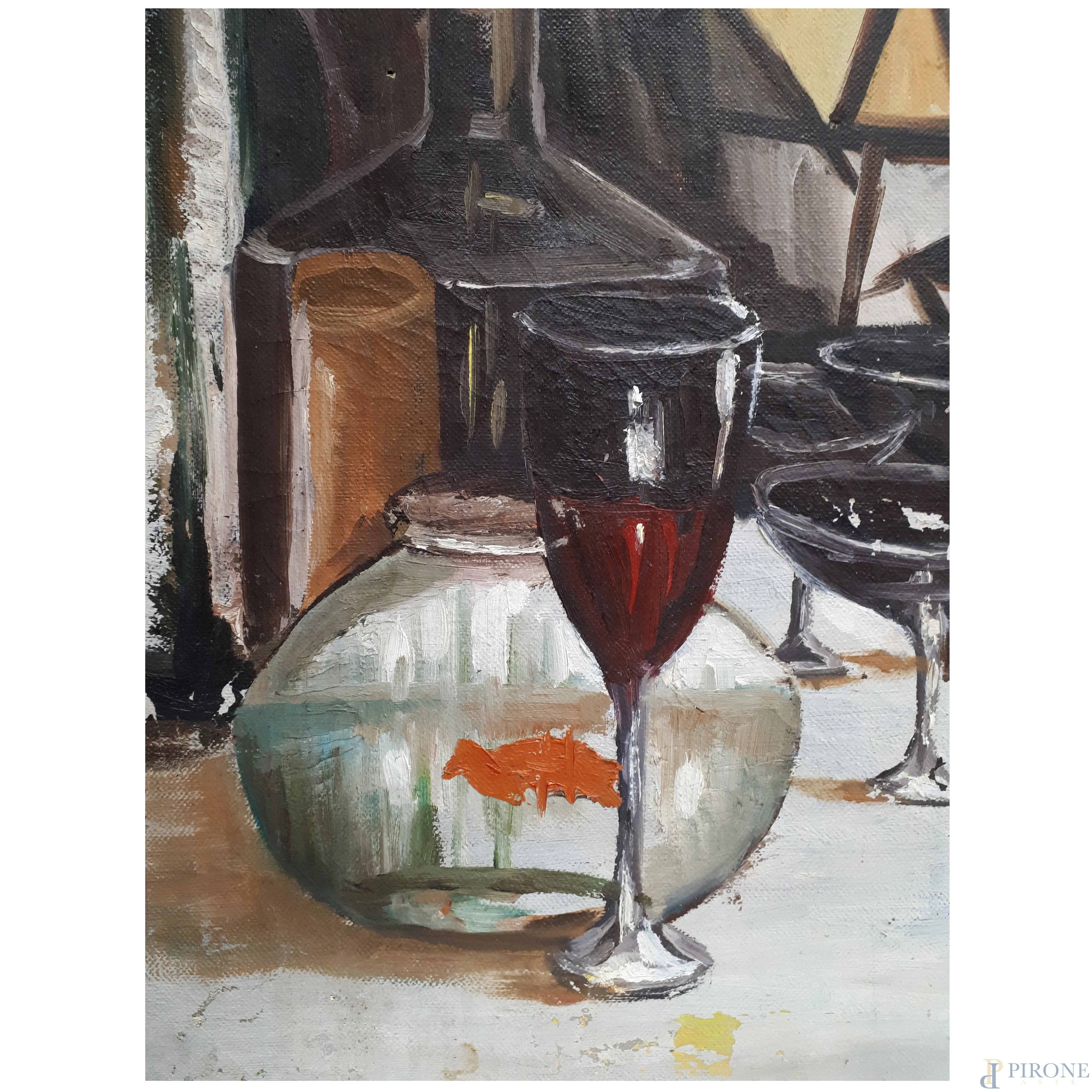 Artista post-cubista del XX secolo, Composizione con bicchieri e bottiglie, olio su tela, cm 50x40