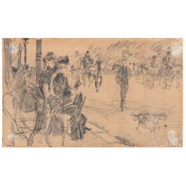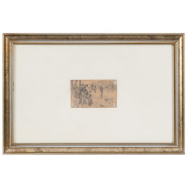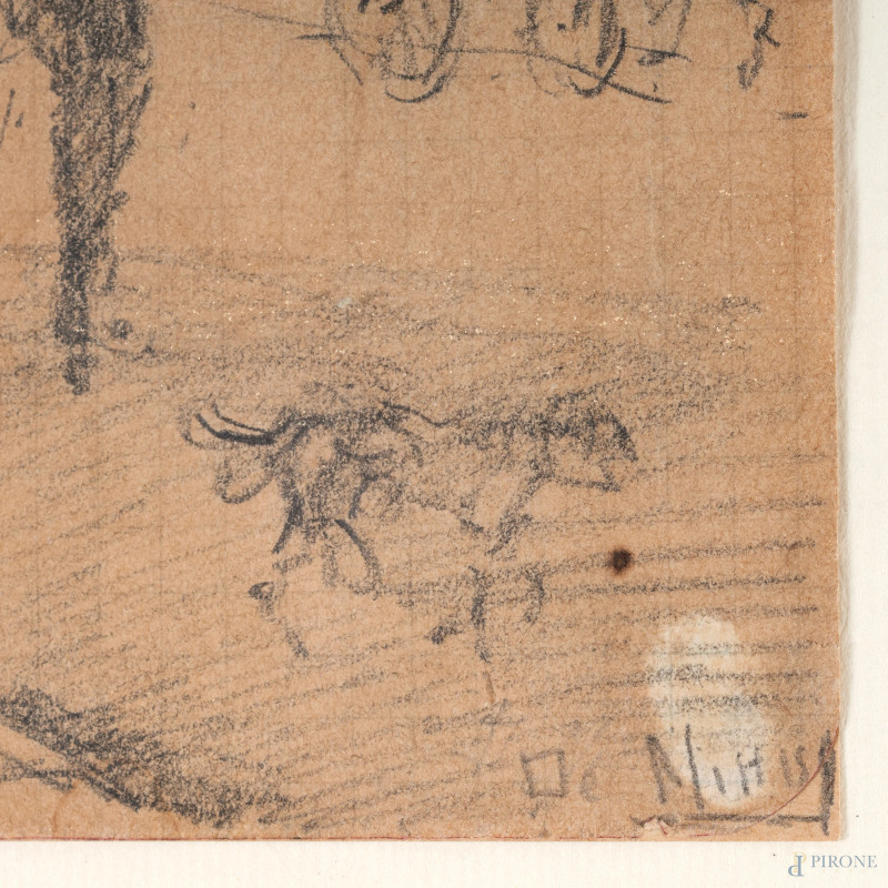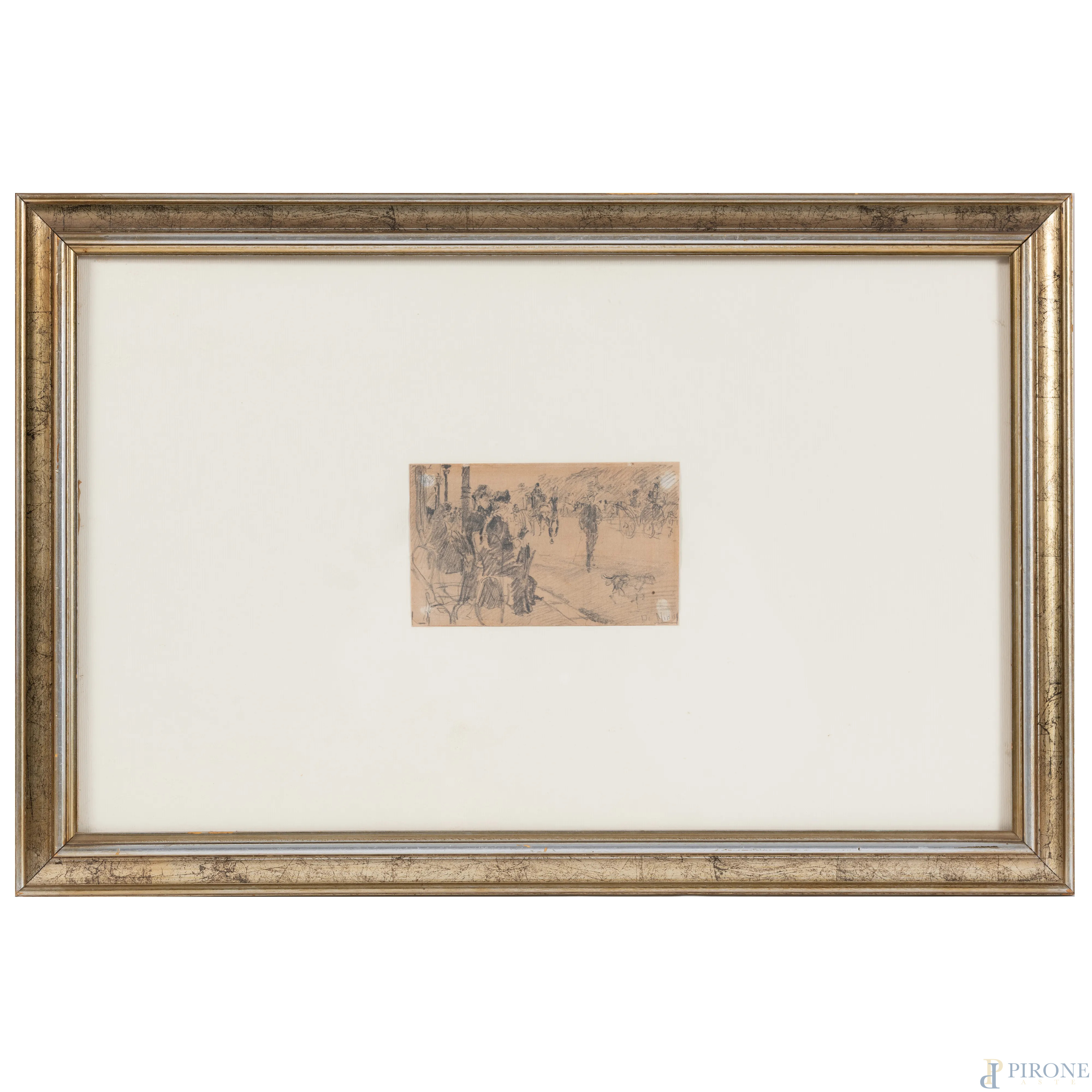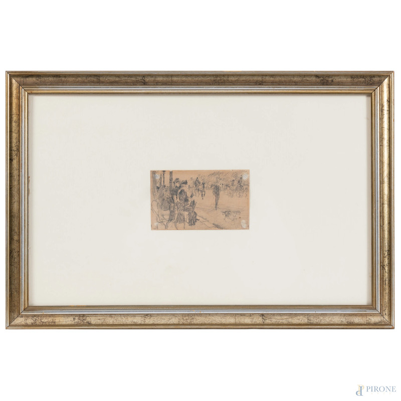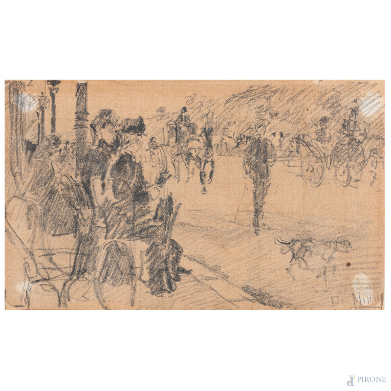 Attribuito a Giuseppe De Nittis (1846-1884), Boulevard a Parigi, disegno a tecnica mista su carta, cm 8,5x14, firmato in basso a destra. (lievi segni di usura, piccoli strappi marginali, gora in basso a destra). Corredato di dichiarazione di autenticità a firma Piero Dini
