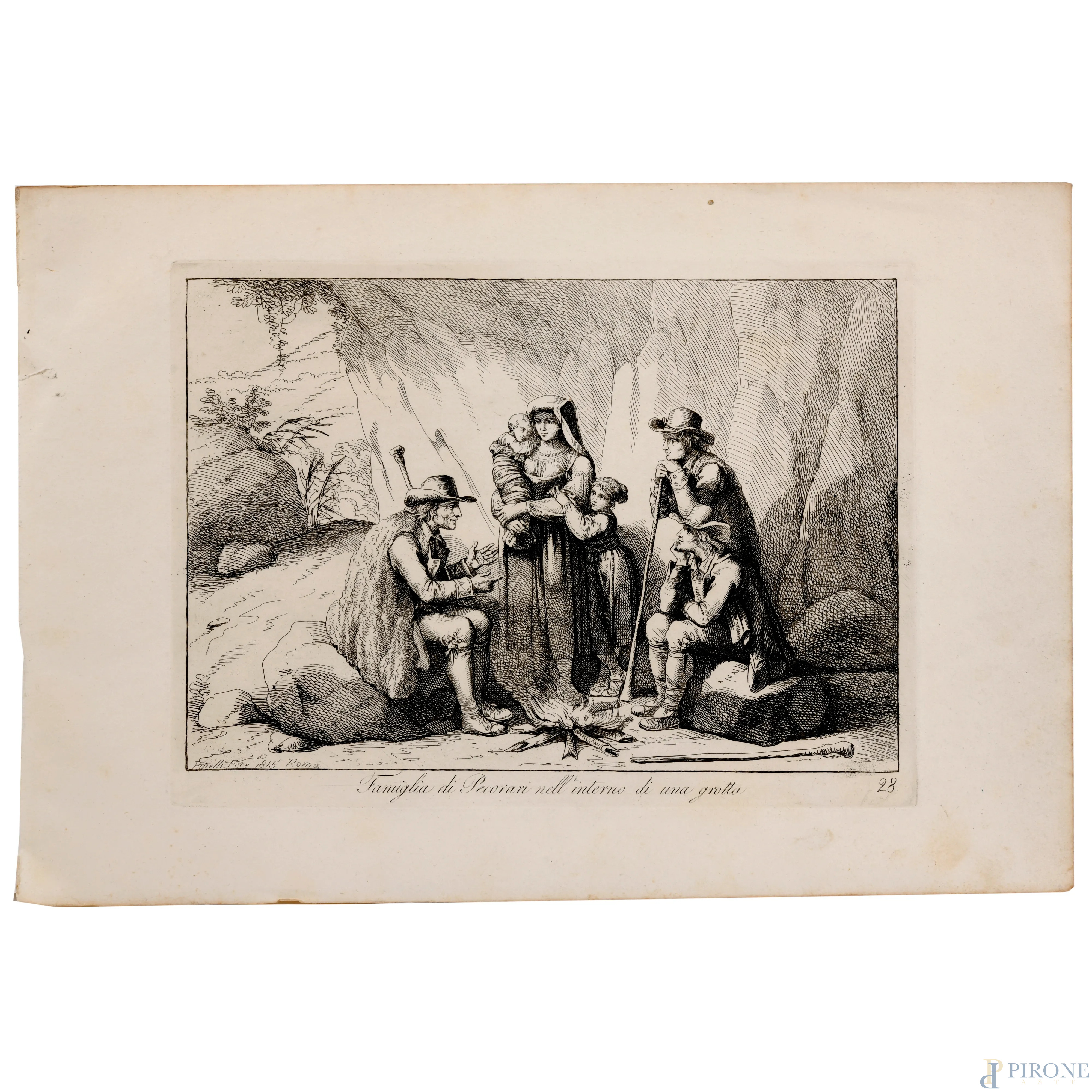 Bartolomeo Pinelli (1781 – 1835) Coppia di acqueforti raffiguranti "La via crucis dentro un cemeterio" e "Famiglia di pecorari nell'interno di una grotta", misure massime foglio cm 28x41 (tracce di umidità, foxing, strappi)