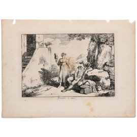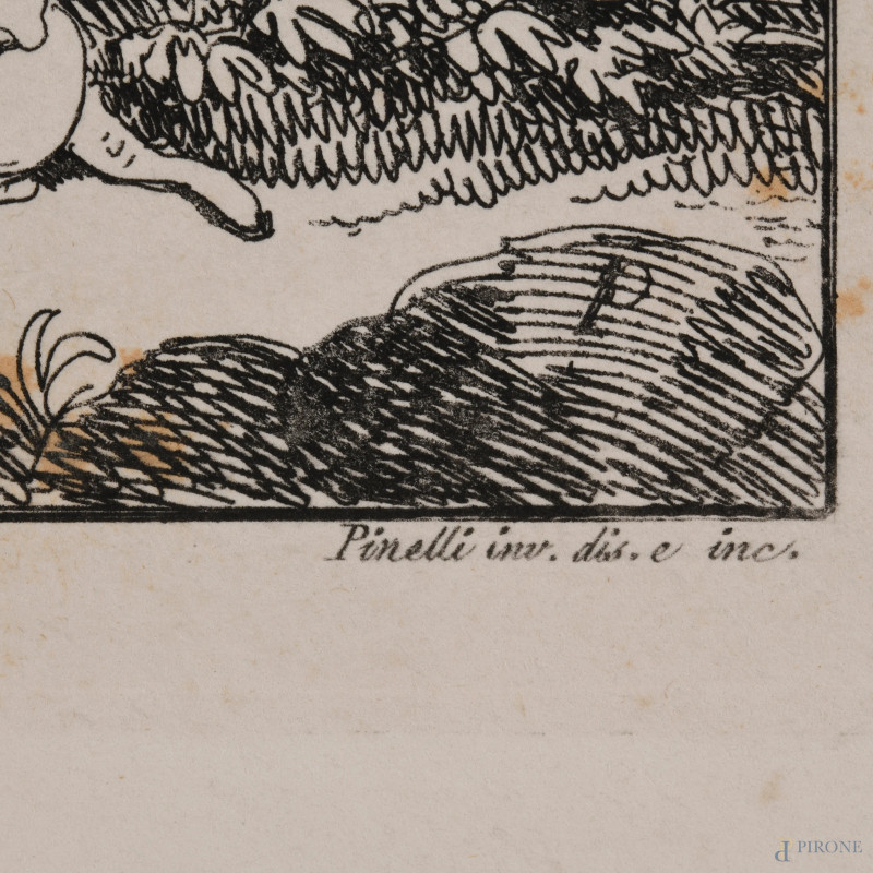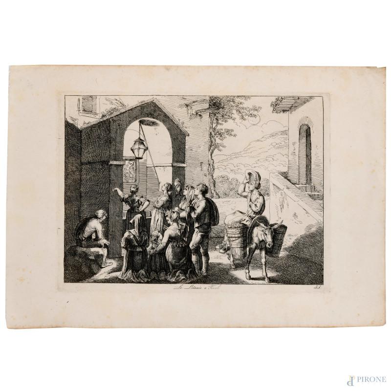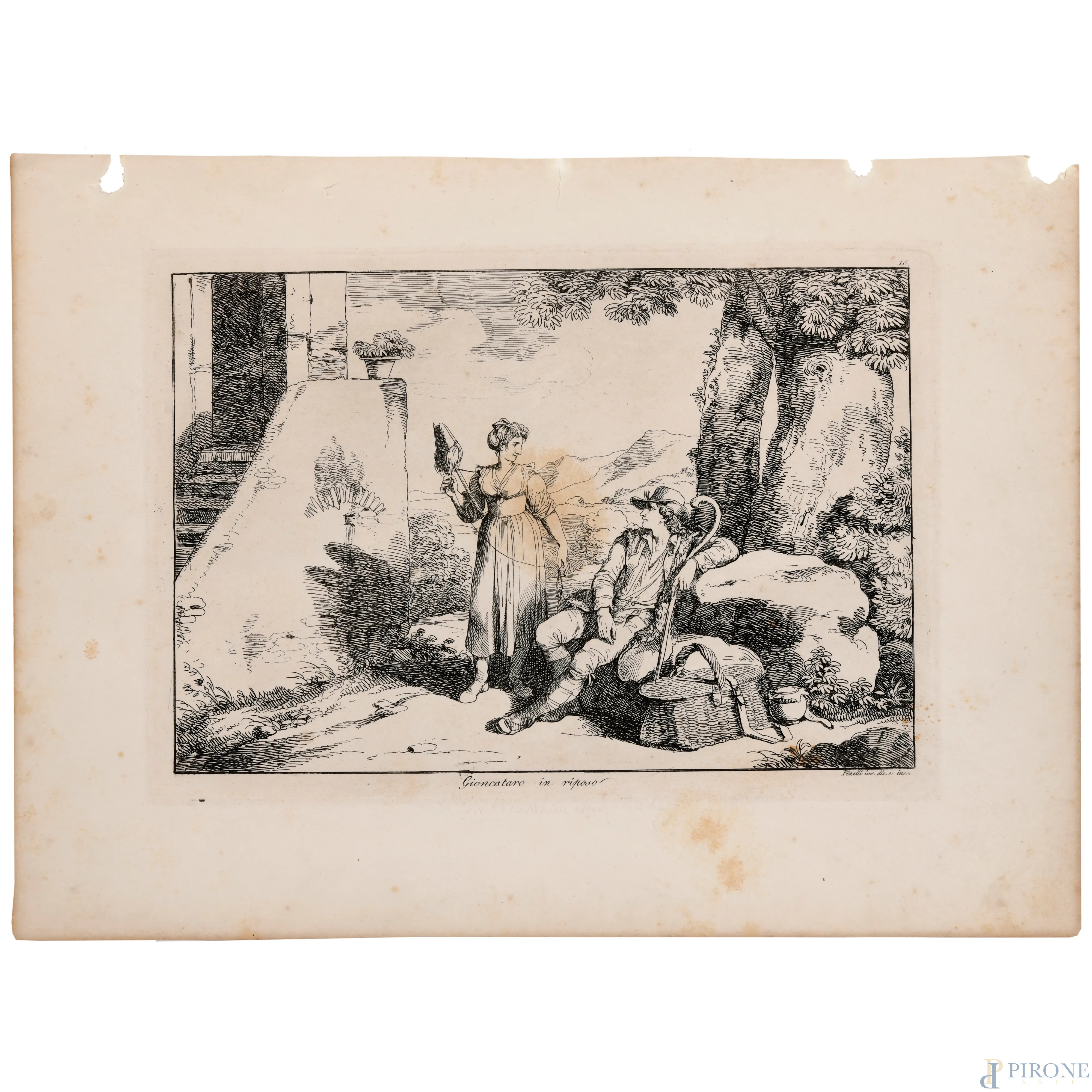 Bartolomeo Pinelli (1781 – 1835) Coppia di acqueforti, raffiguranti "Le Litanie a Tivoli" e "Gioncataro a riposo", misure massime foglio cm 28x40,5, (tracce di umidità, foxing, strappi, abrasioni)