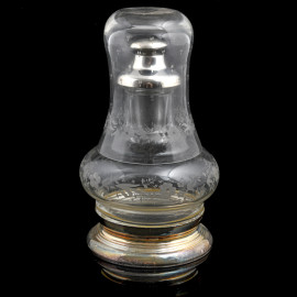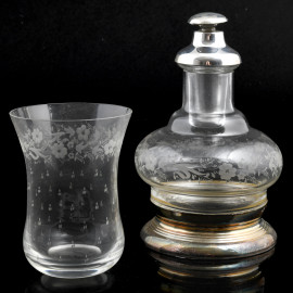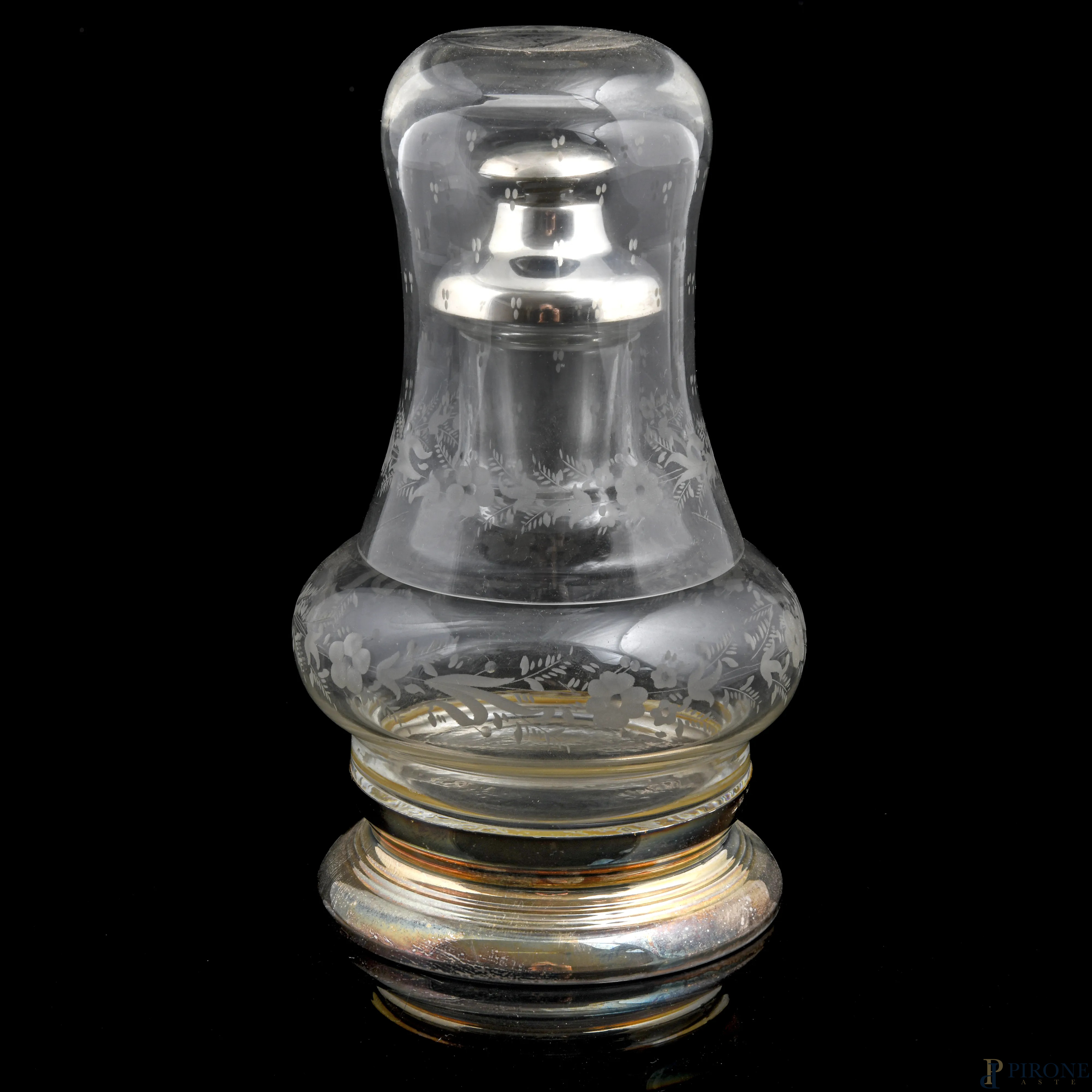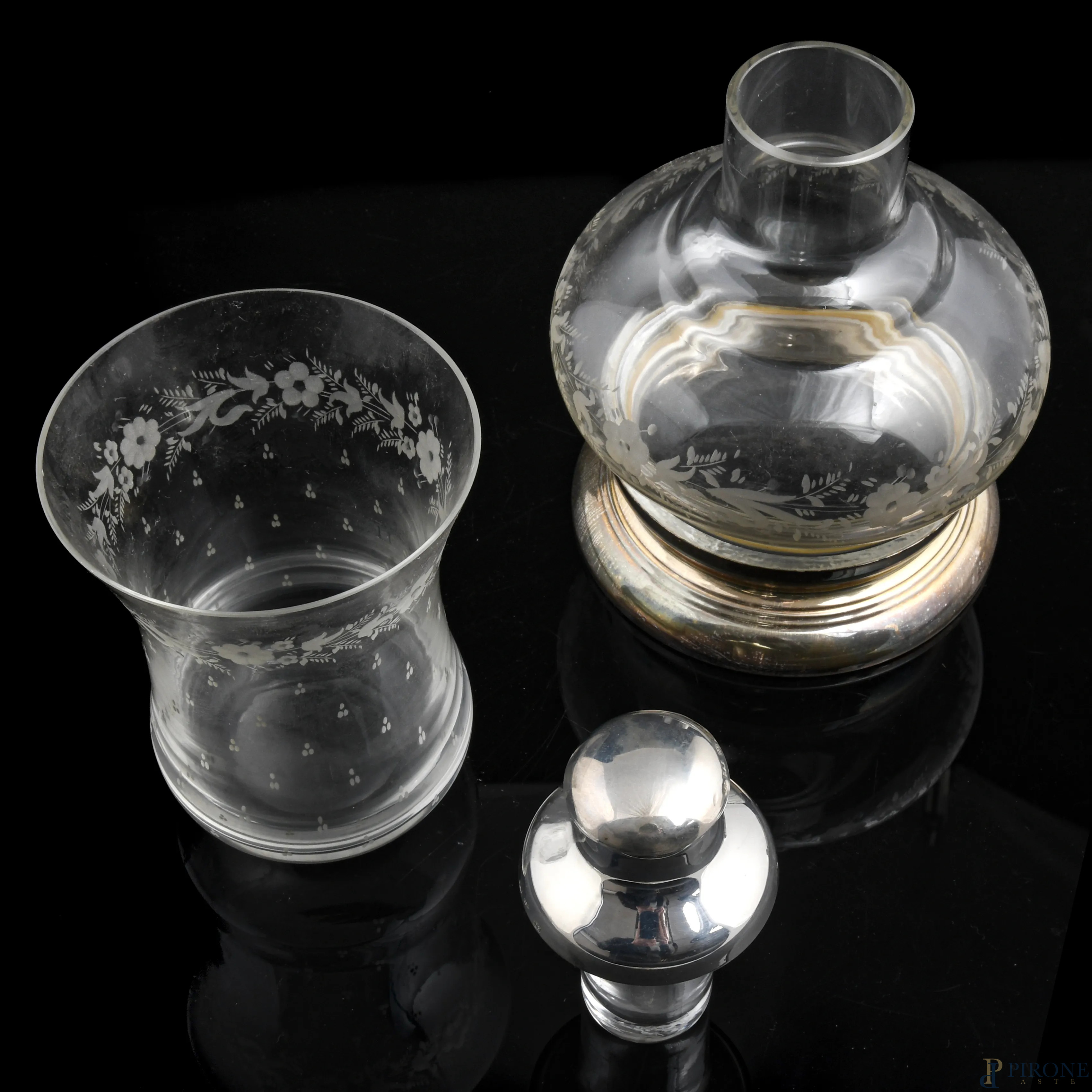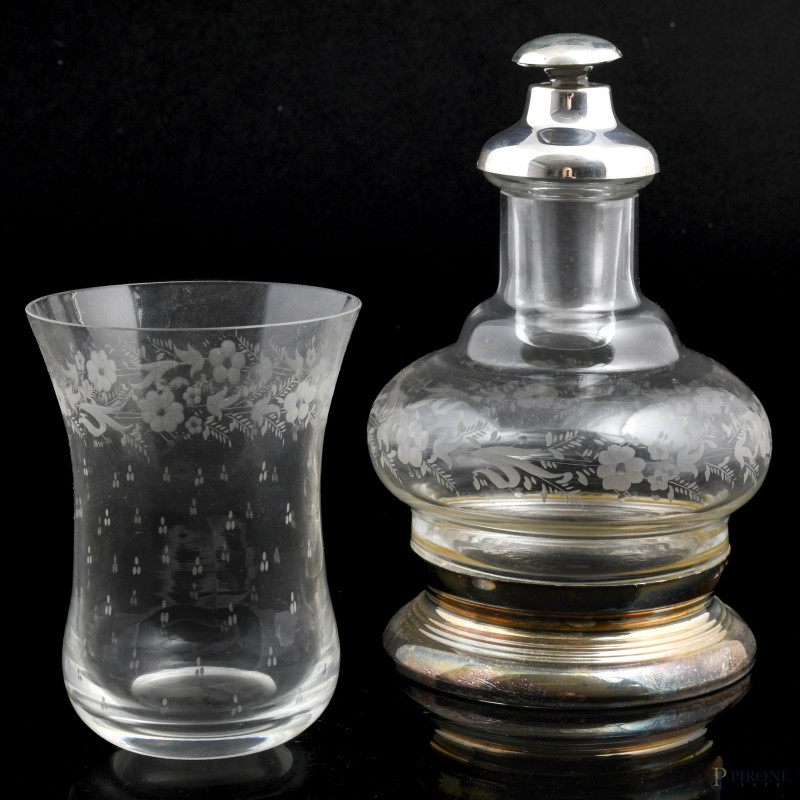 Bottiglia e bicchiere da comodino in vetro e argento, XX secolo, altezza massima cm 16, (segni di usura)