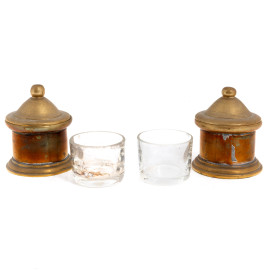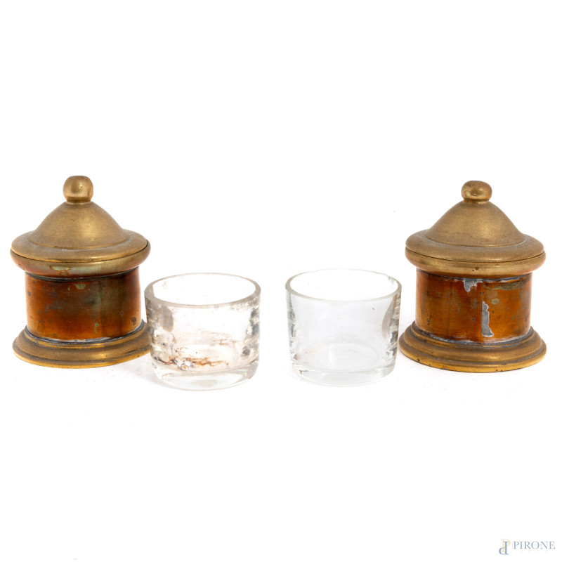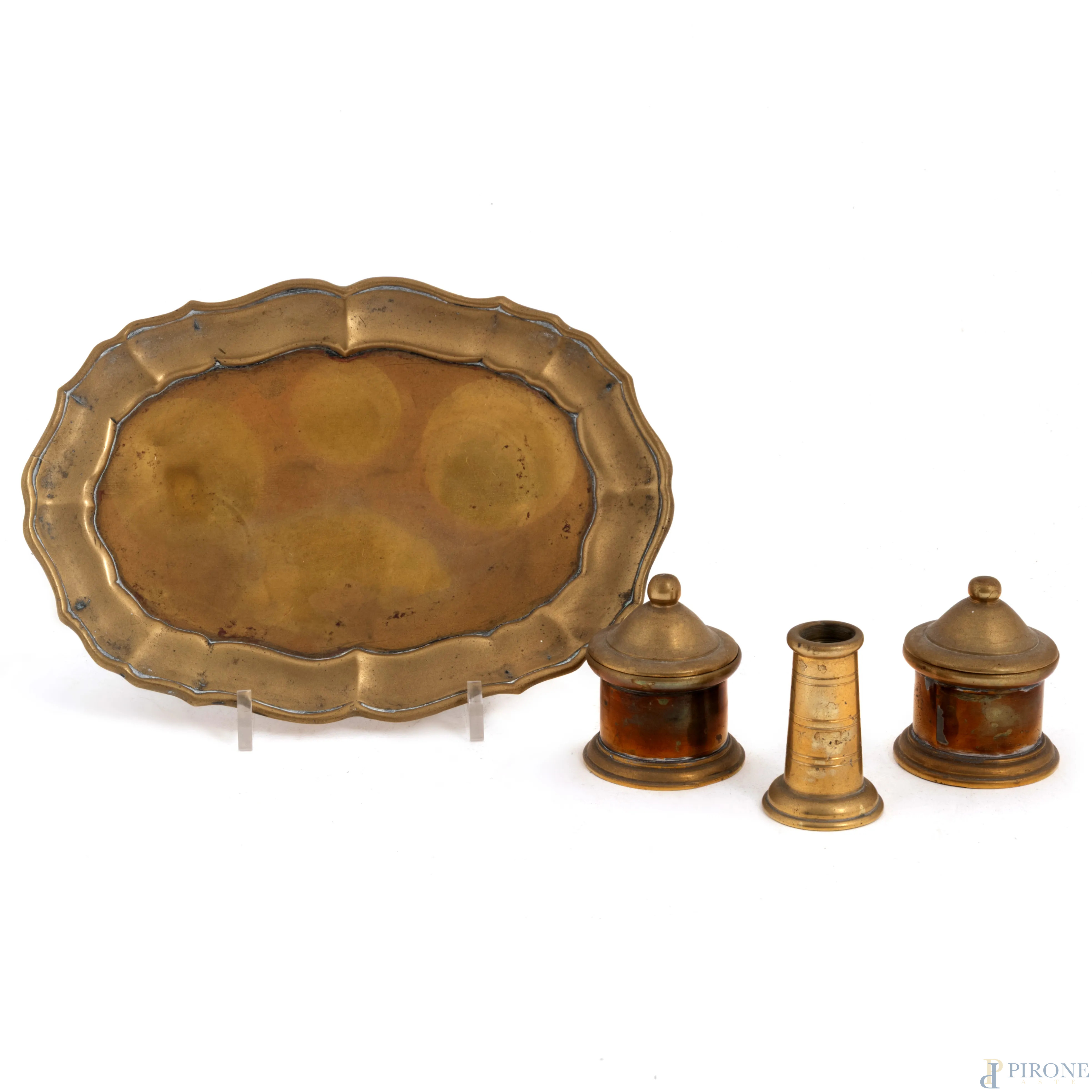 Calamaio e portapenna completo di vassoio in bronzo dorato, XX secolo, misura massima cm 22x16, (segni di usura, difettI)