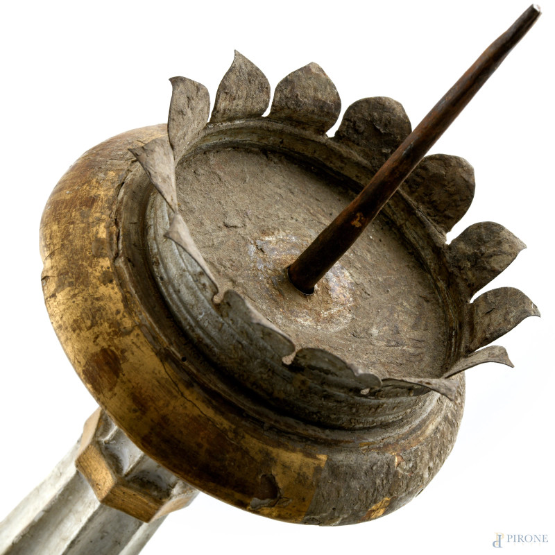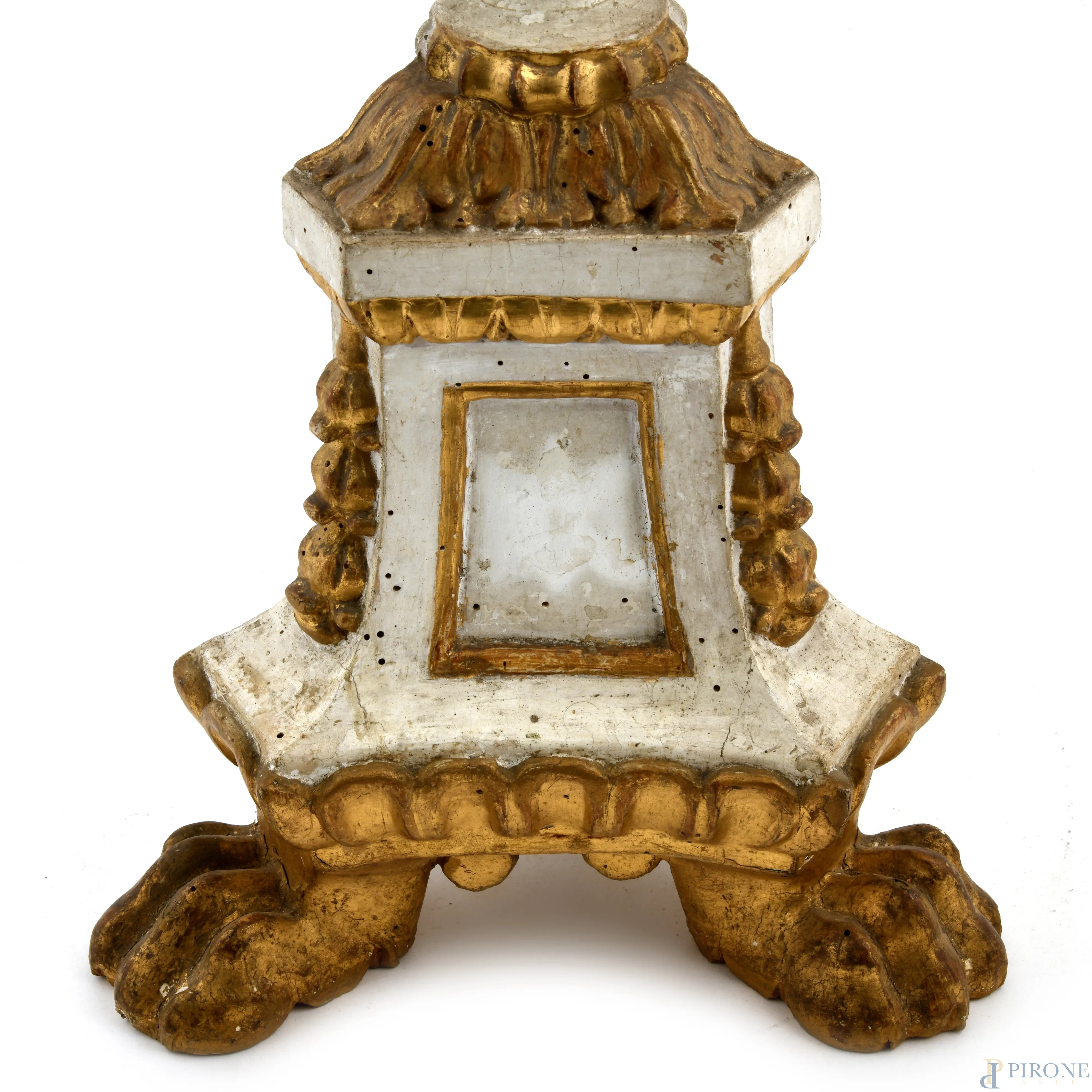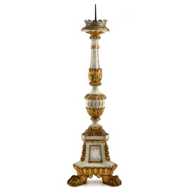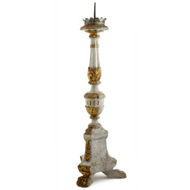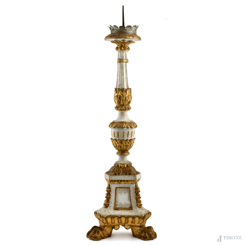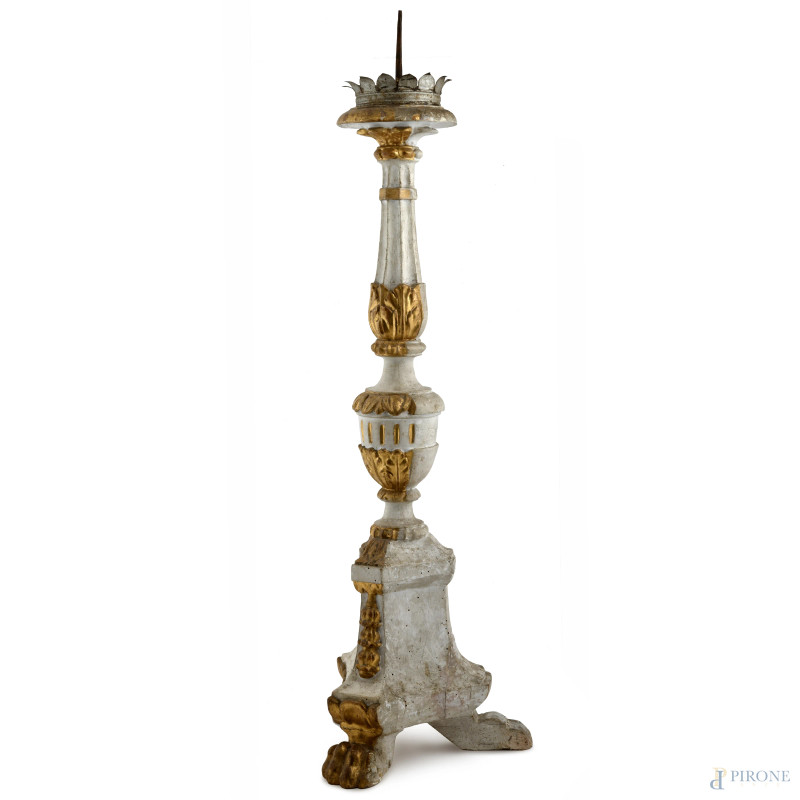 Candeliere in legno intagliato laccato e dorato poggiante su tre zampe leonine, XX secolo, altezza cm 84, (segni di usura, cadute di colore, scalfiture, fori di tarlo)
