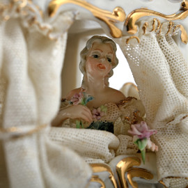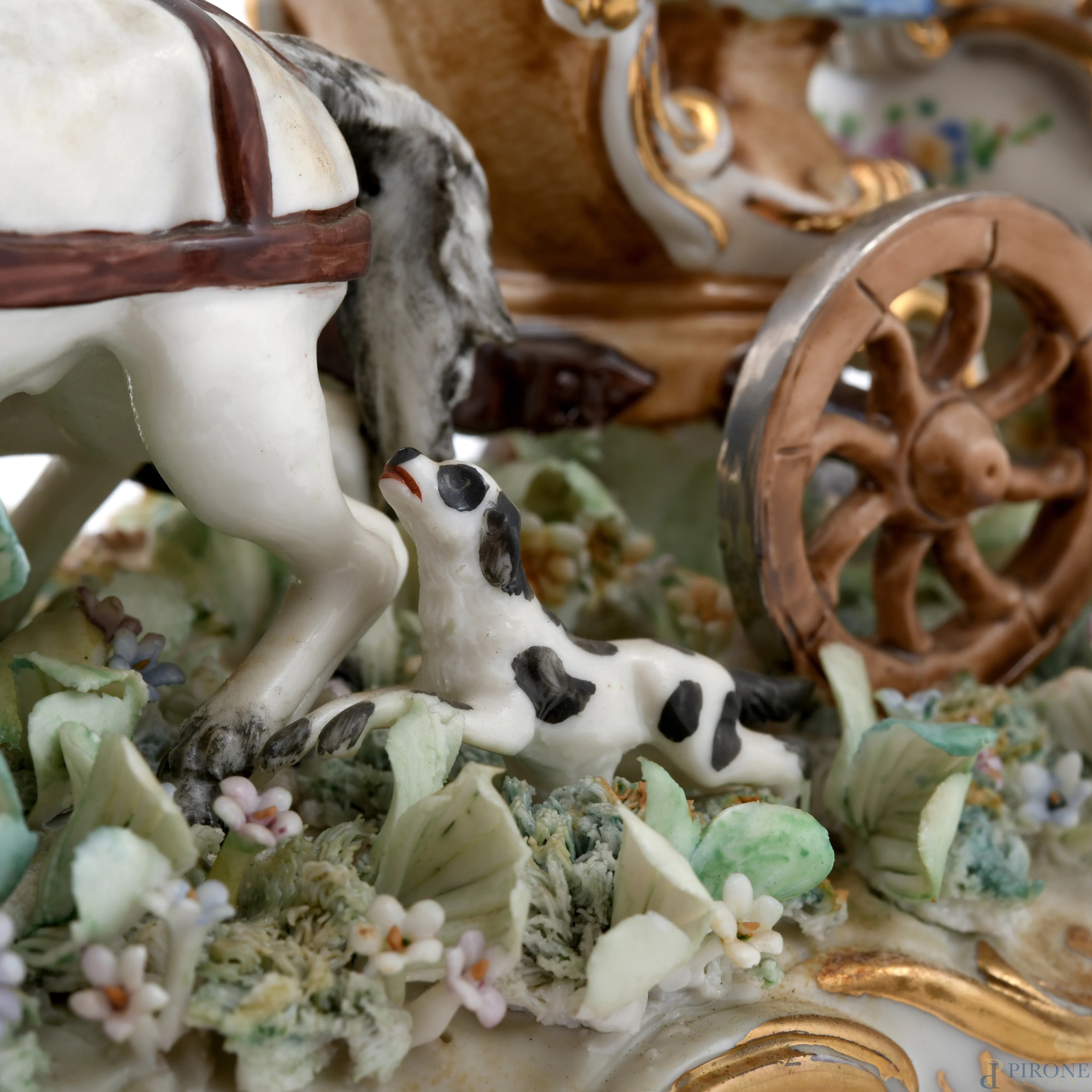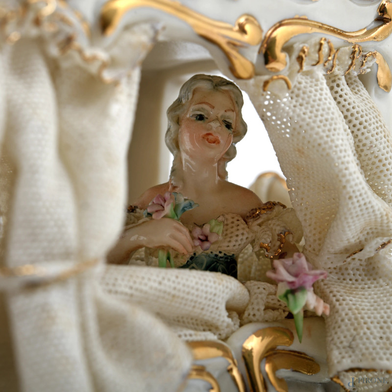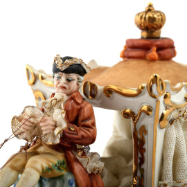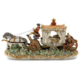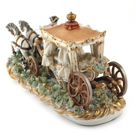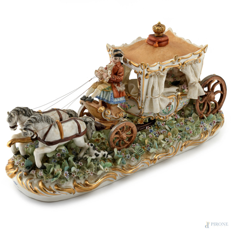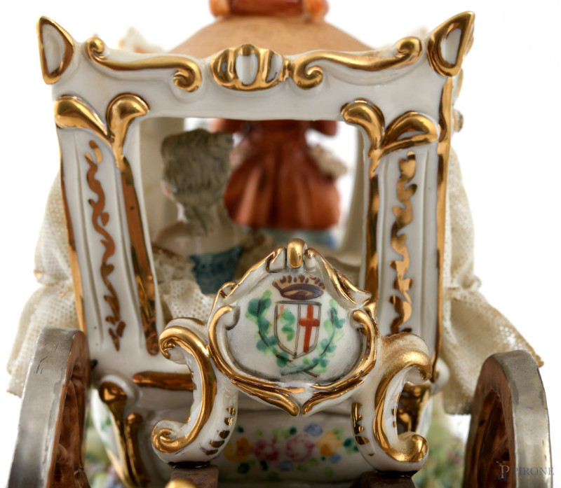 Carrozza in porcellana policroma, XX secolo, cm 18x34x13 (cadute di colore, difetti, segni di usura)