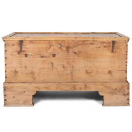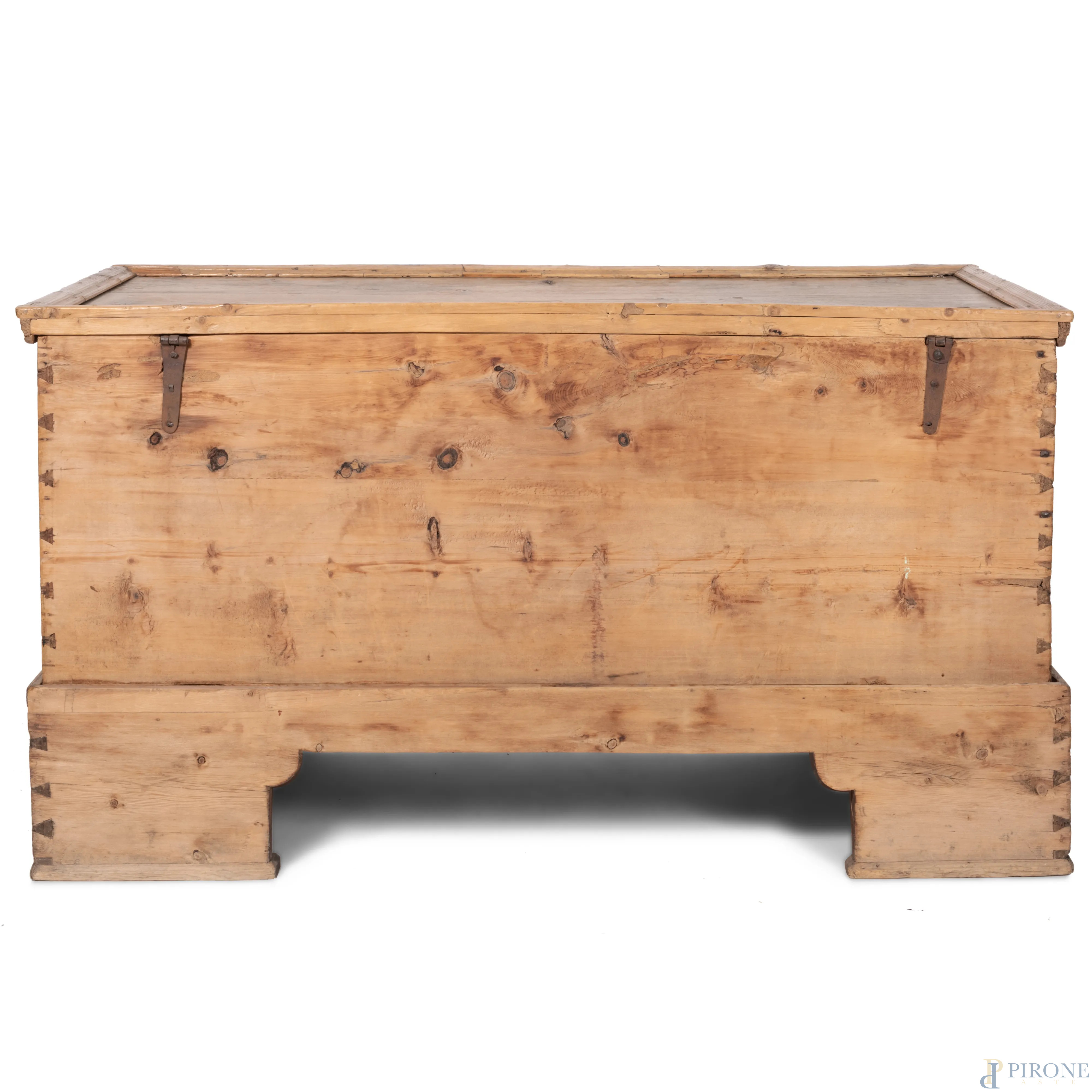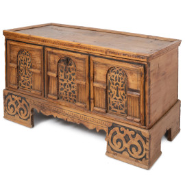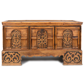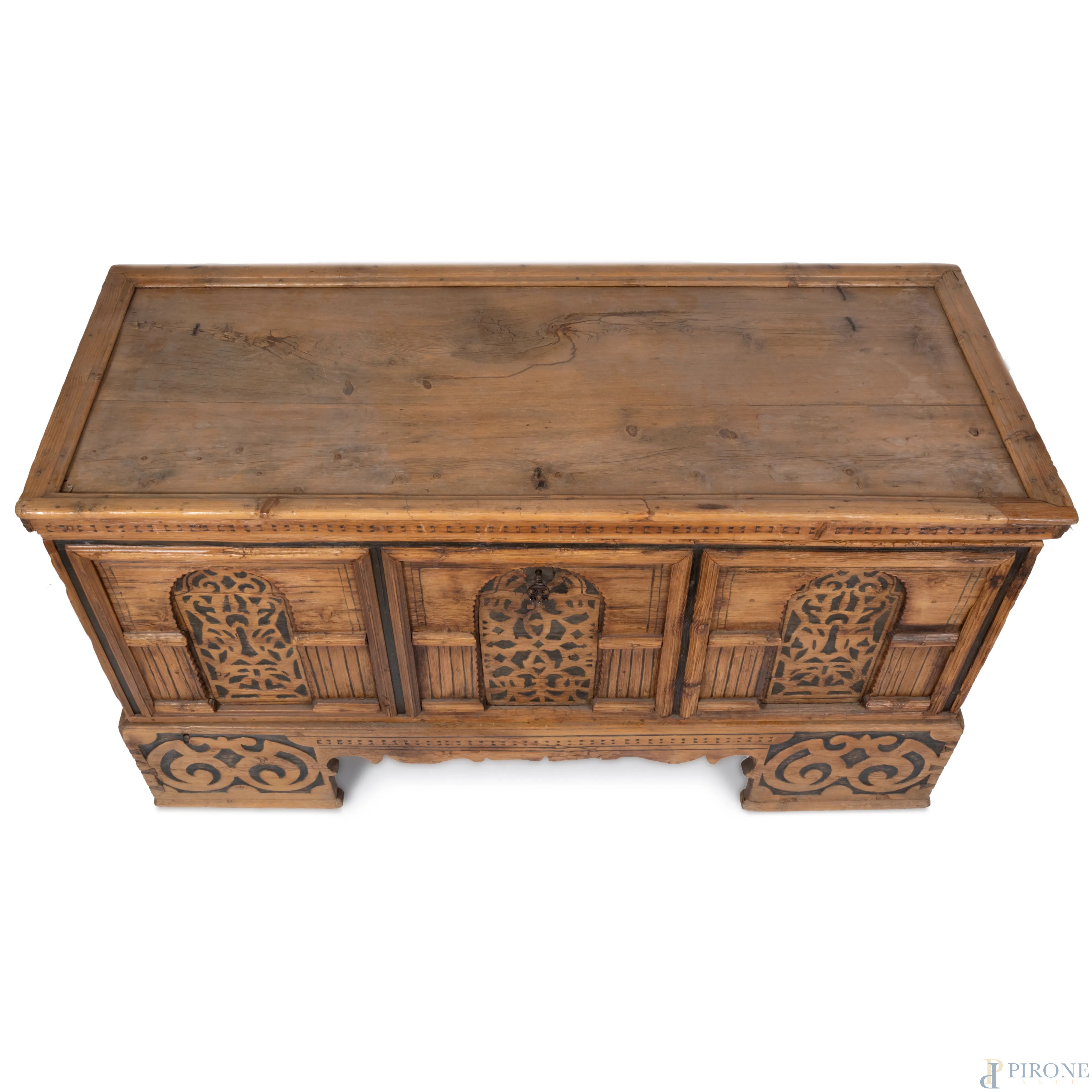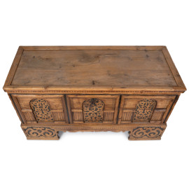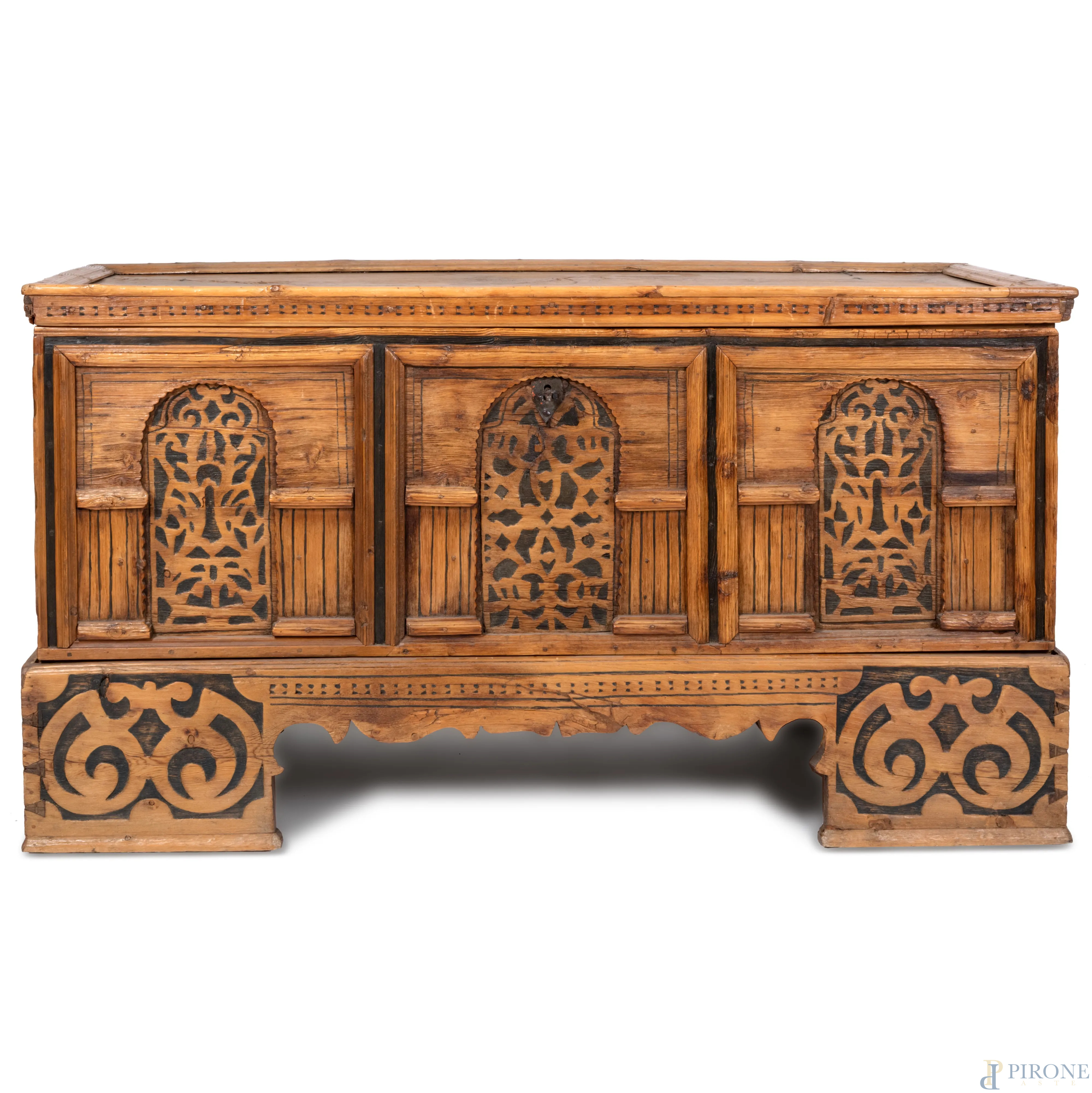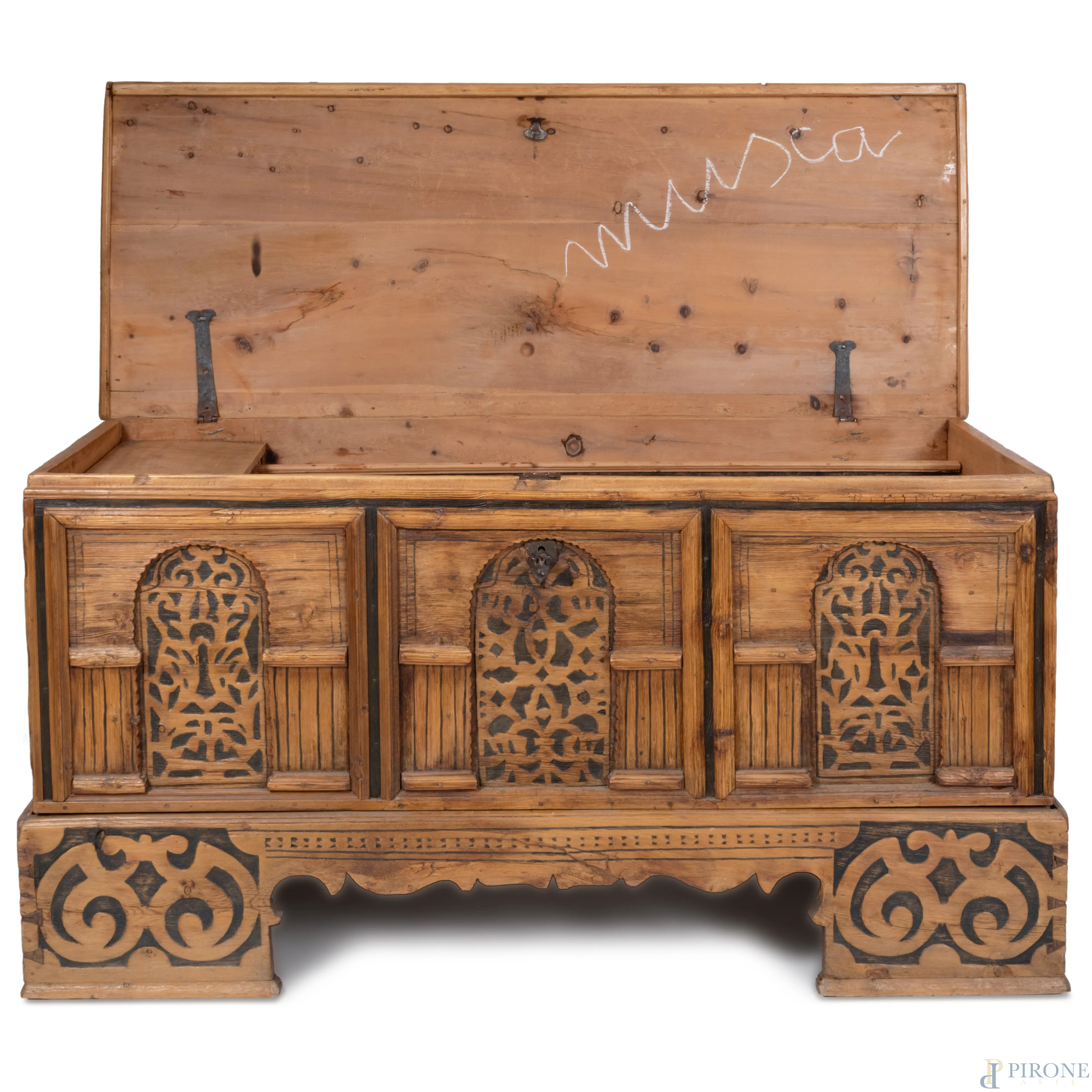 Cassapanca in legno con fronte decorato ad intaglio tripartito in tre pannelli. Piano apribile a ribalta celante vano unico. Piedi a mensola. XVIII-XIX secolo, cm 80x150x63, (segni di usura, graffi, scalfiture, difetti)