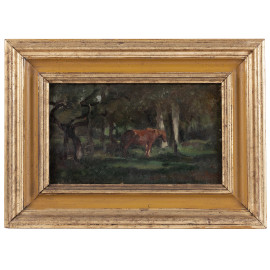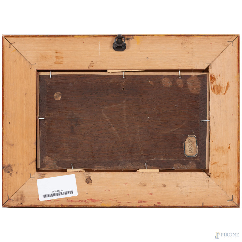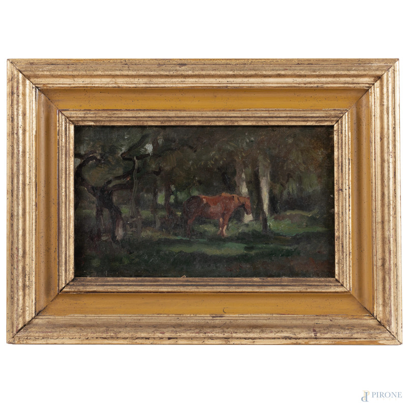 Cavallo nel bosco, XIX-XX secolo, olio su tela applicata su tavola, cm 14x25,4, entro cornice