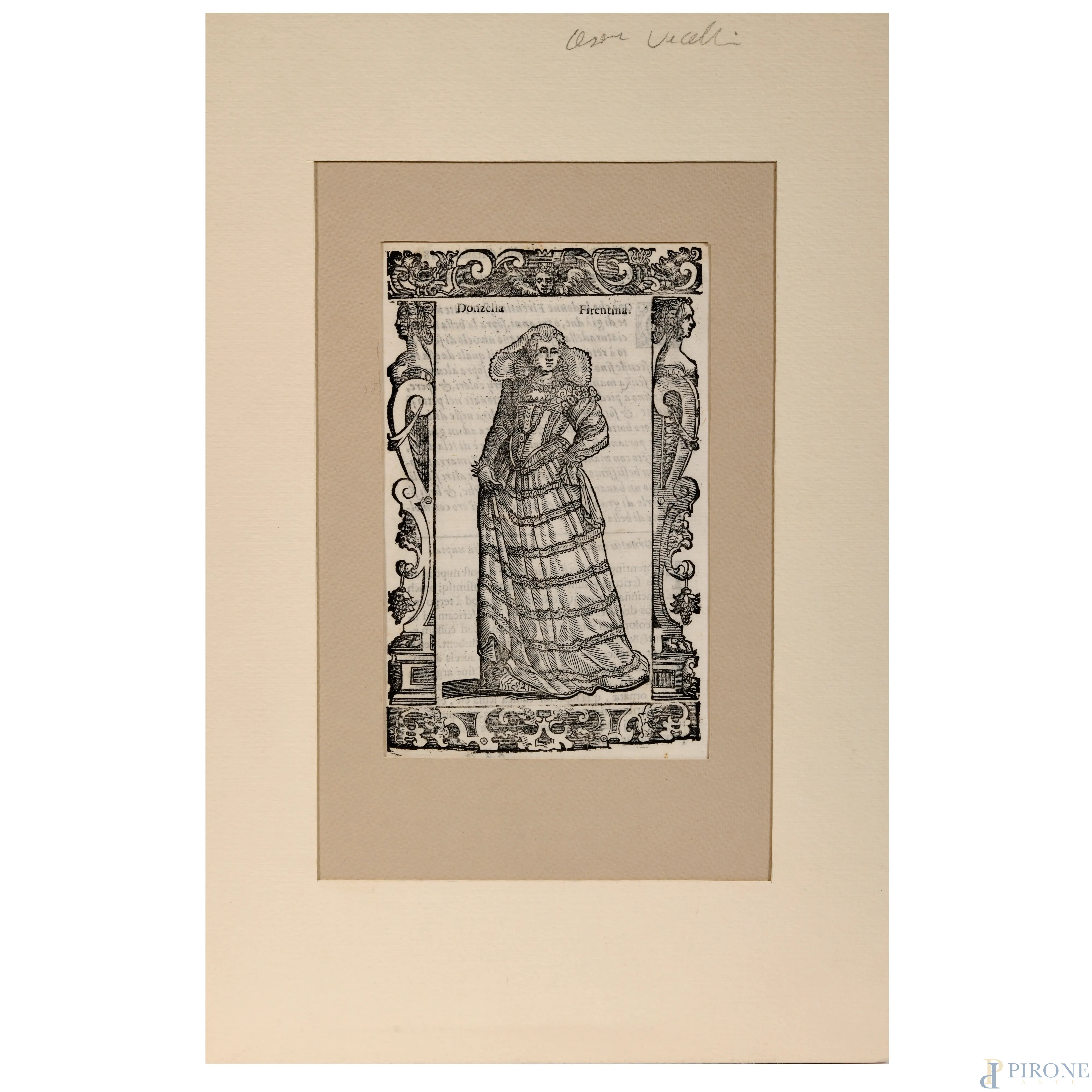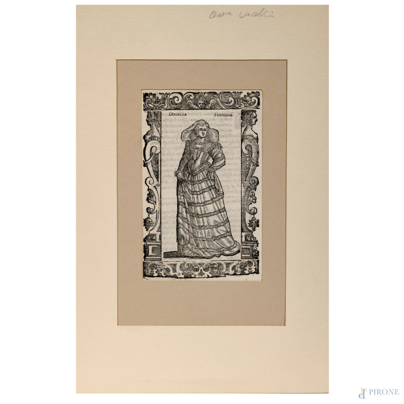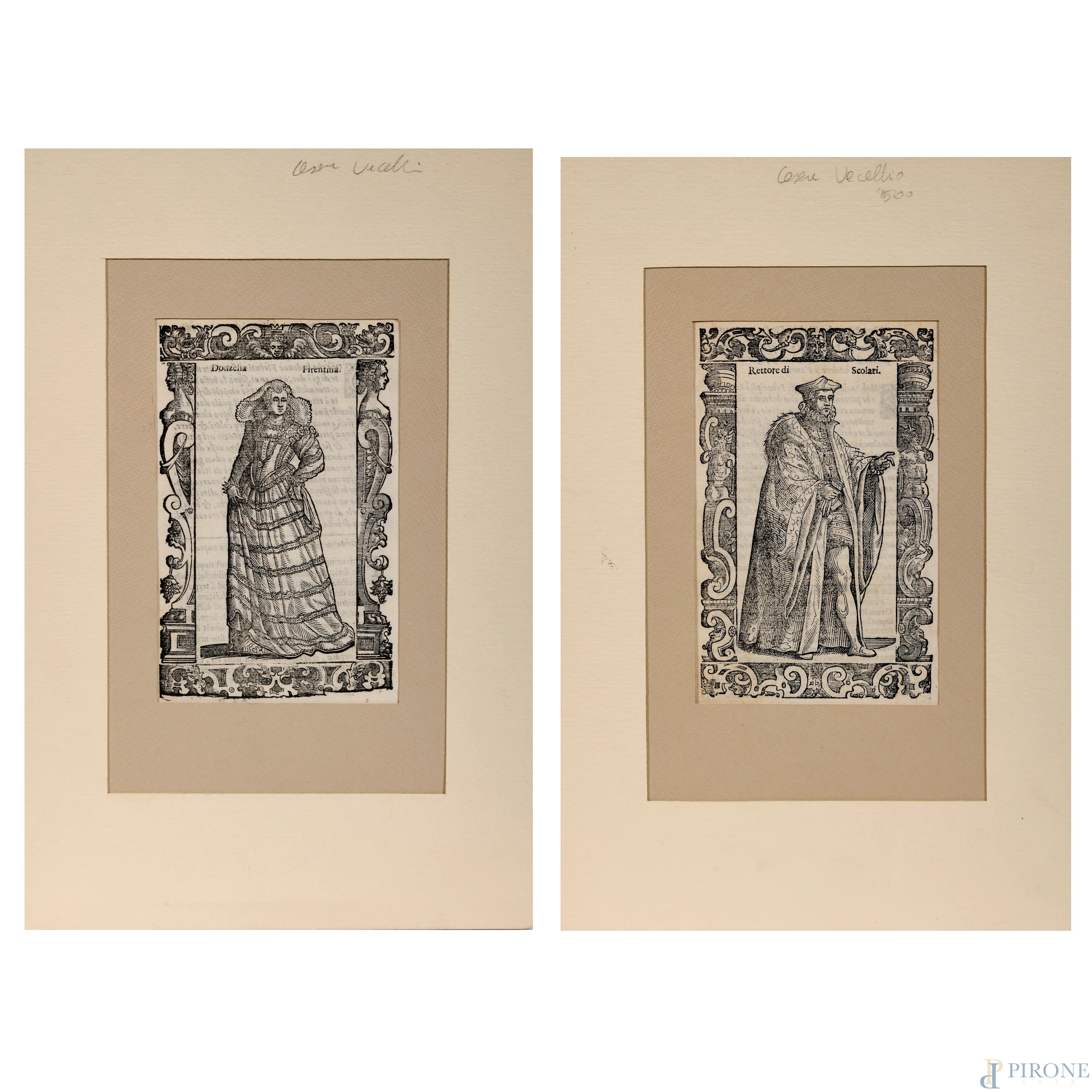 Cesare Vecellio (1521 – 1601) Lotto di due incisioni tratte dall'edizione cinquecentesca "De gli habiti antichi et moderni di diverse parti del mondo di Cesare Vecellio", xilografia, foglio cm 17x11,5, (segni di usura ai margini)