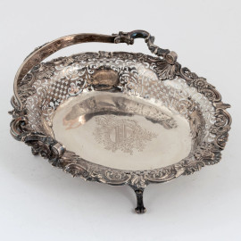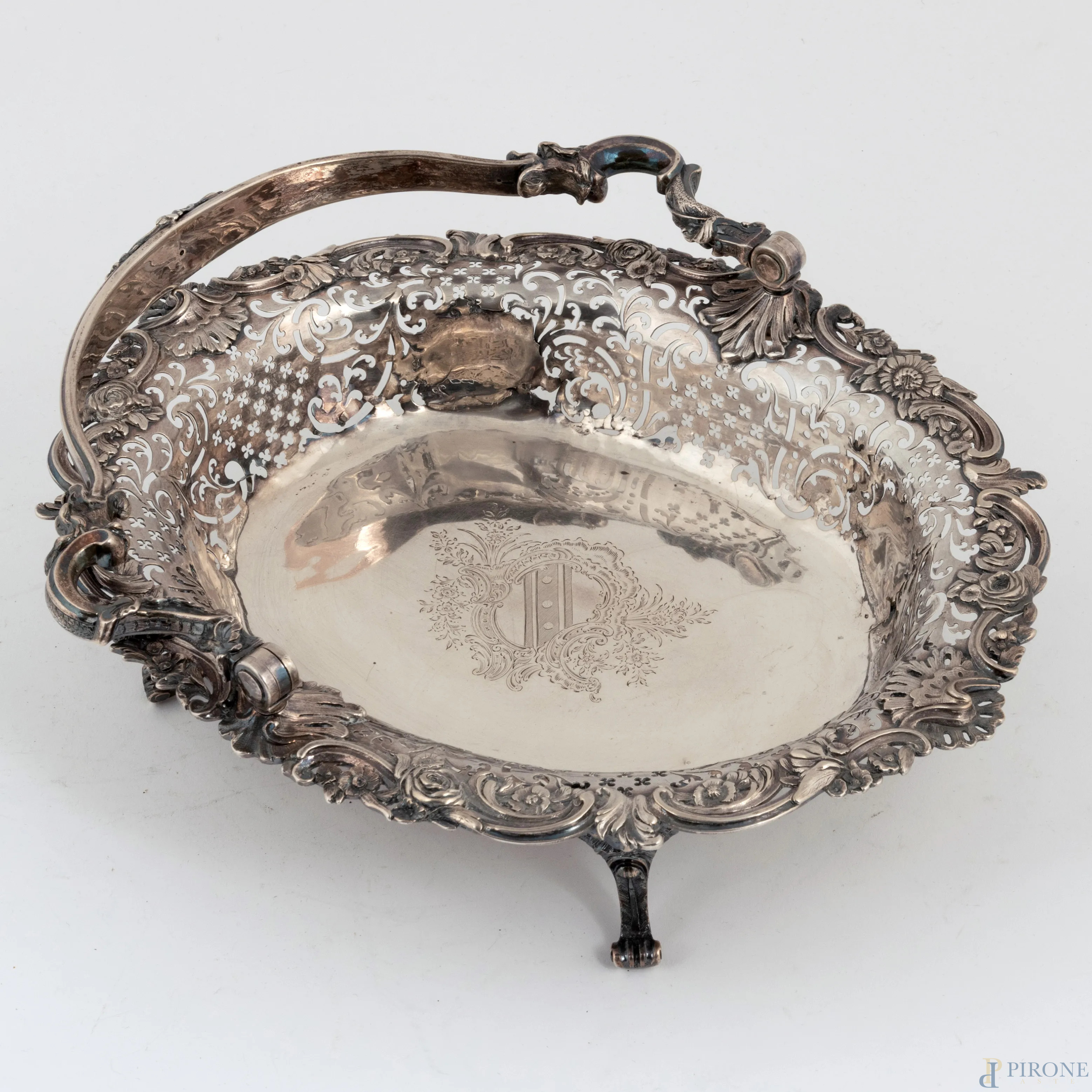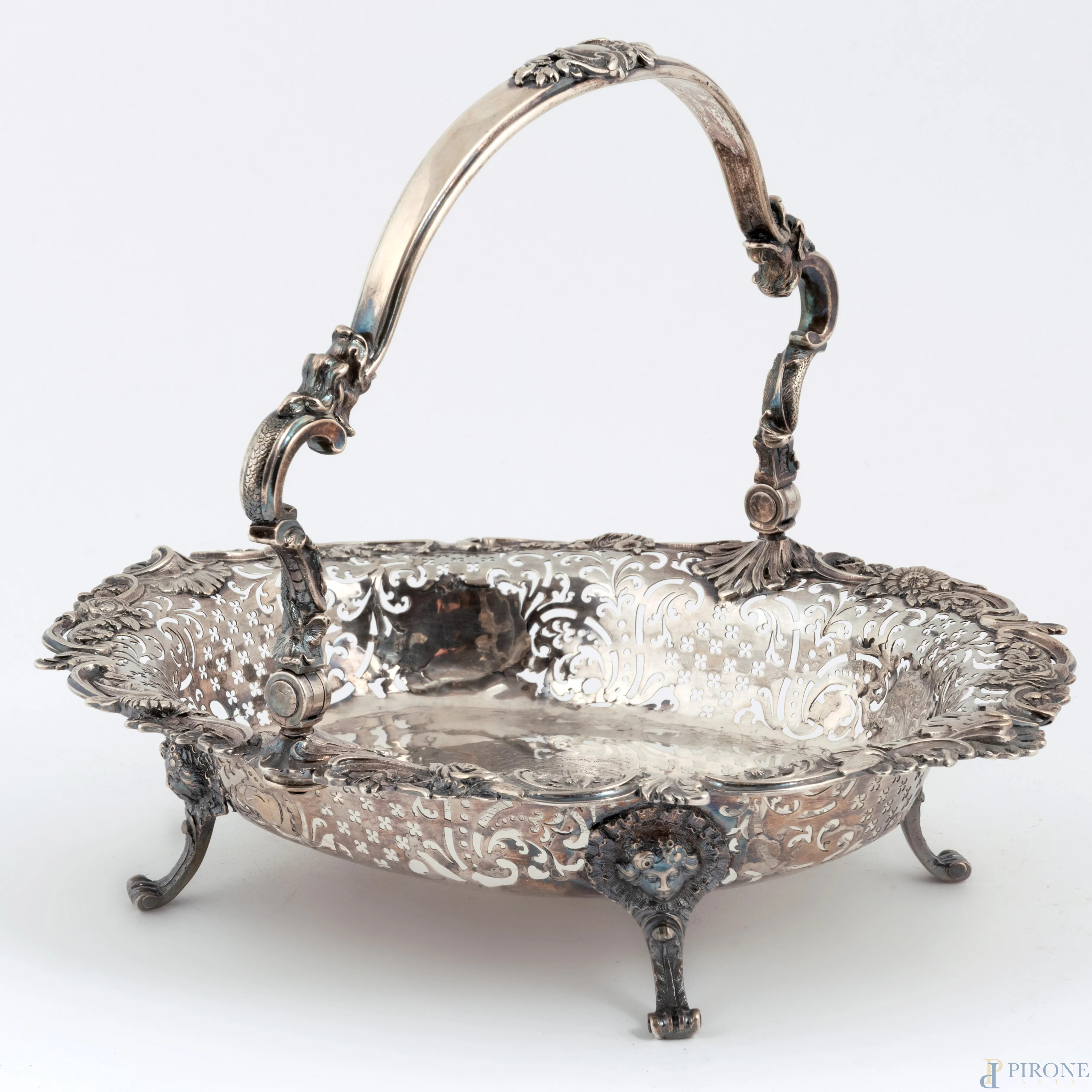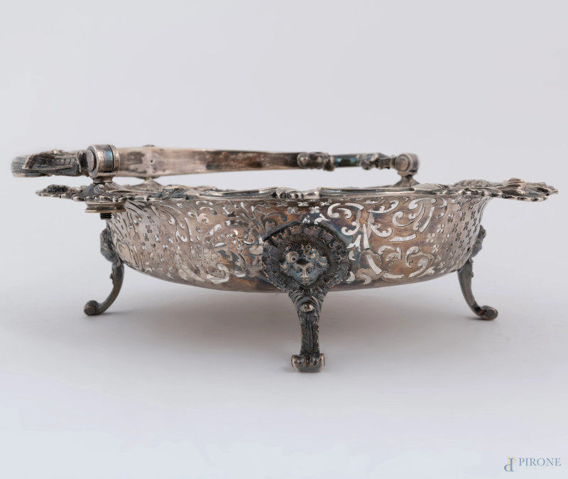 Cestino in argento cesellato e traforato a motivi floreali e vegetali, cm 29,5x32x27, peso gr 1240