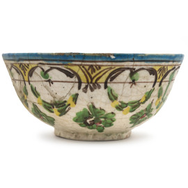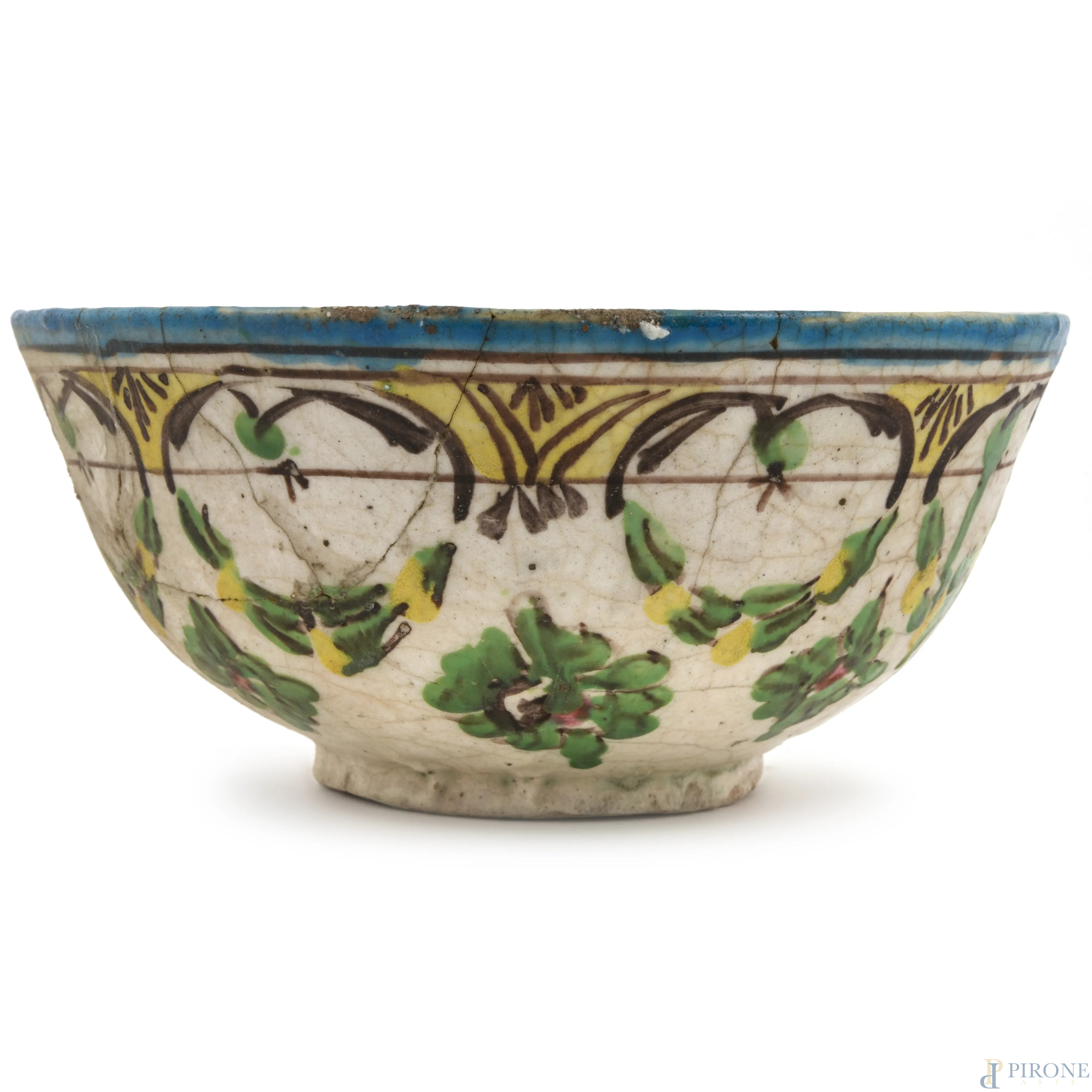 Ciotola in maiolica decorata con teoria di festoni e mazzetti di fiori, XIX-XX secolo, cm 10x22, (restauri, scalfiture, difetti)