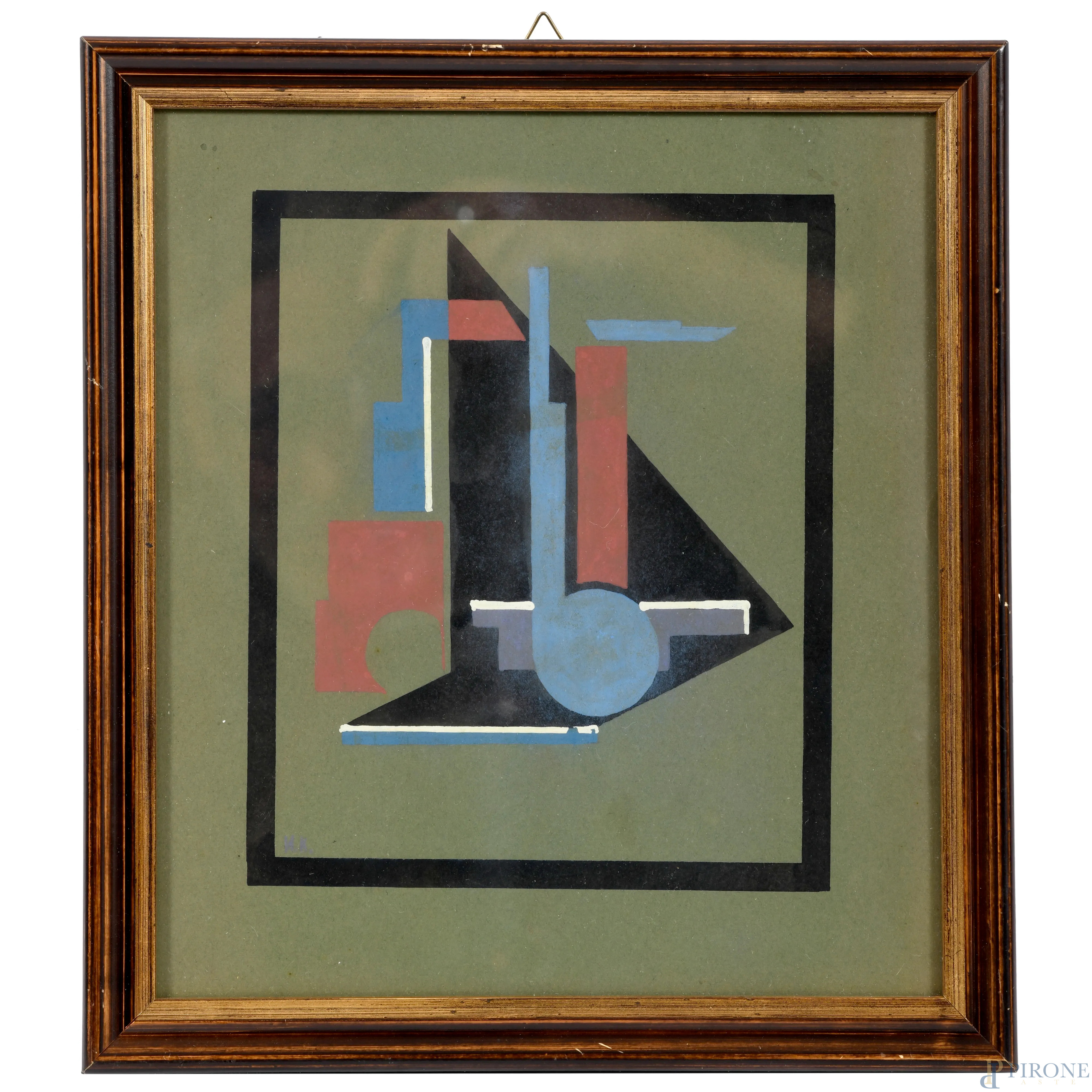 Composizione suprematista, XX secolo, tecnica mista su carta, cm 25x22, entro cornice (ondulazioni della carta e tracce di umidità)