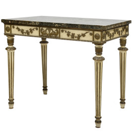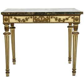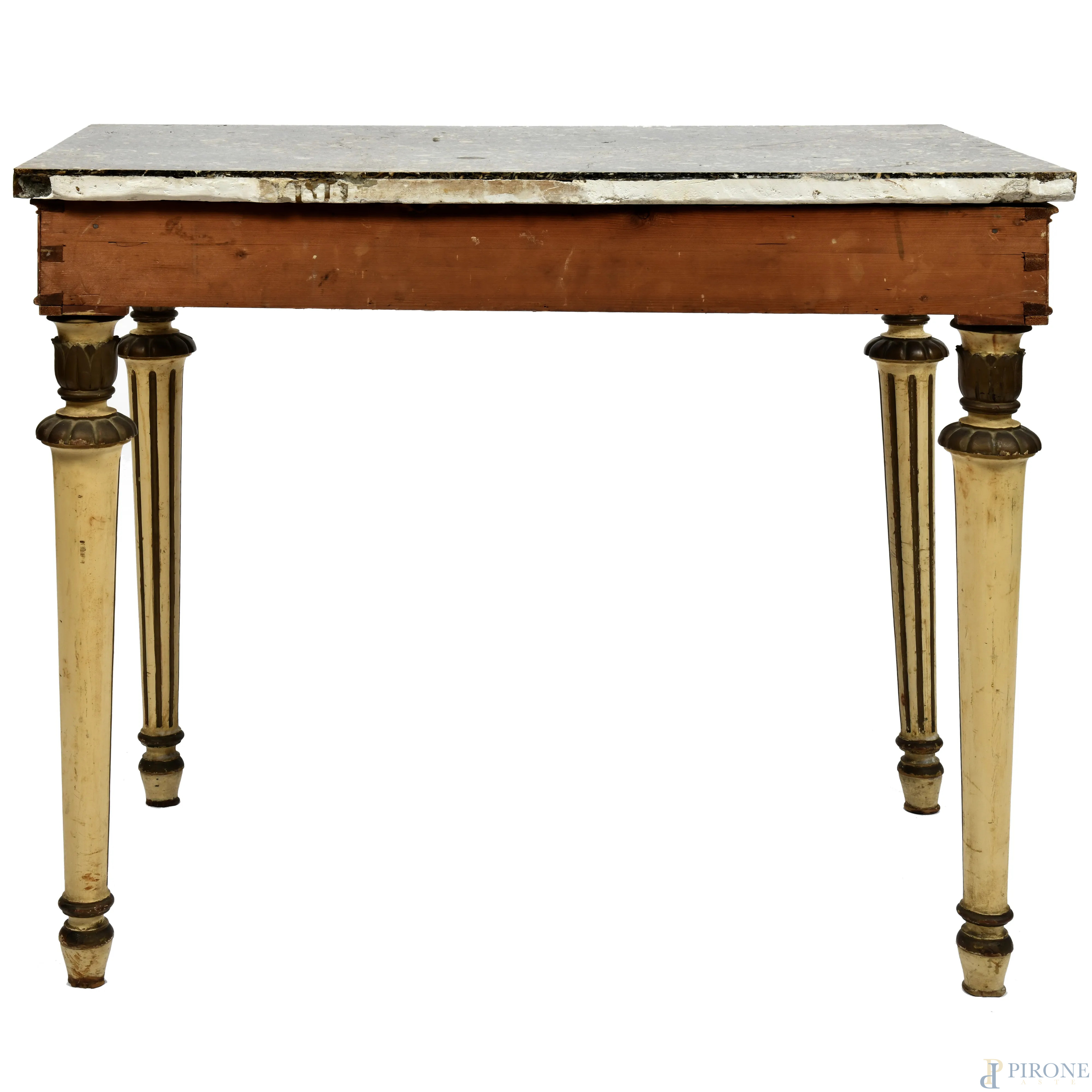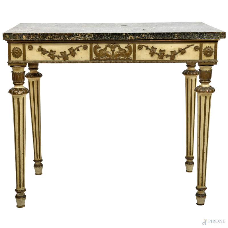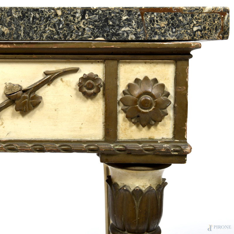 Consolle in stile Luigi XVI in legno laccato e dorato con piano in marmo. Decori a rilievo raffiguranti grifoni e fiori lungo il profilo. XX secolo, cm 85x101,5x63,5, (segni di usura, scalfiture, difetti)