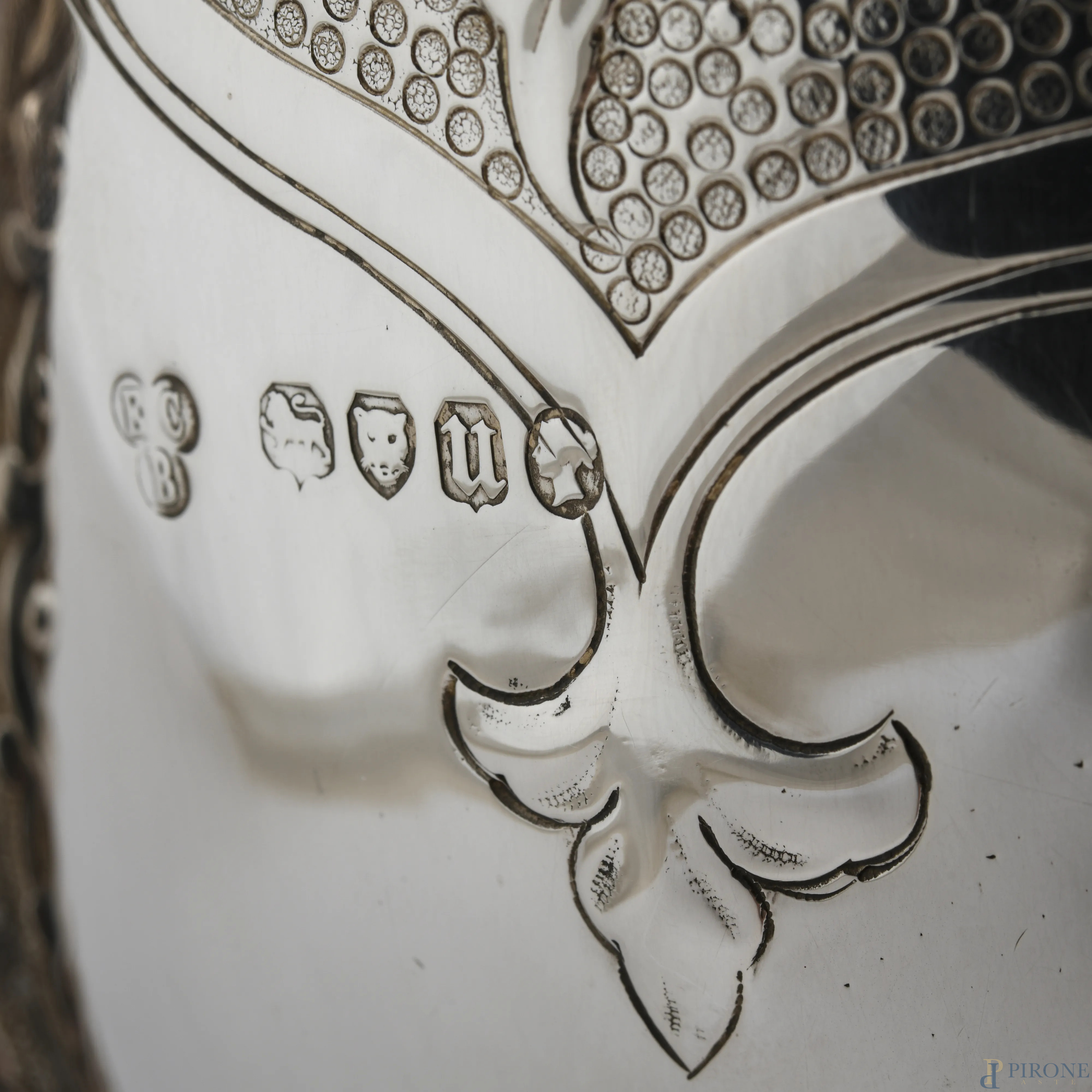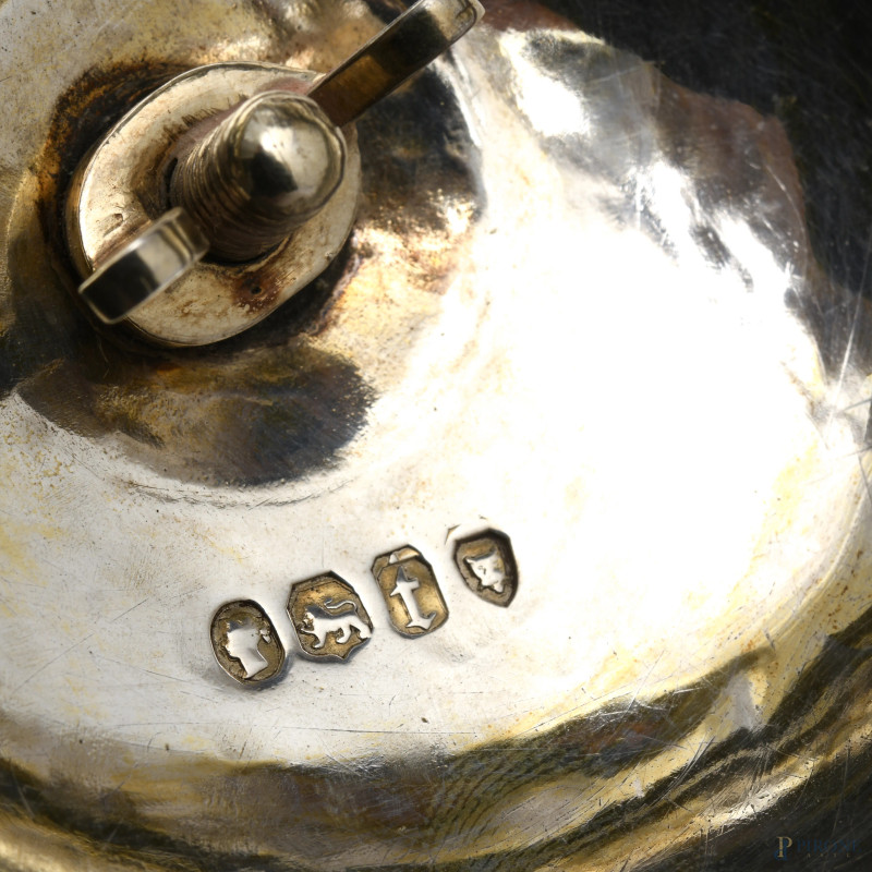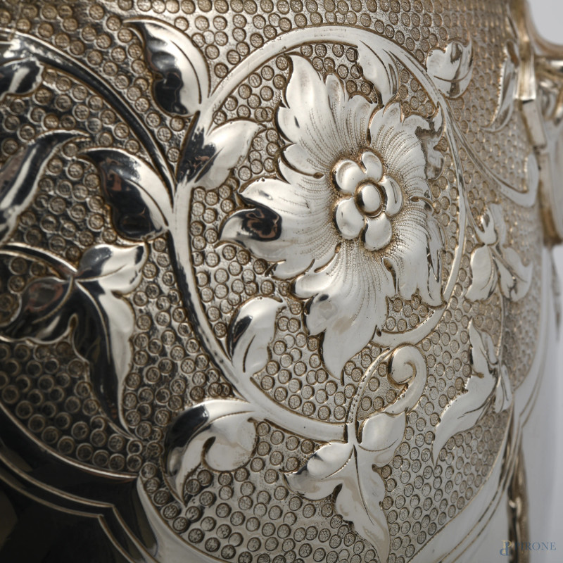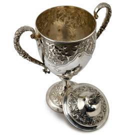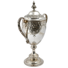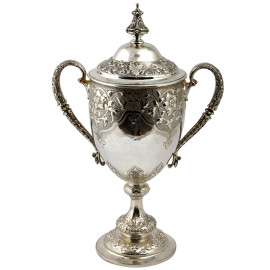 Coppa a doppia presa in argento 925/000 finemente cesellato con coperchio. Inghilterra, Richards & Brown 1875, altezza cm 45,5, peso gr 1700