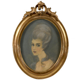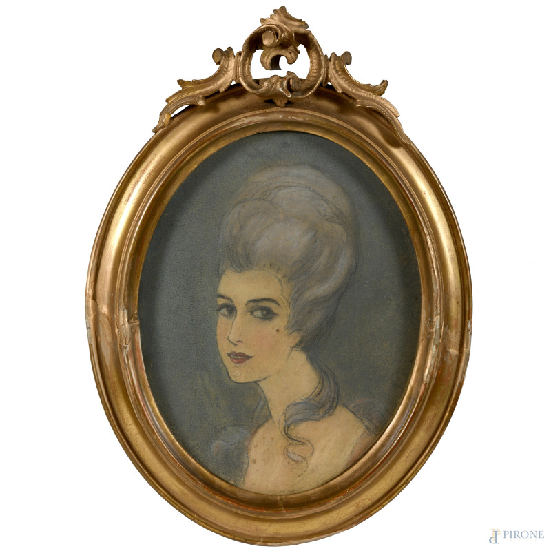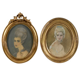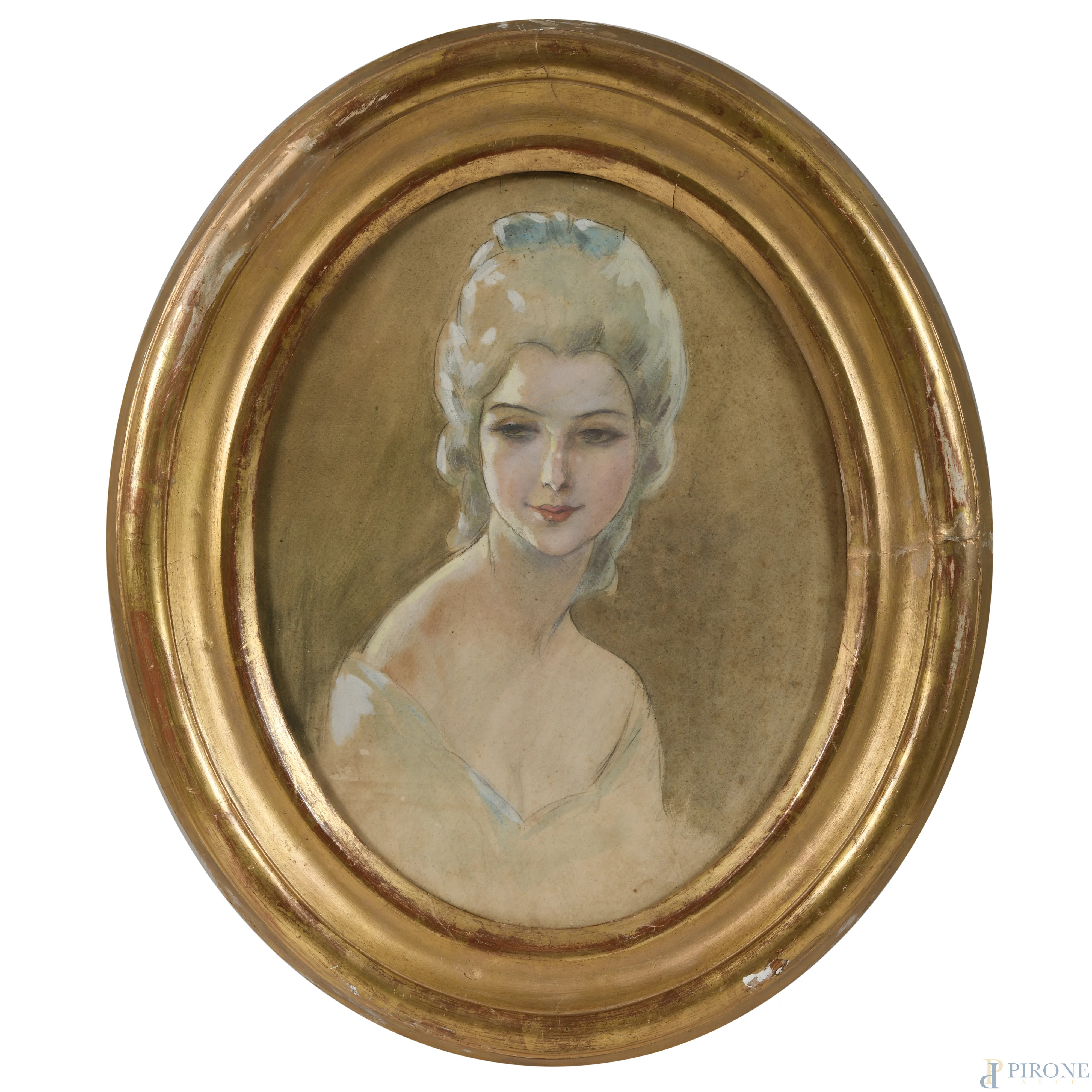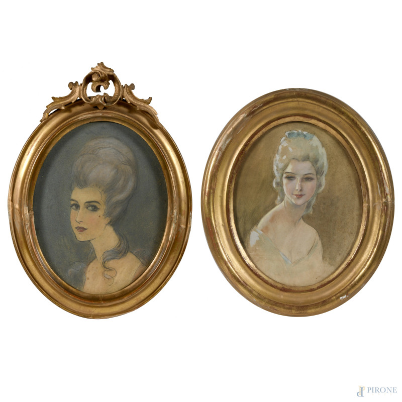 Coppia di acquerelli su carta a serto ovale raffiguranti ritratti femminili, cm 28x22 entro cornice, (tracce di umidità, foxing, difetti)