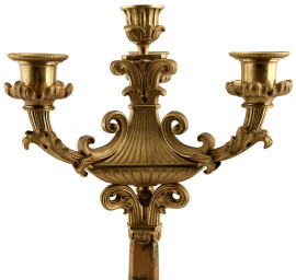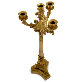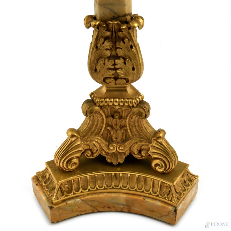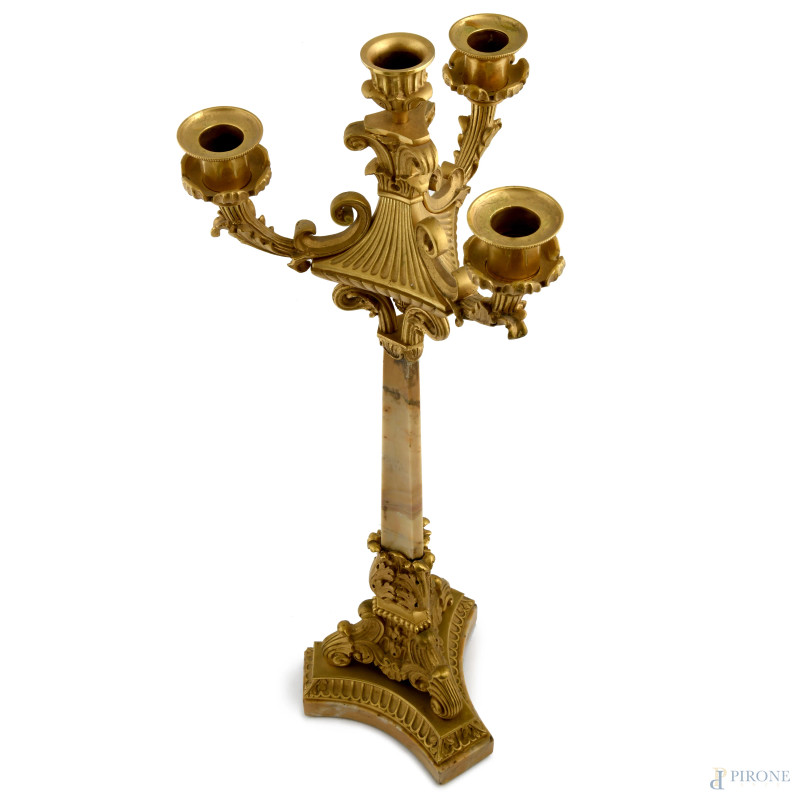 Coppia di candelabri in bronzo finemente cesellato a cinque luci con fusto in marmo, XX secolo, altezza cm 61,5, (rotture, scalfiture, restauri)