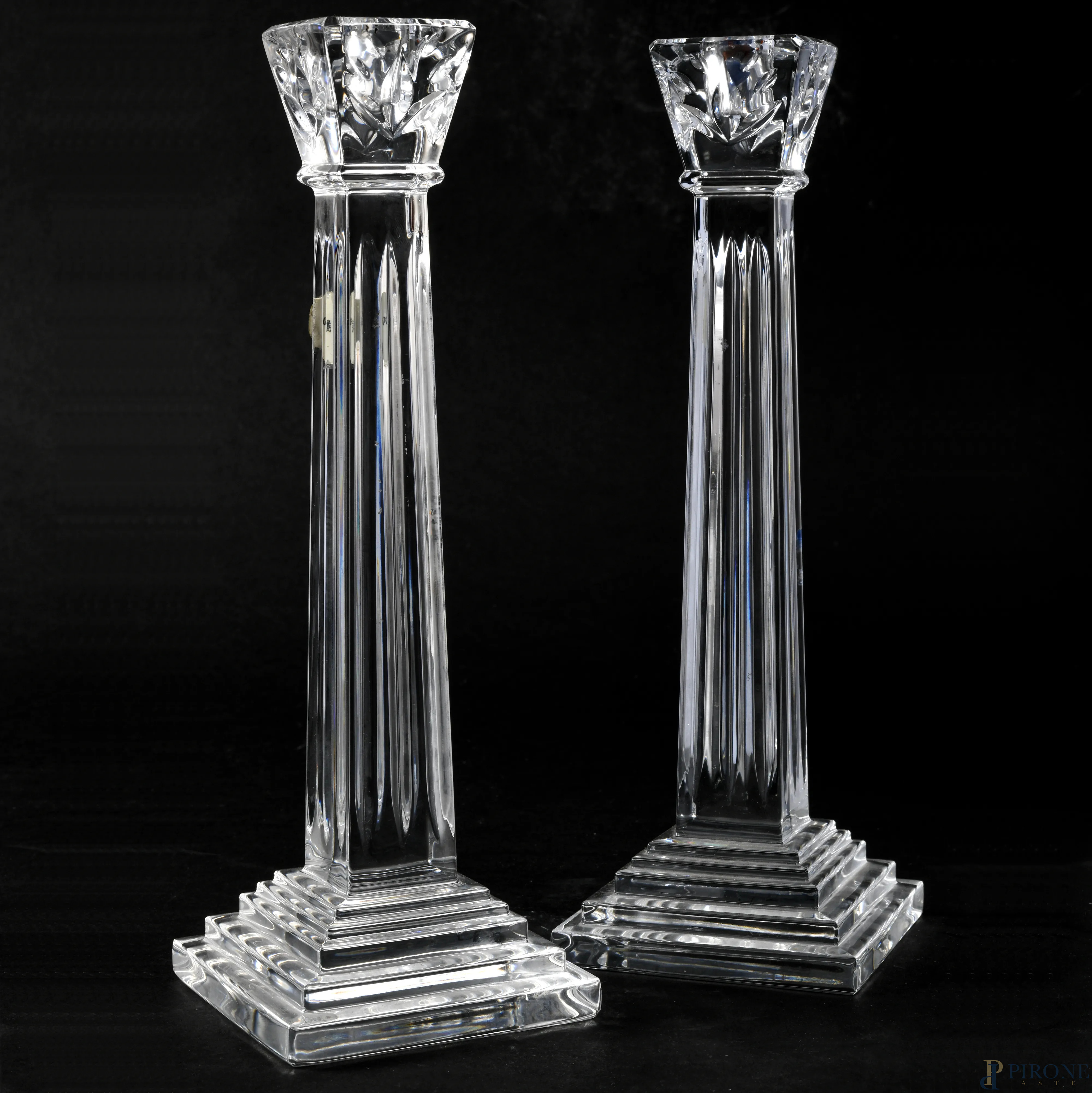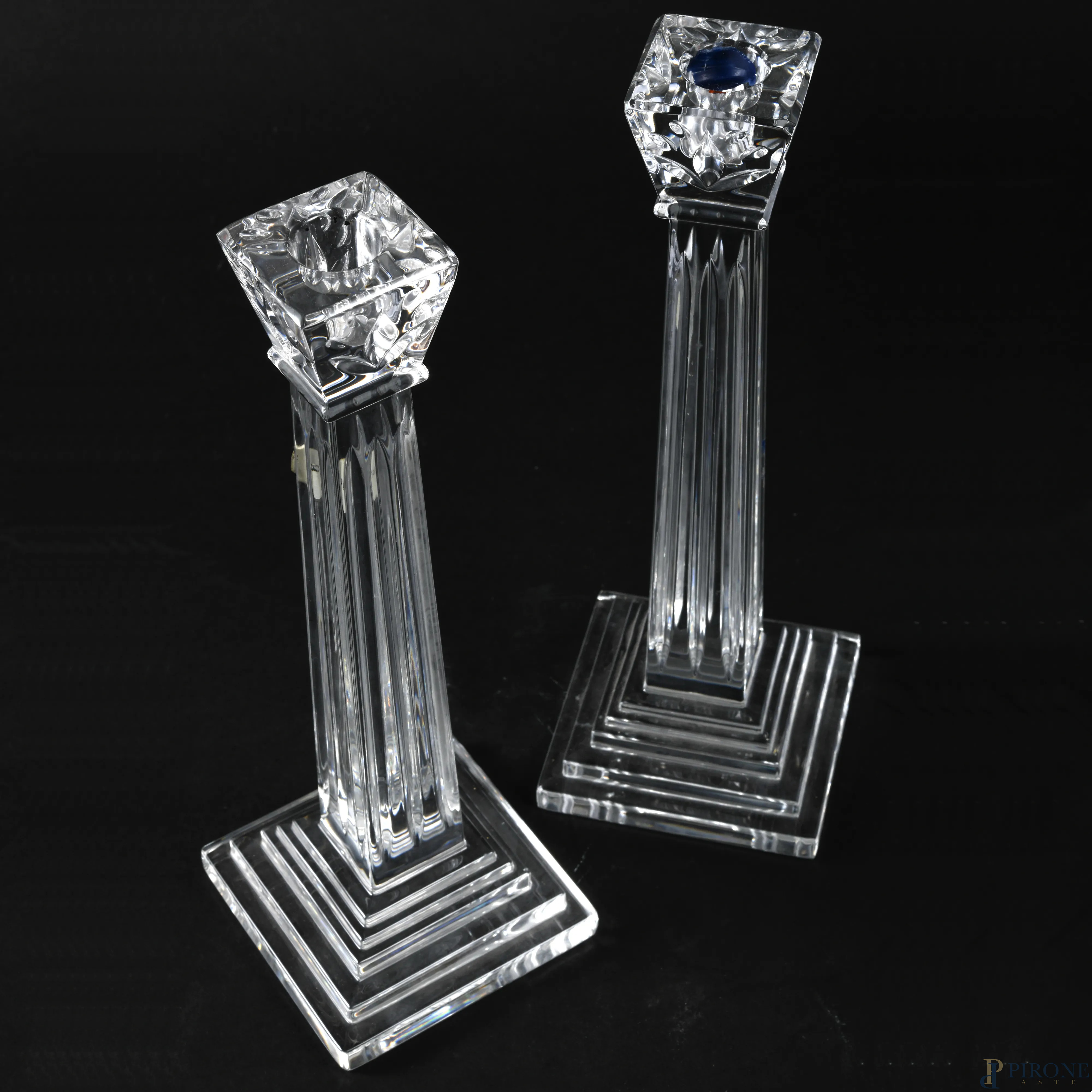 Coppia di candelieri in cristallo a guisa di colonna classica, XX secolo, cm 28
