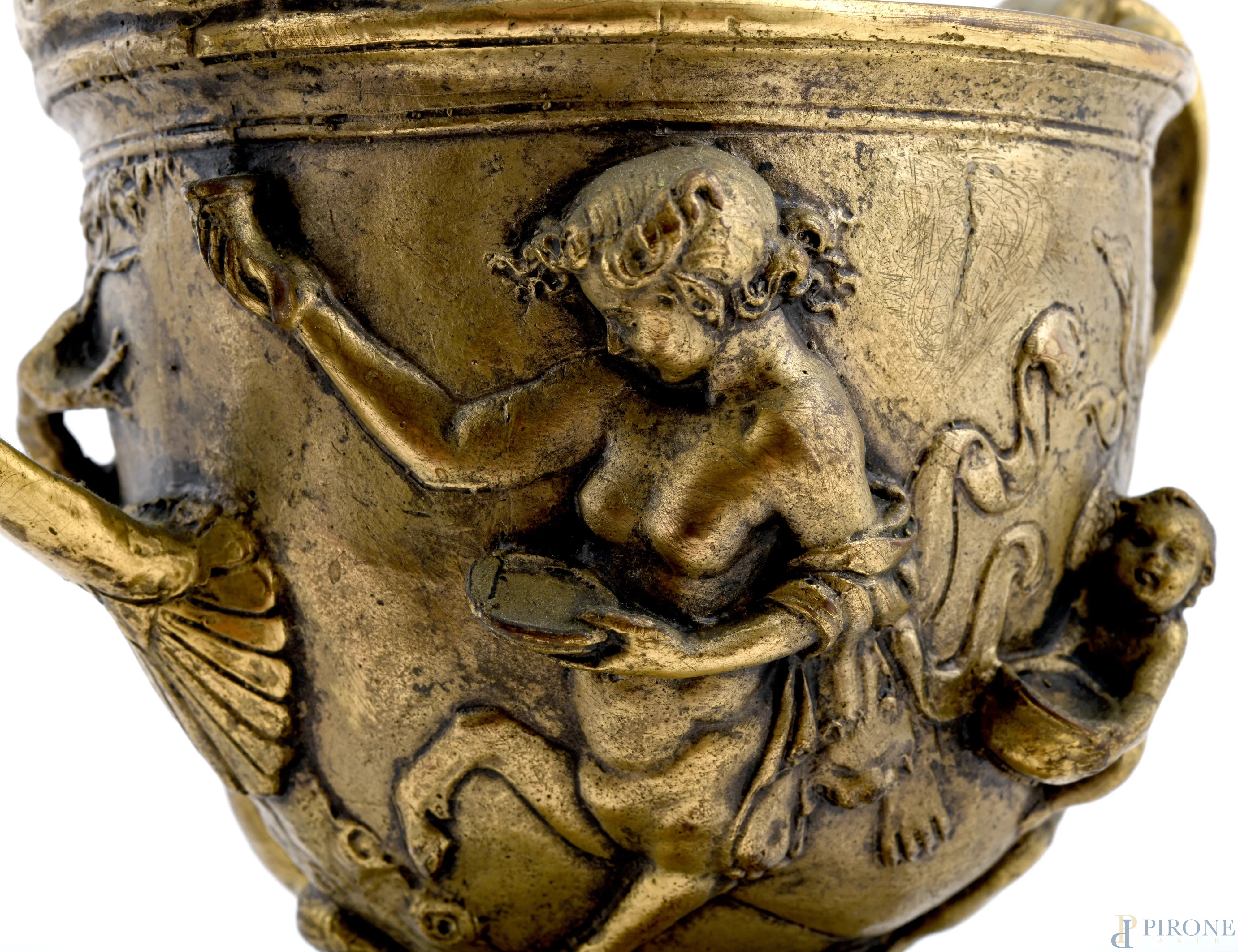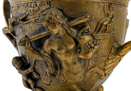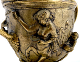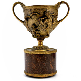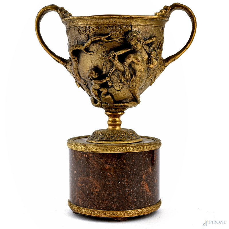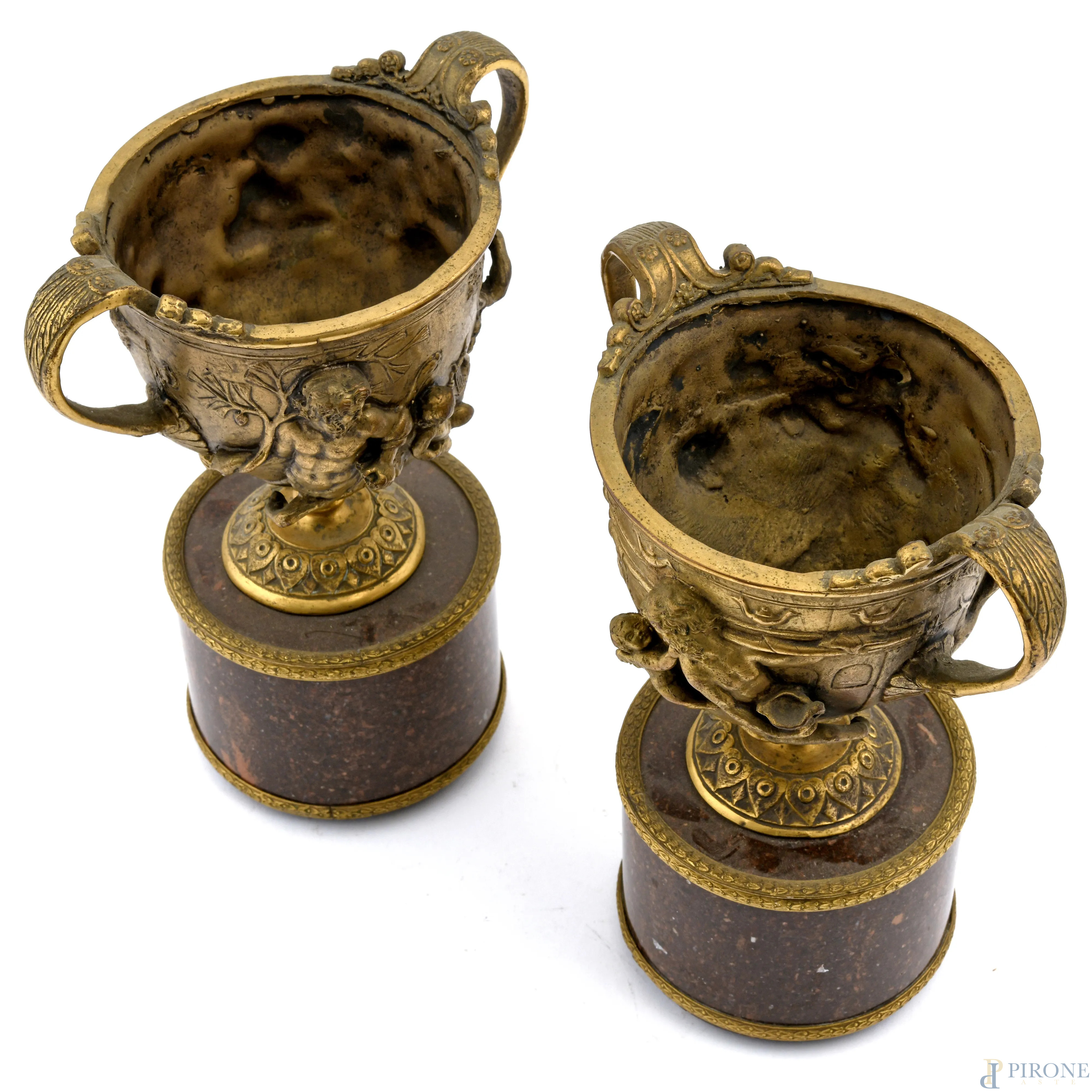 Coppia di coppe in bronzo cesellato con scene mitologiche a rilievo su base in marmo, XX secolo, altezza massima cm 22, (segni di usura)