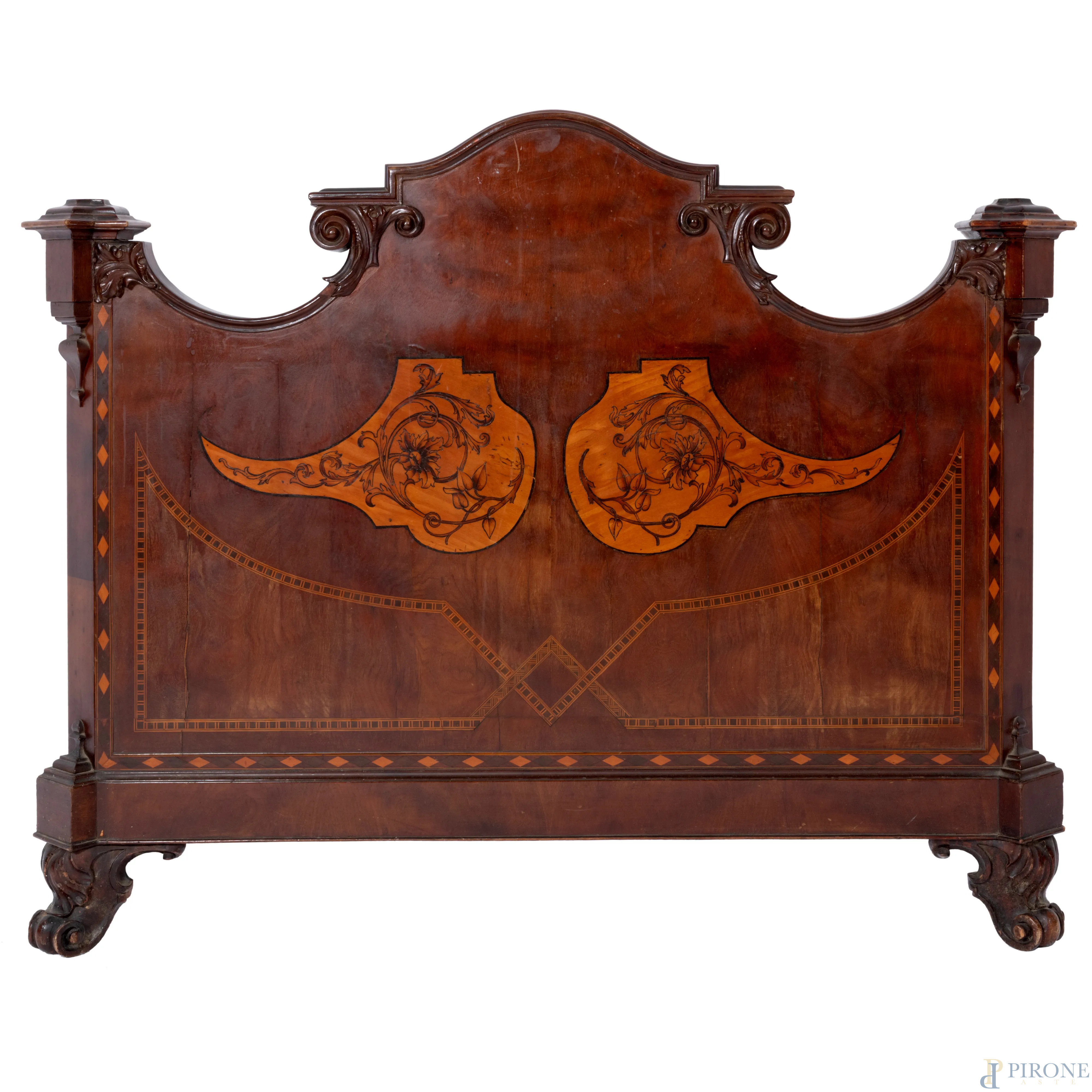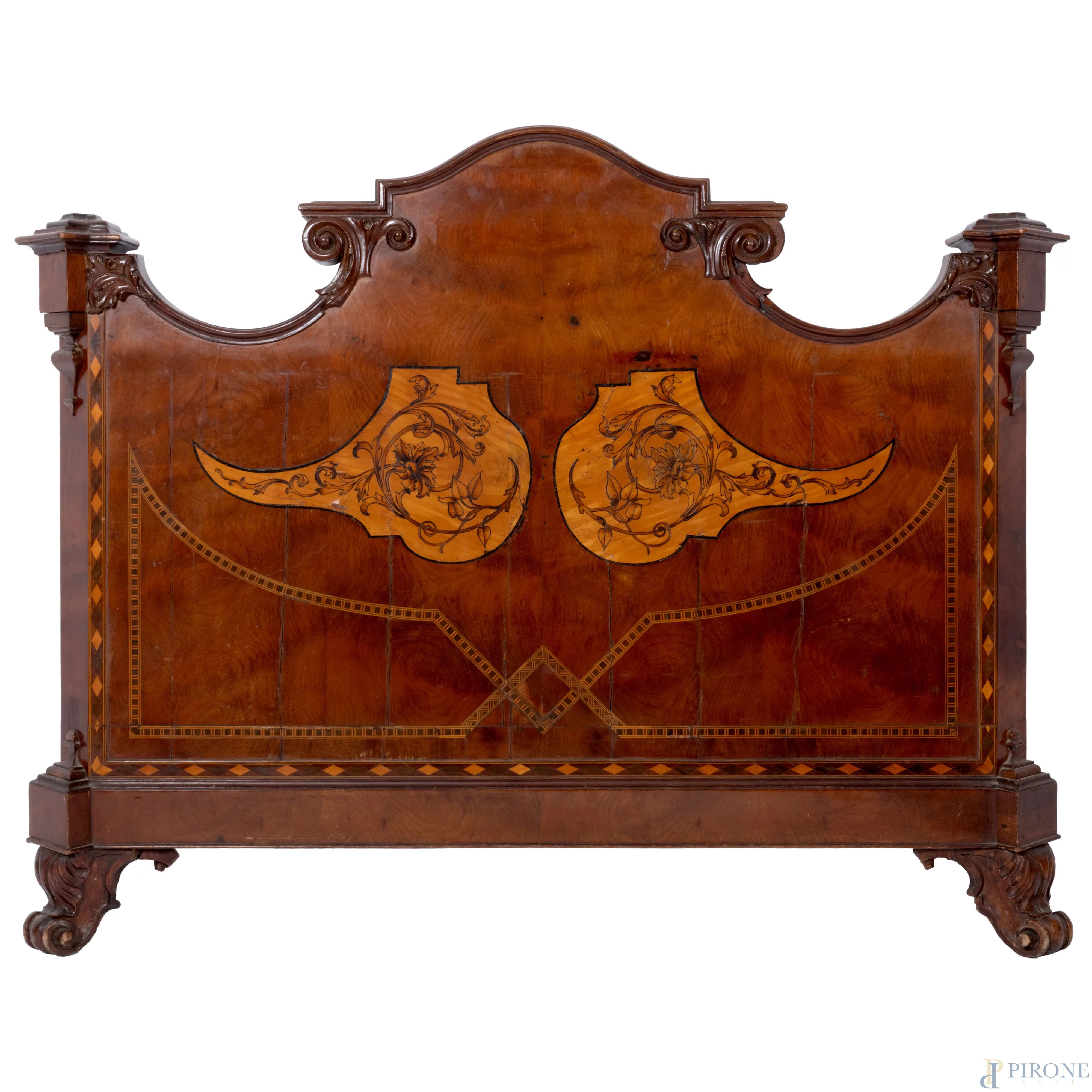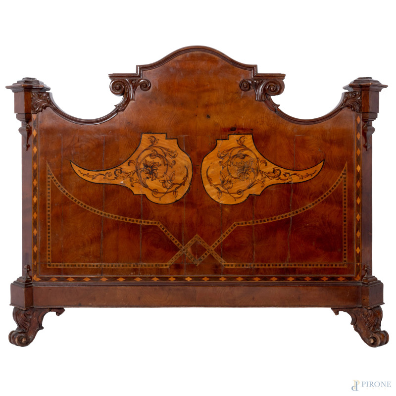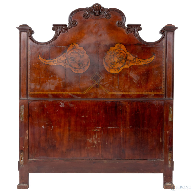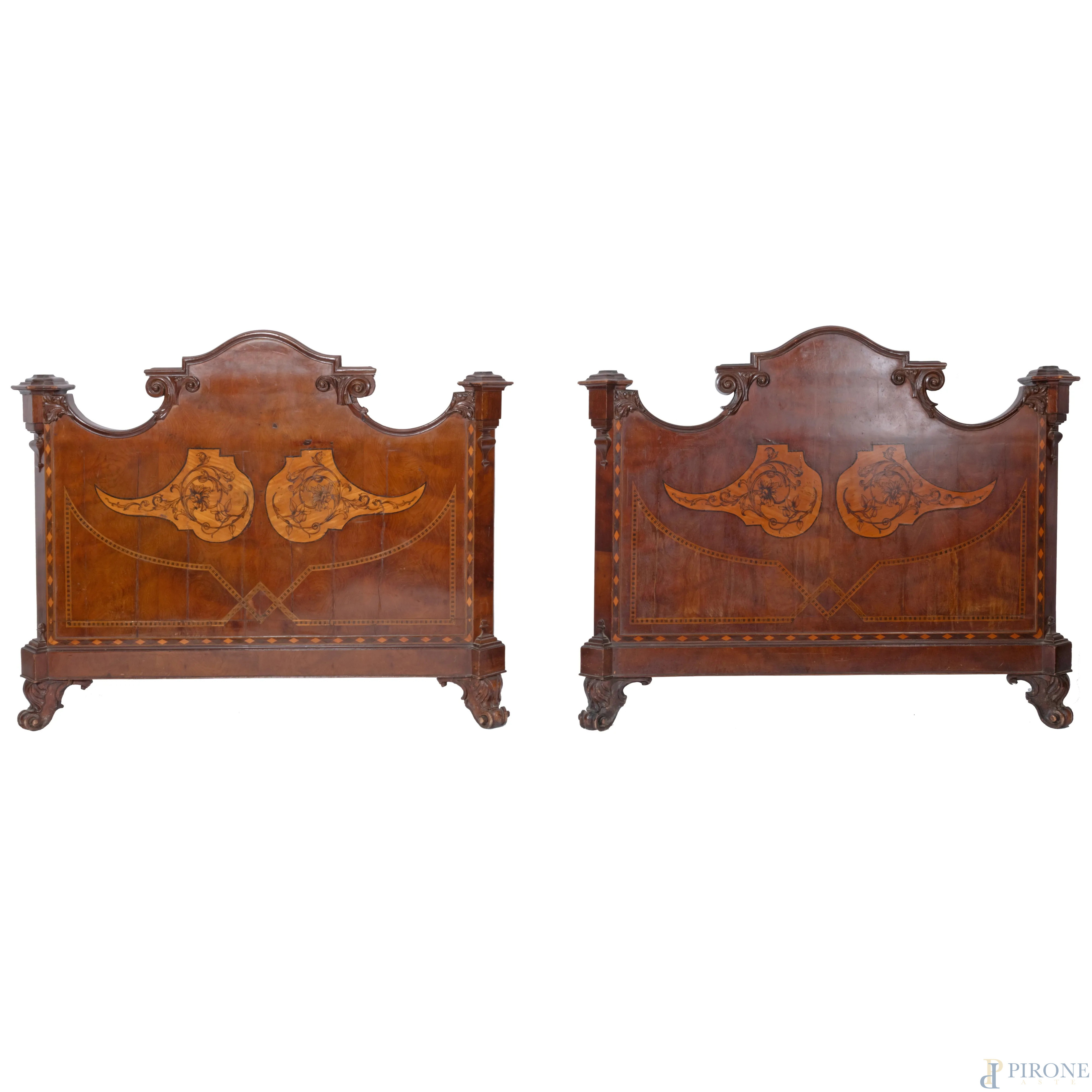 Coppia di giroletto singolo in noce impiallacciati e intasiati in varie essenze, XX secolo, testiera cm 130x110 (segni di usura, difetti)